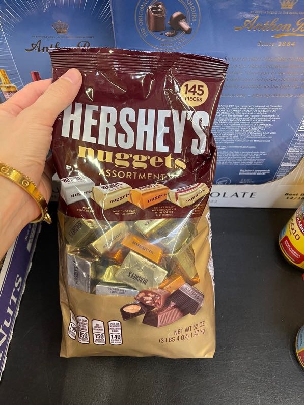 🍃🍃国内还没有发行这款巧克力哦~满满的坚果夹心,😋想不好吃也难呀!吃货们别错过,😍😍在洛杉矶超市经常有人满车的搬运这个巧克力,四种口味:🌿牛奶巧克力;🌿杏仁牛奶巧克力;🌿杏仁黑巧克力;🌿太妃杏仁巧克力,大概145粒,一袋有1470克!