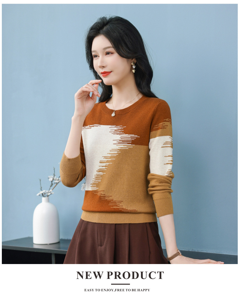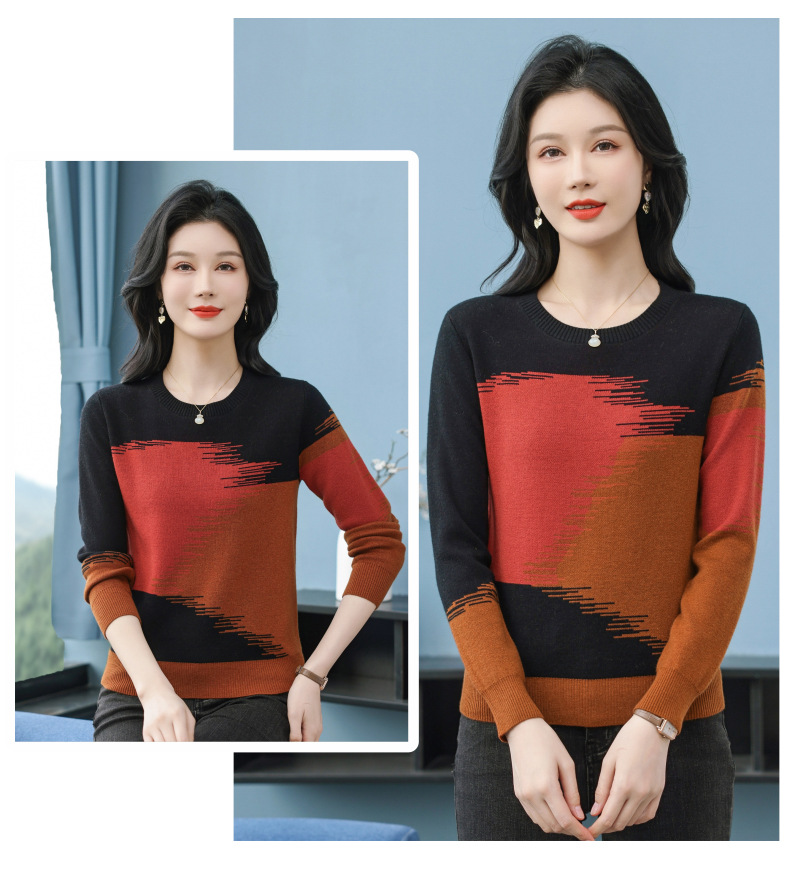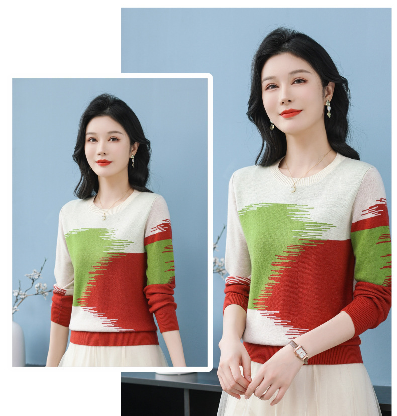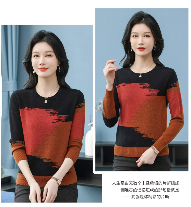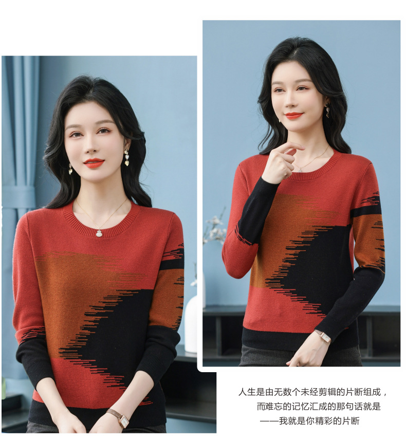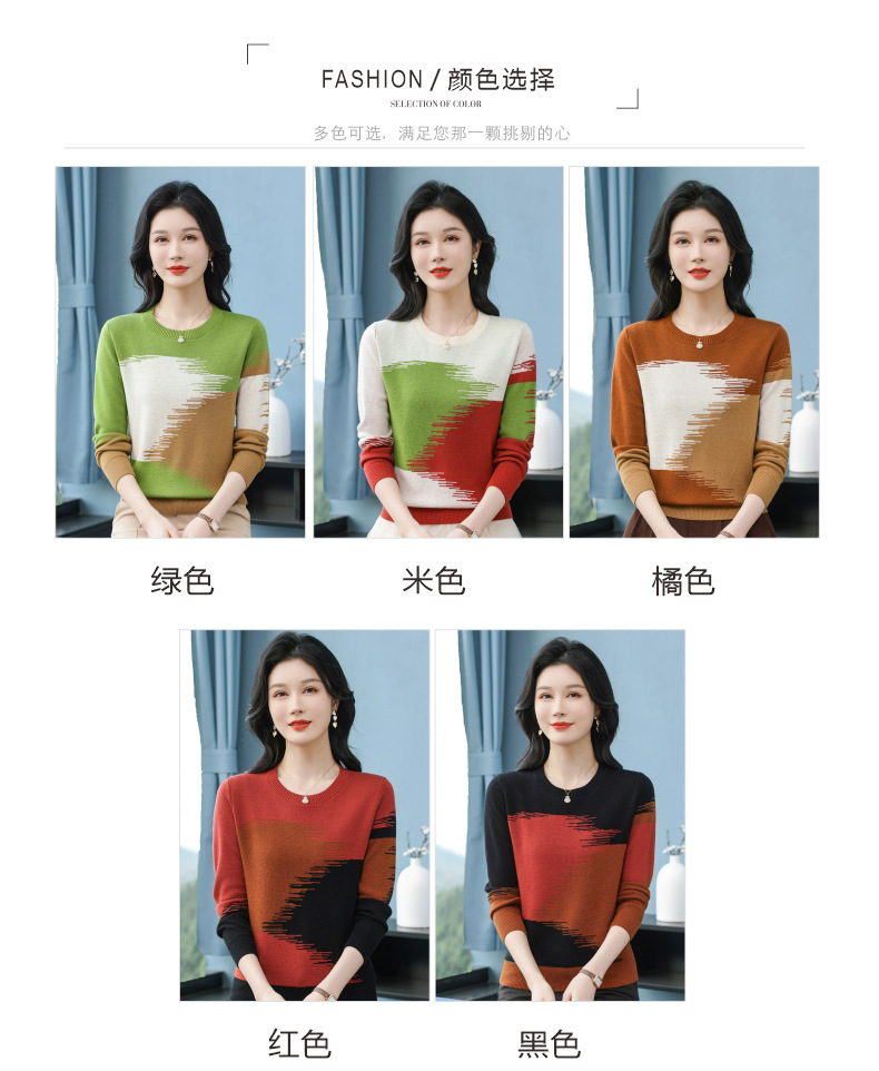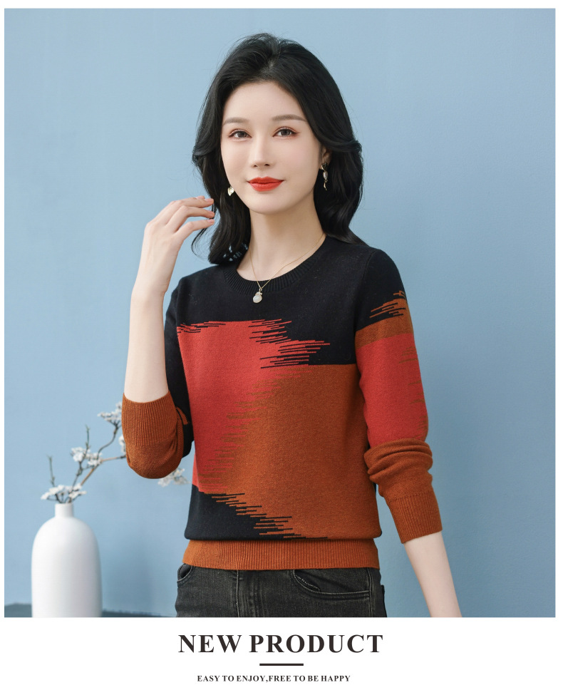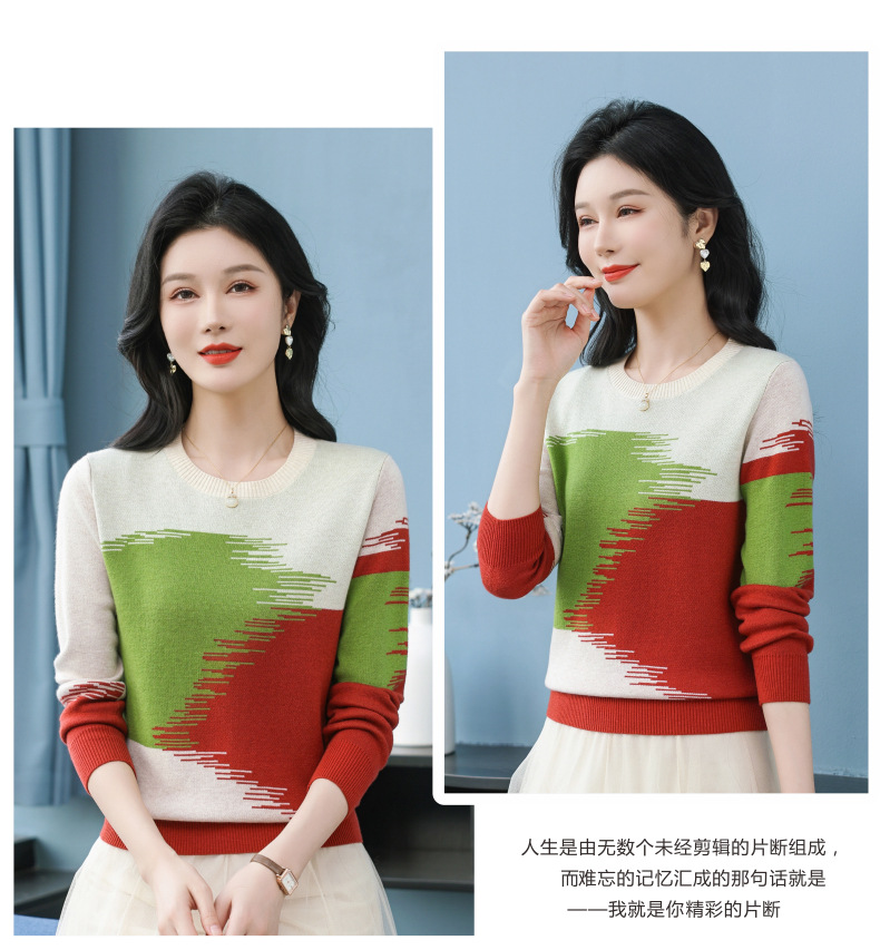 CC-QQH-9182时尚圆领拼色长袖毛衣女士2025年春秋季宽松设计感针织打底衫上衣