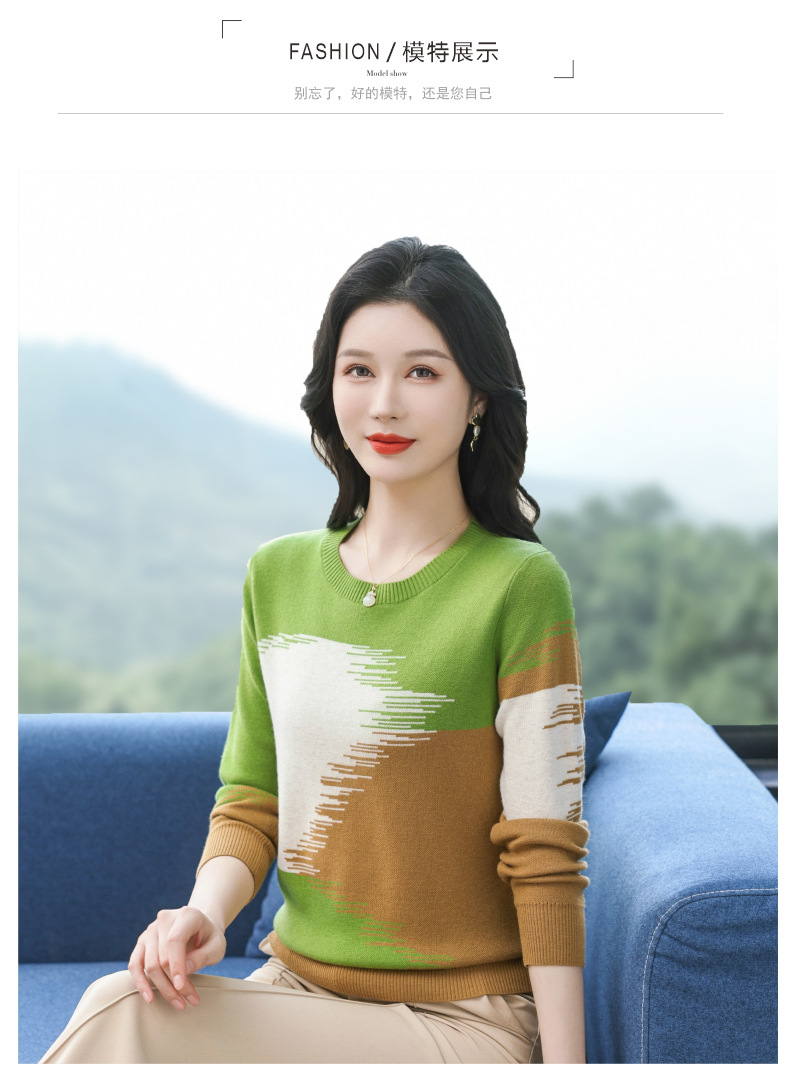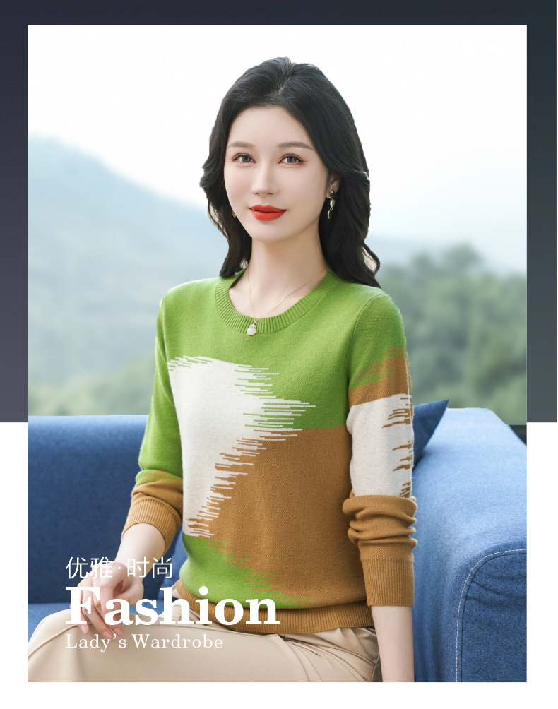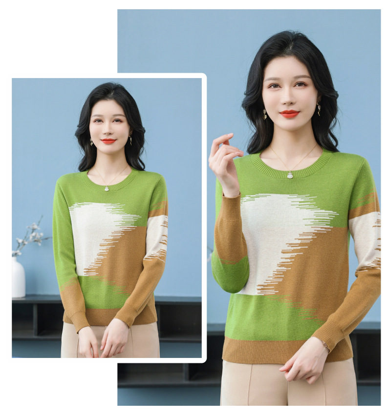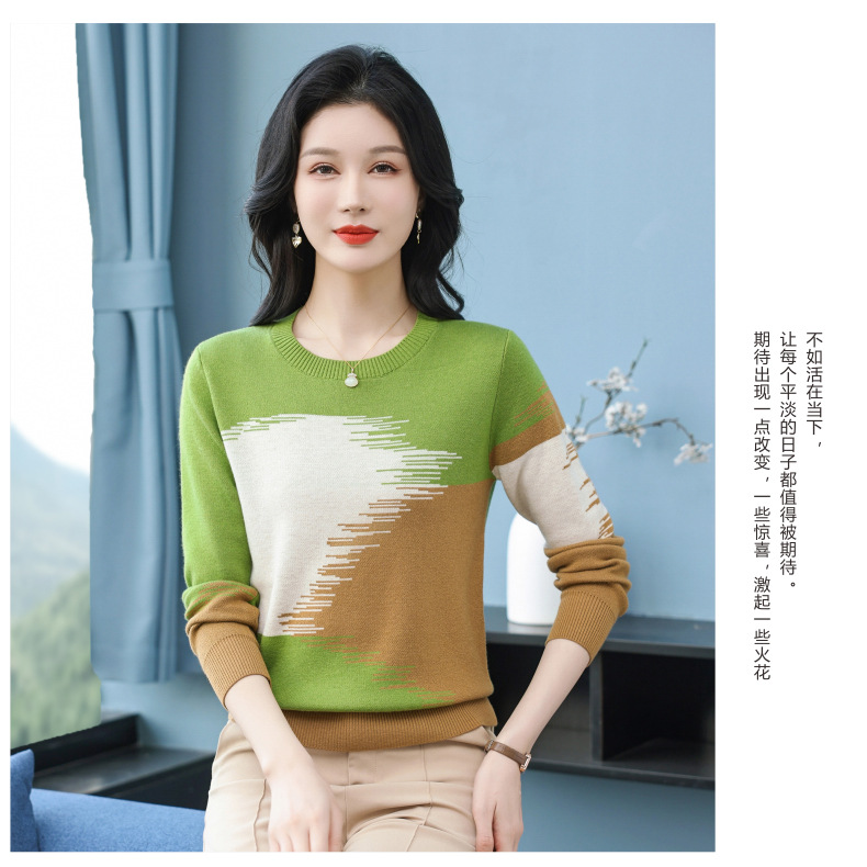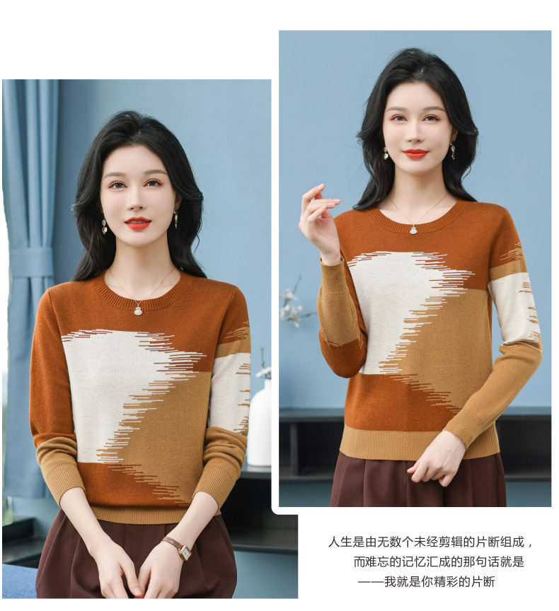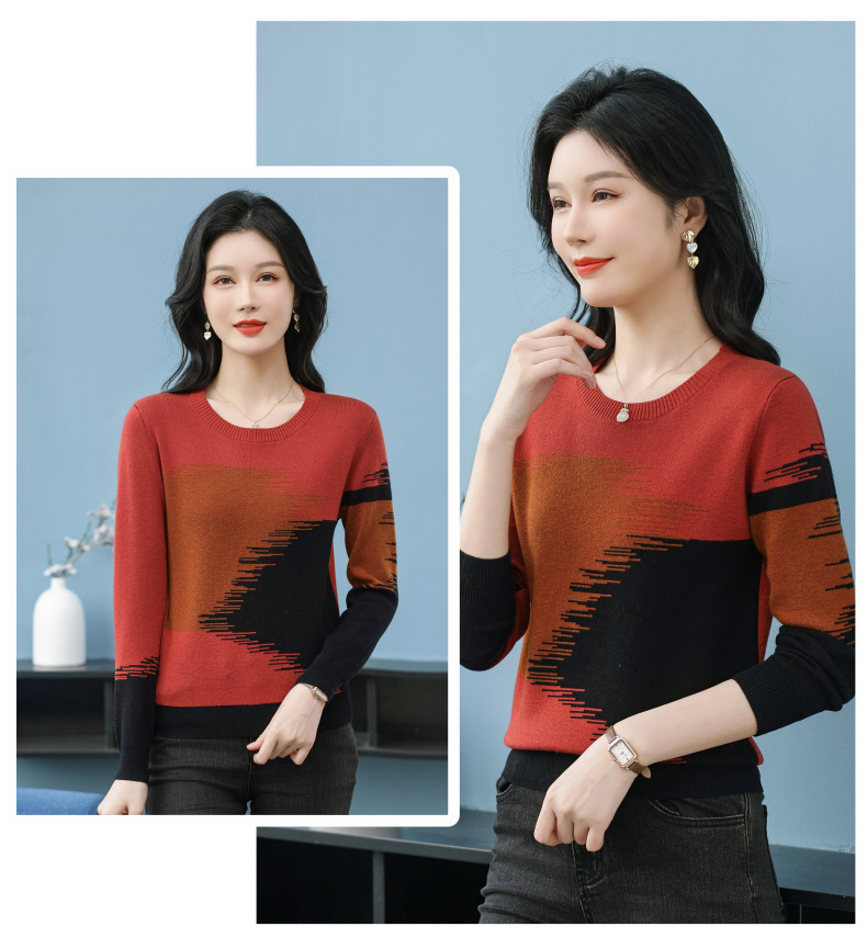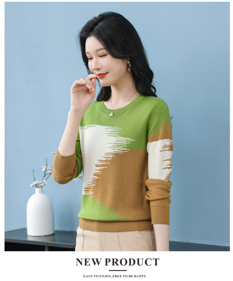 CC-QQH-9182时尚圆领拼色长袖毛衣女士2025年春秋季宽松设计感针织打底衫上衣