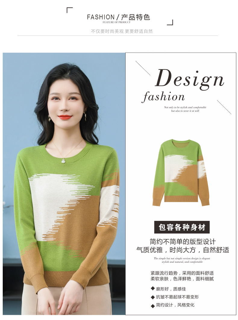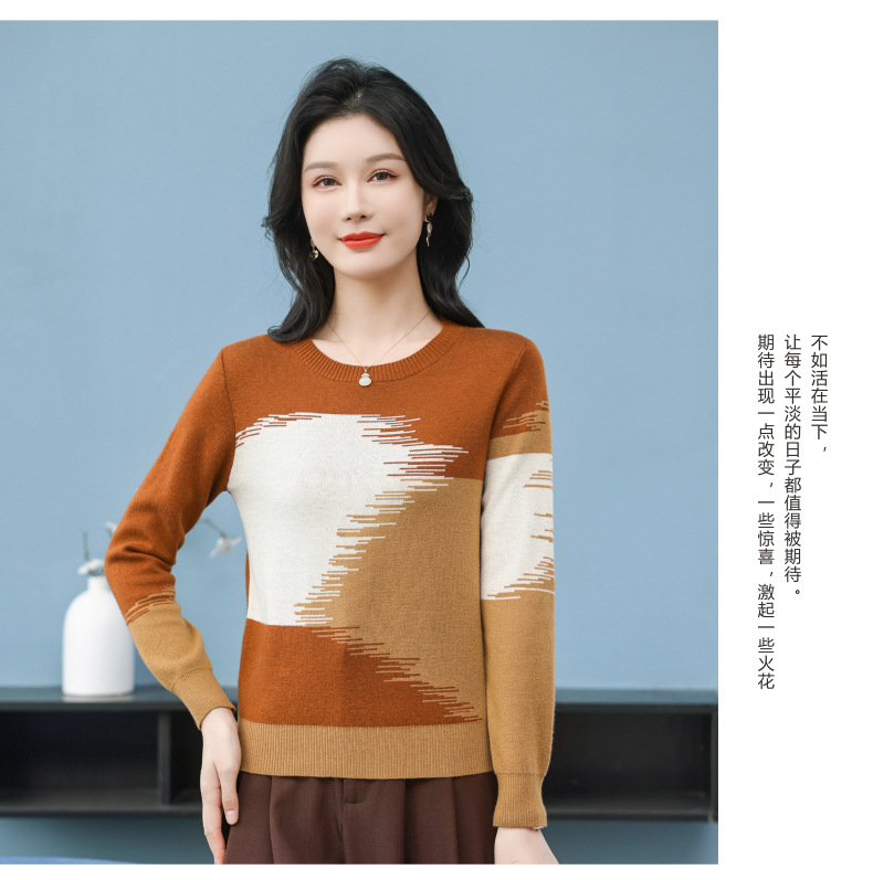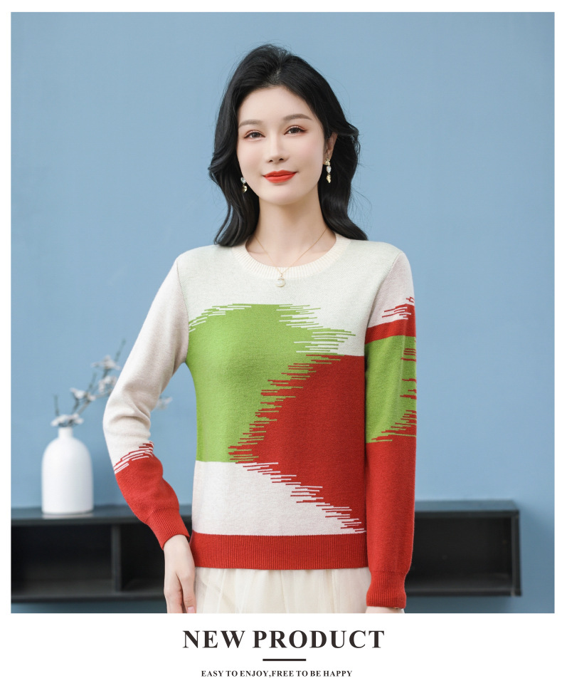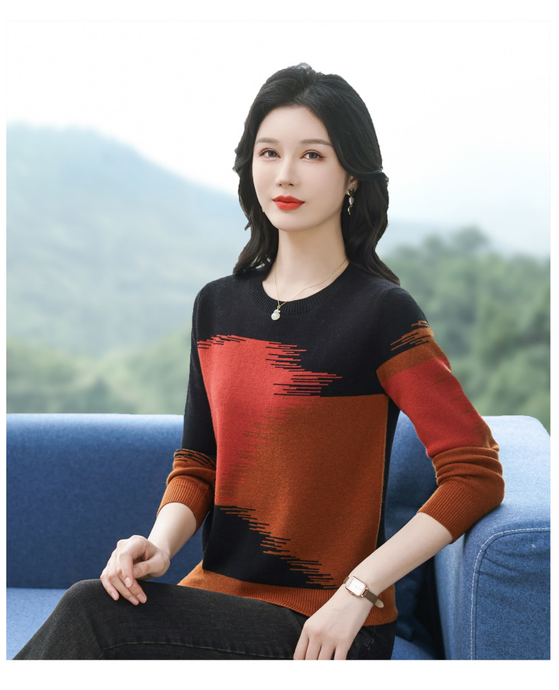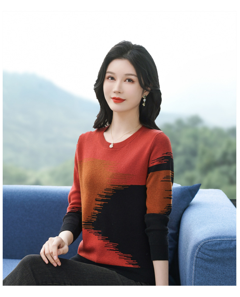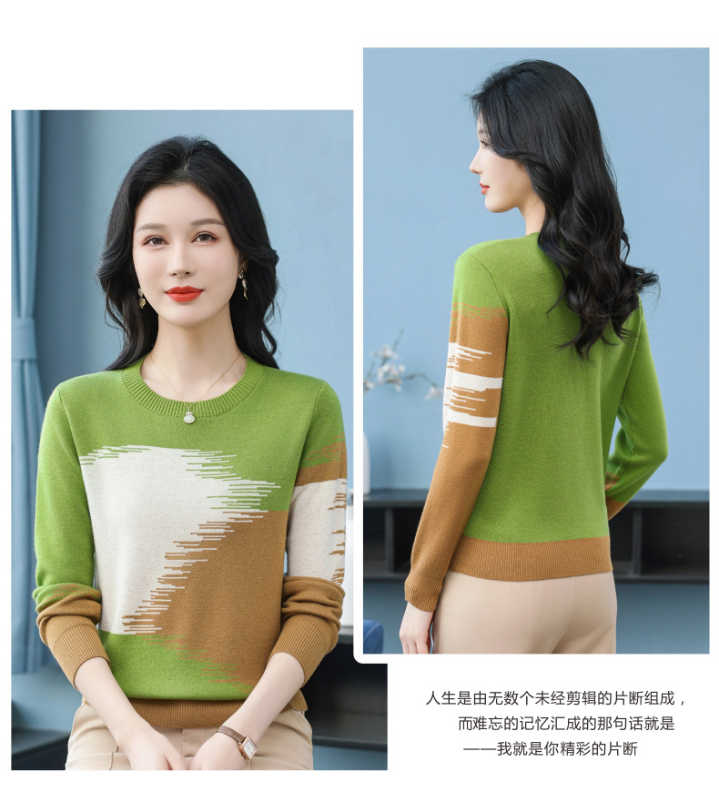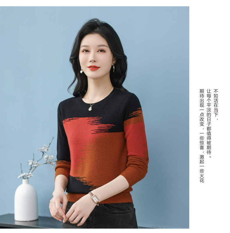 CC-QQH-9182时尚圆领拼色长袖毛衣女士2025年春秋季宽松设计感针织打底衫上衣
