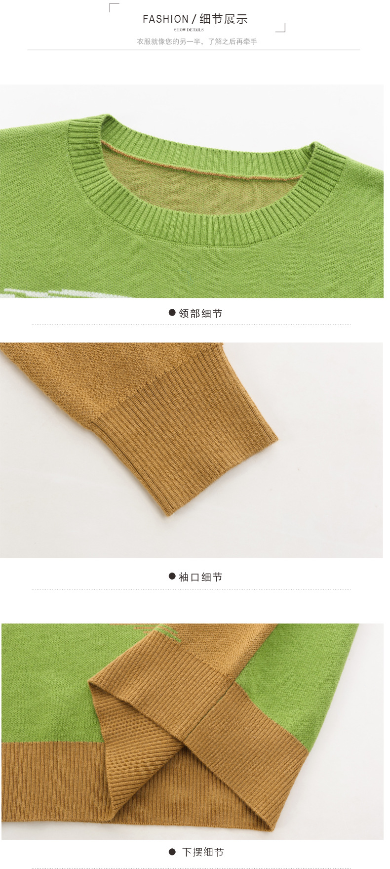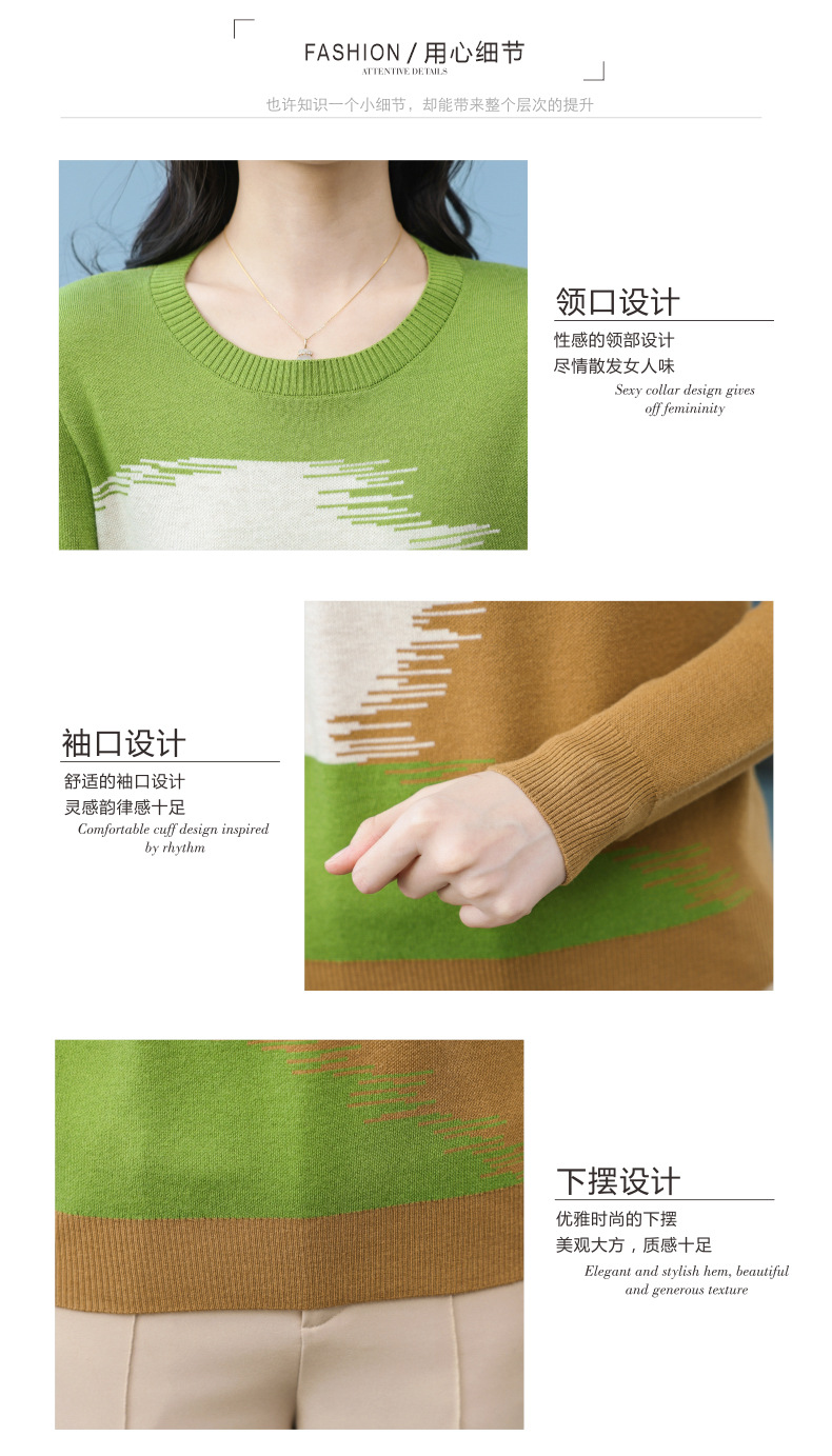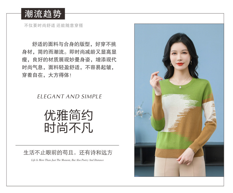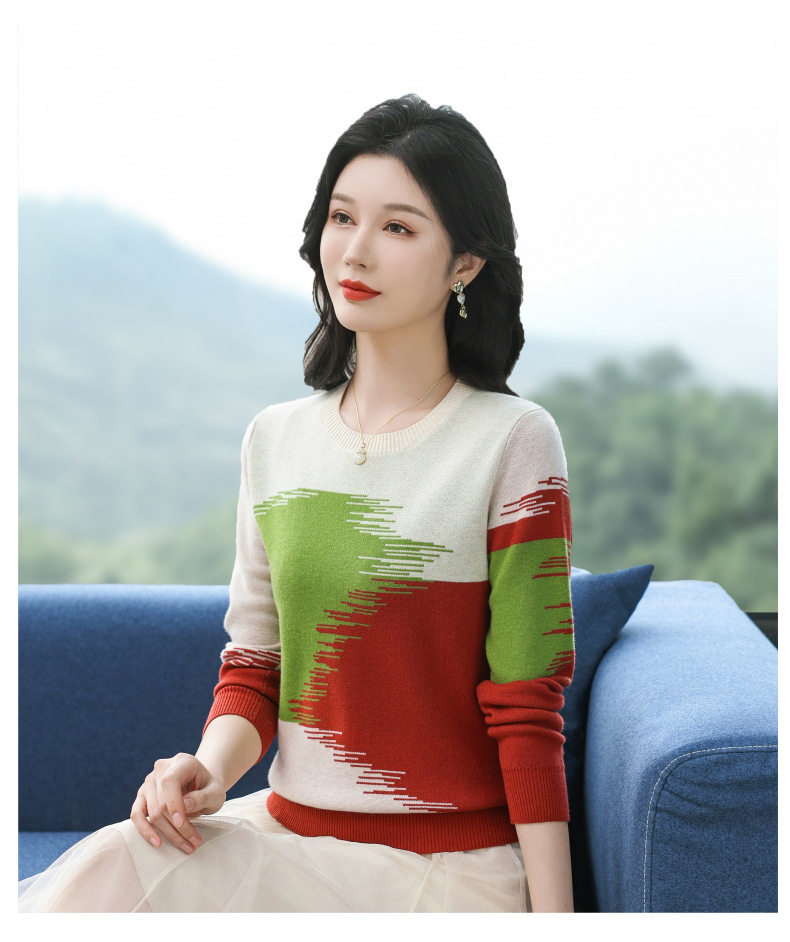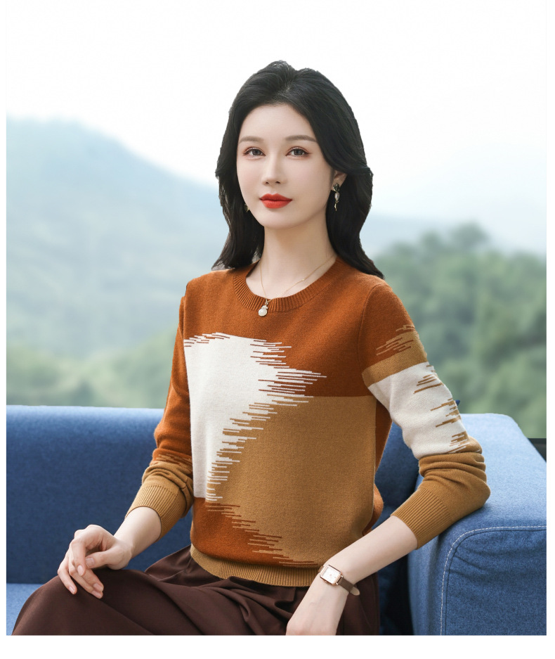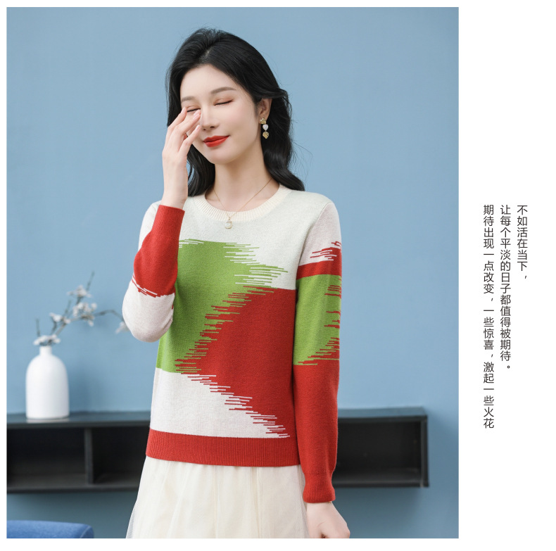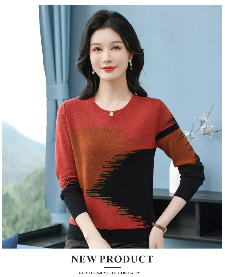 CC-QQH-9182时尚圆领拼色长袖毛衣女士2025年春秋季宽松设计感针织打底衫上衣