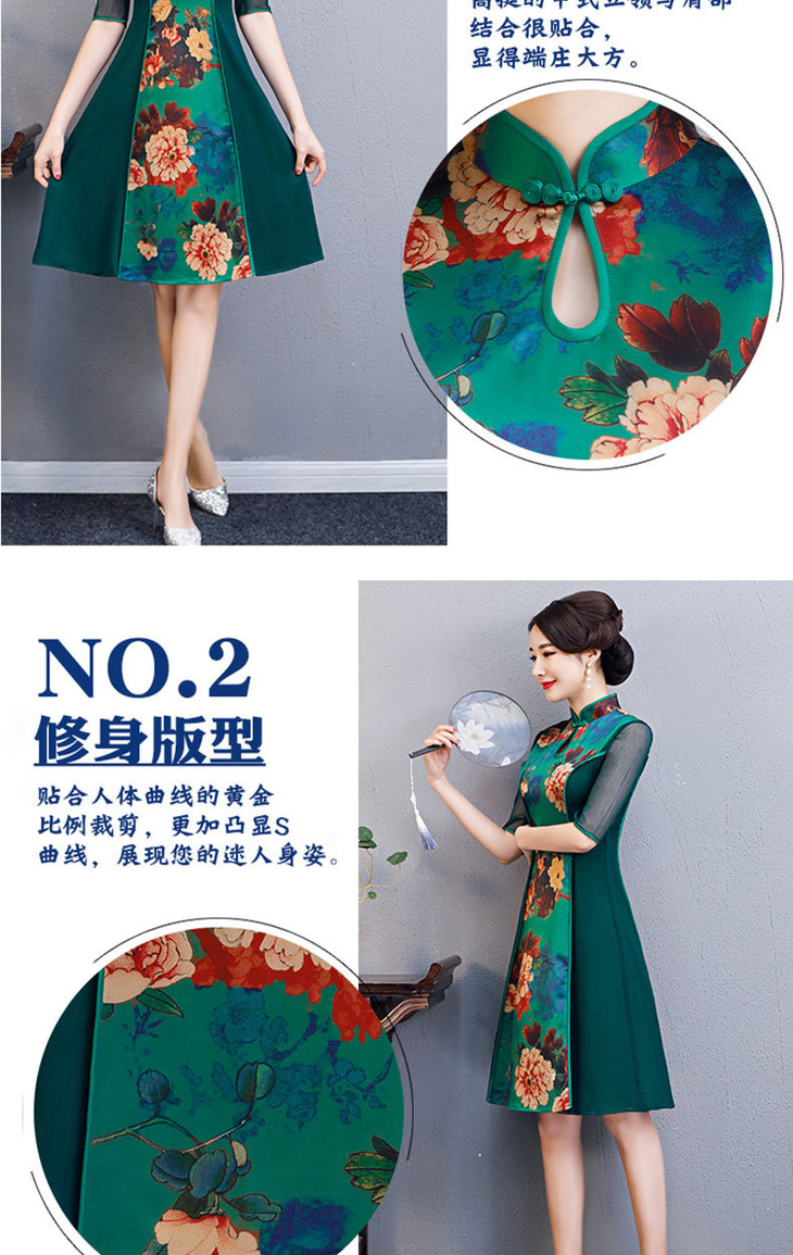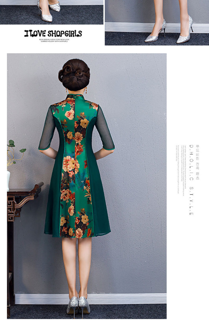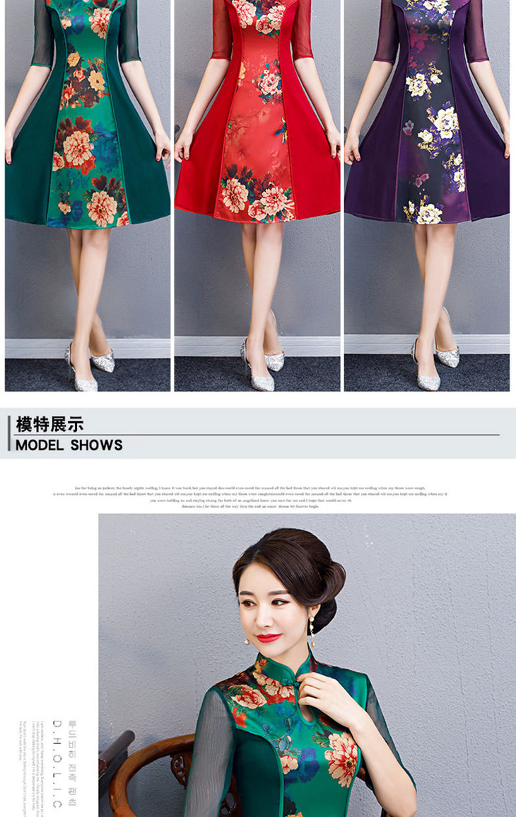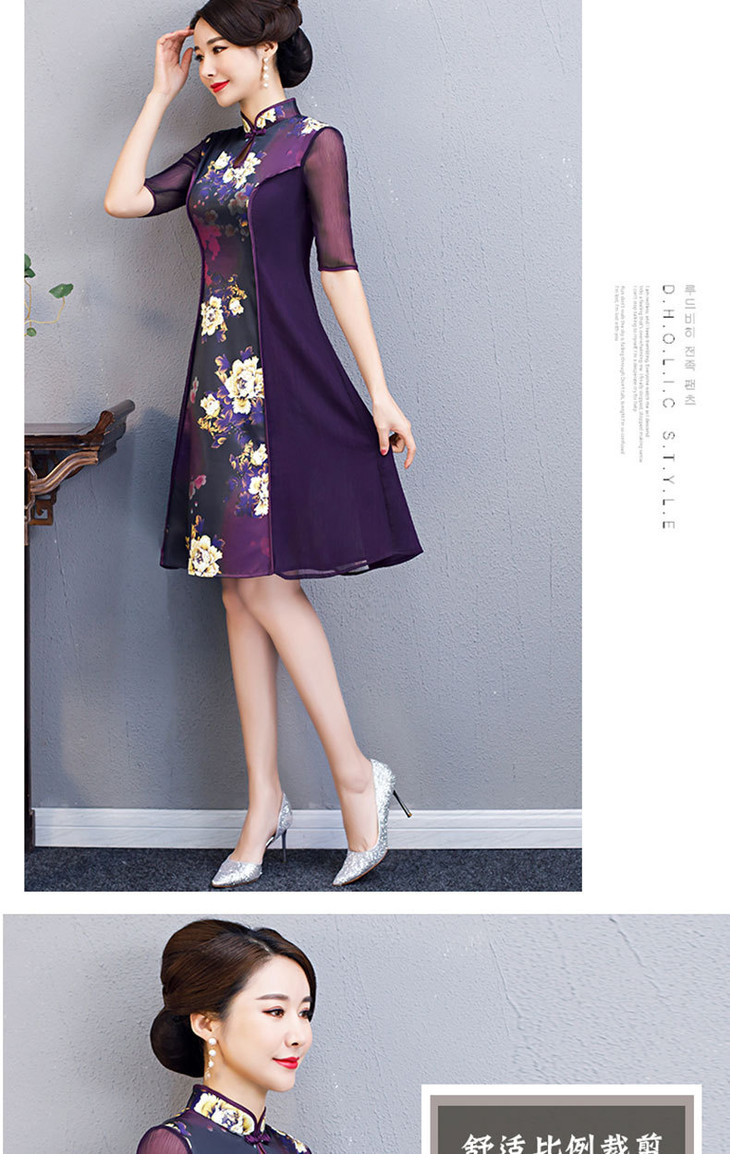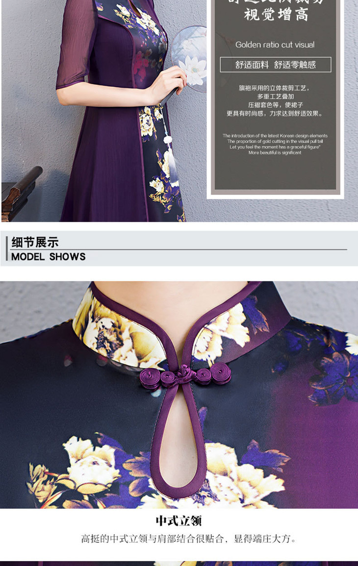 TX04256新款优雅气质修身立领雪纺拼接印花中长款连衣裙