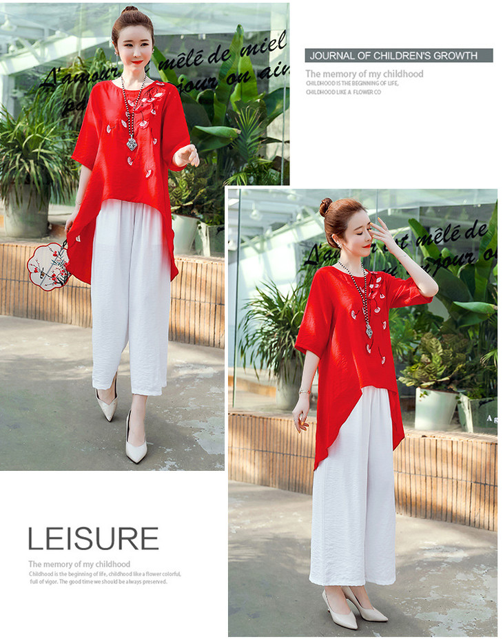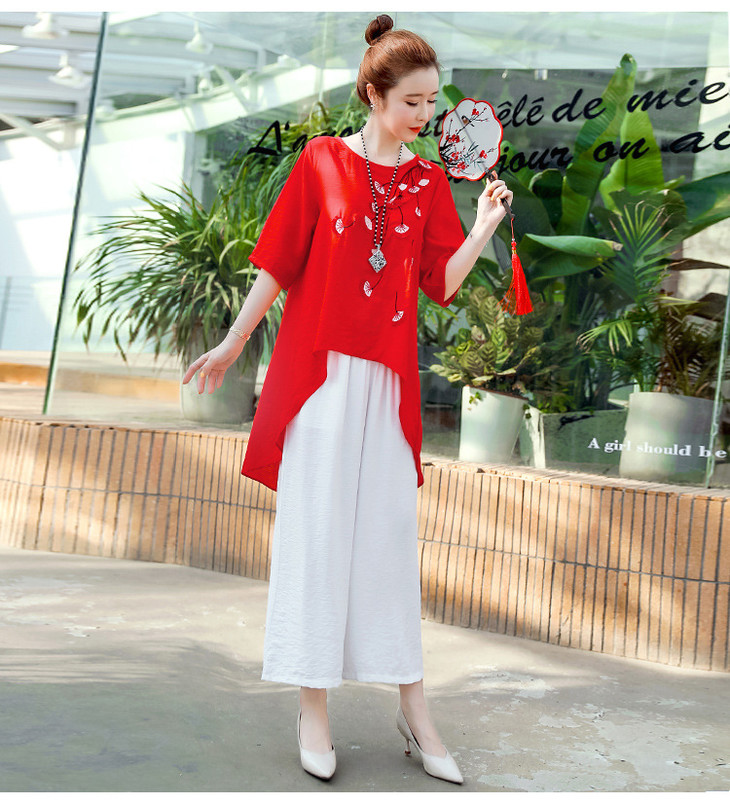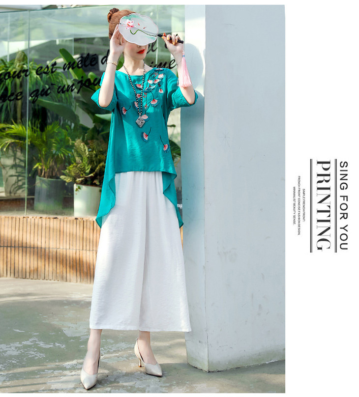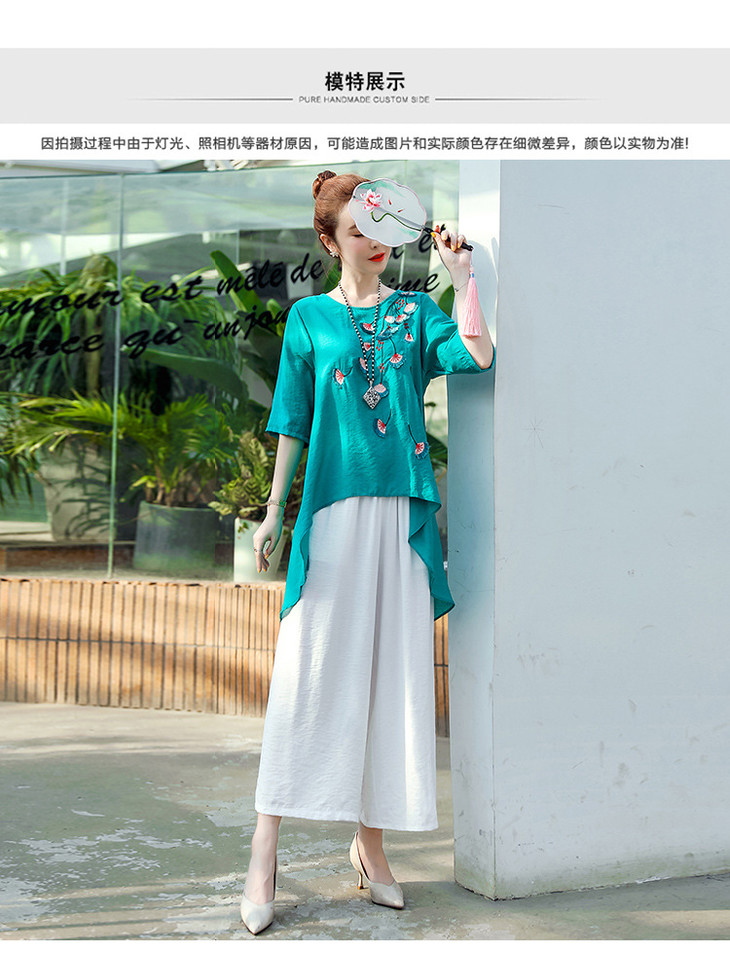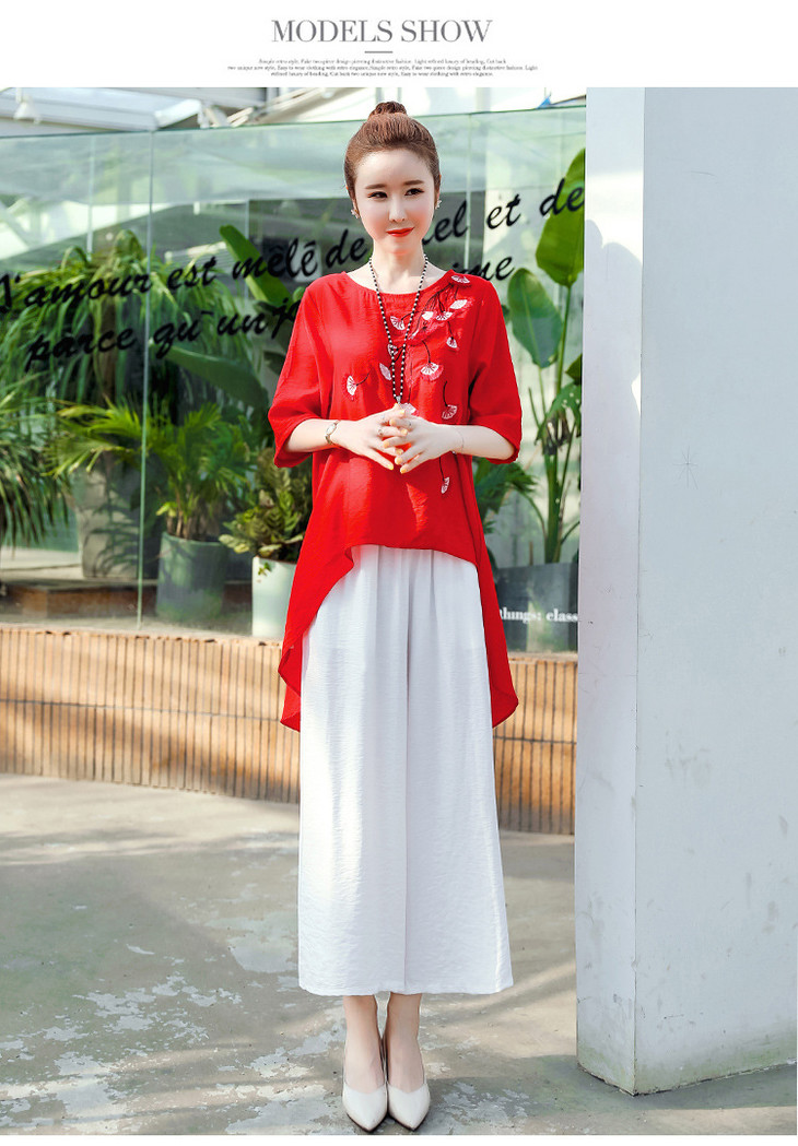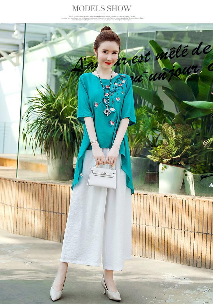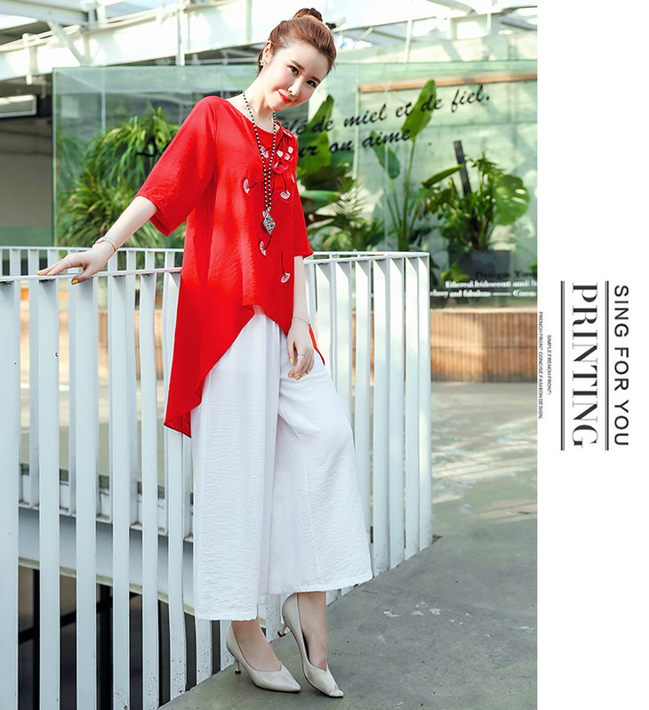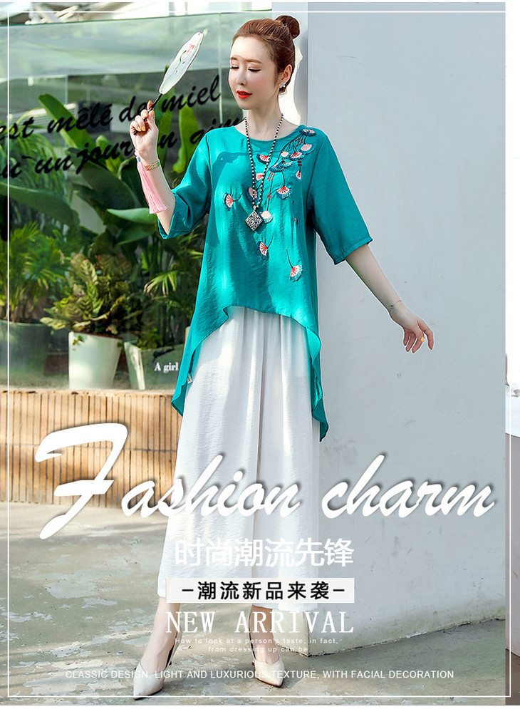 LY6886夏新款大码女装短袖减龄不规则印花上衣七分阔腿裤两件套