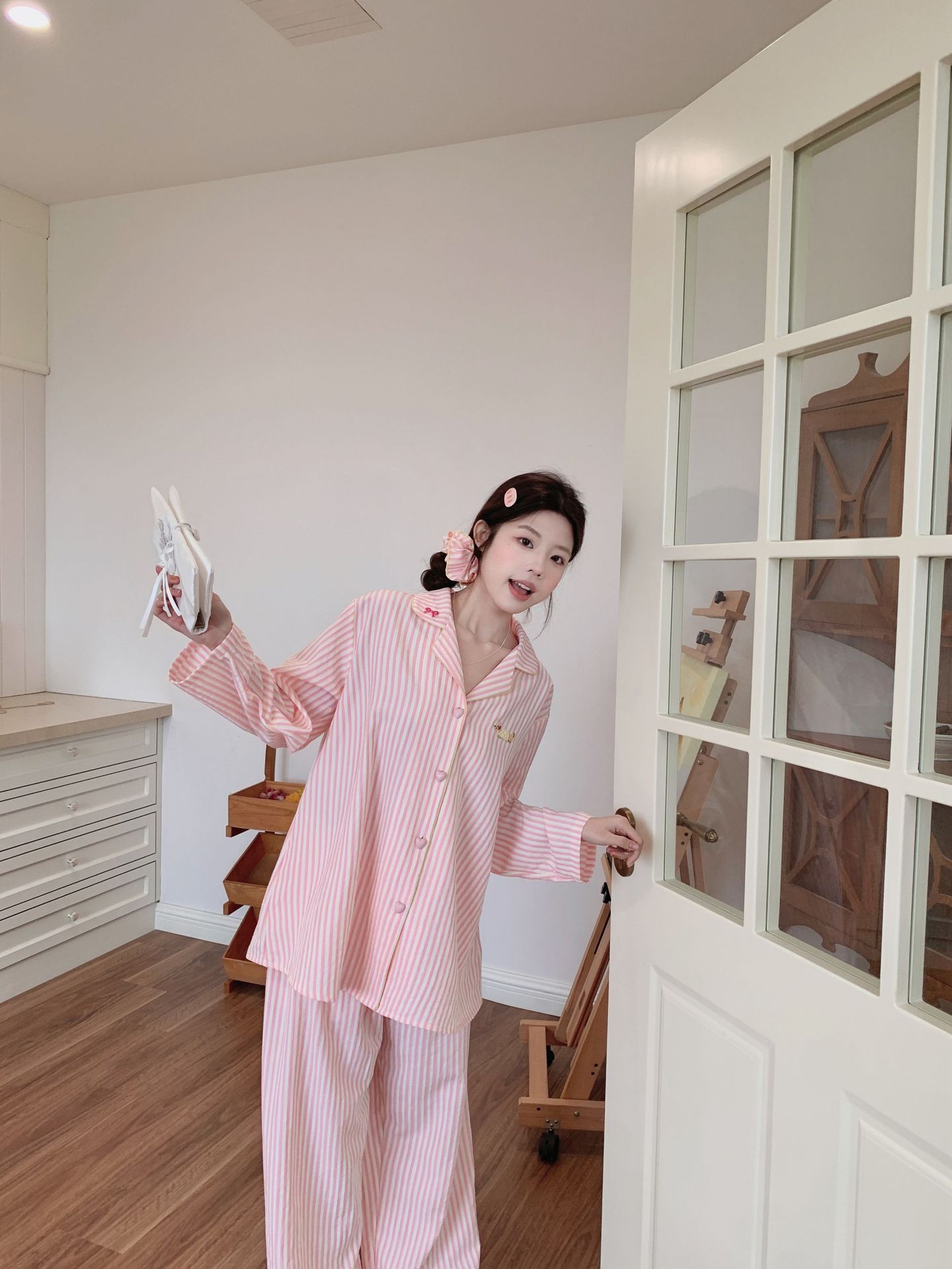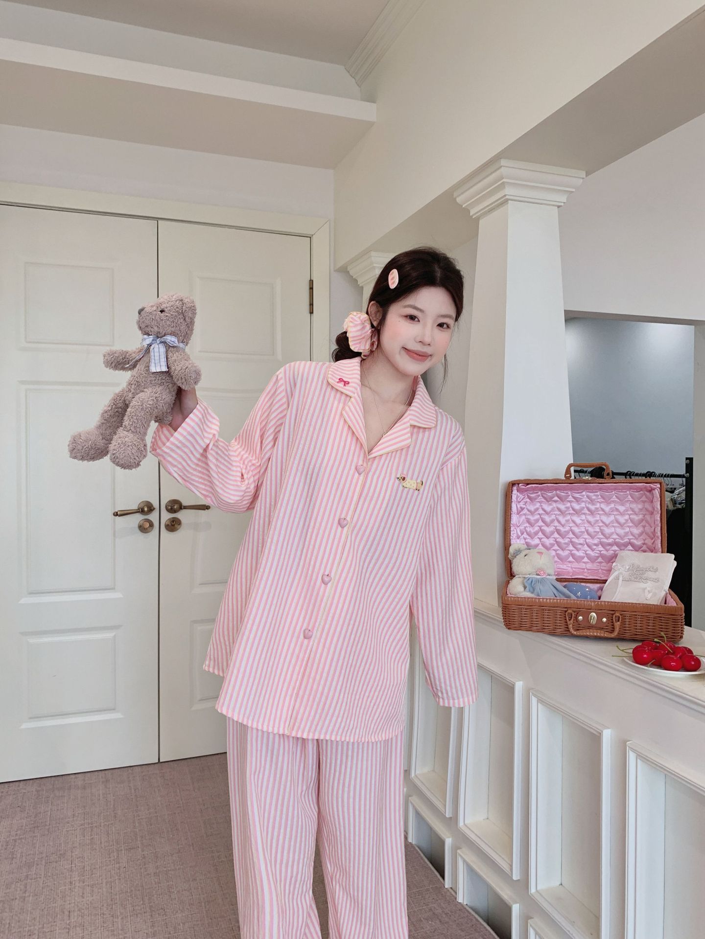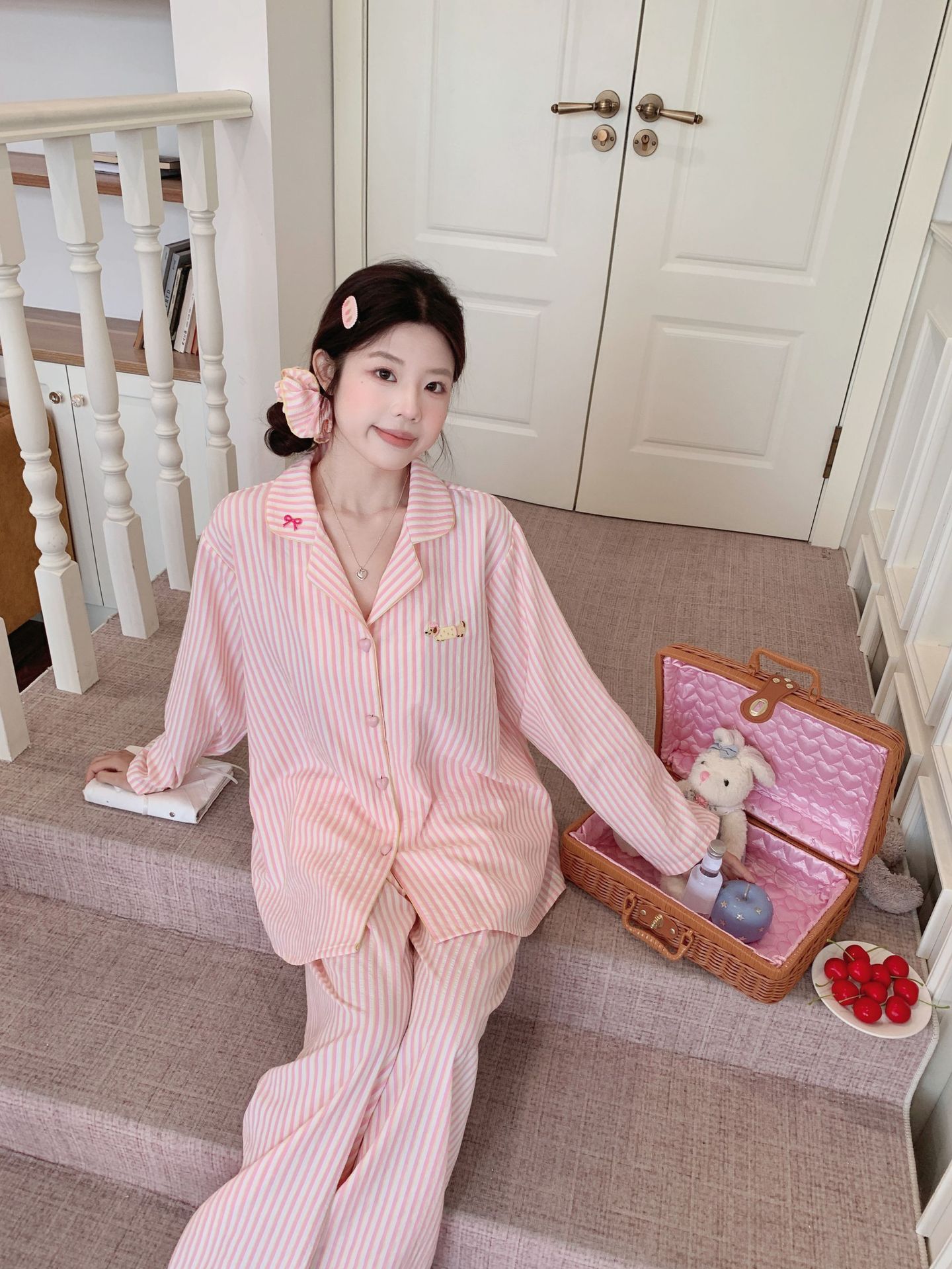 【亲肤透气宽松不勒❗️甜美少女感拉满】2026新款甜美条纹长袖睡衣女春夏季全棉刺绣家居服女舒适套装。jd