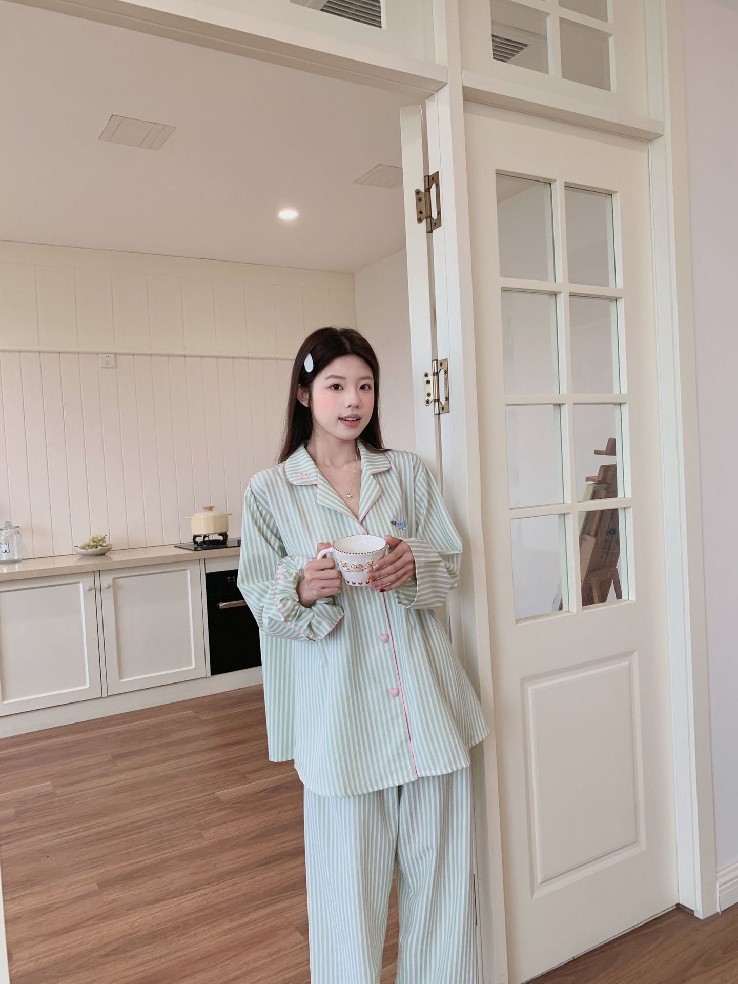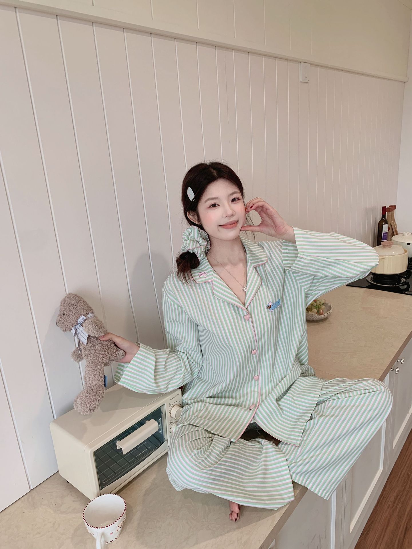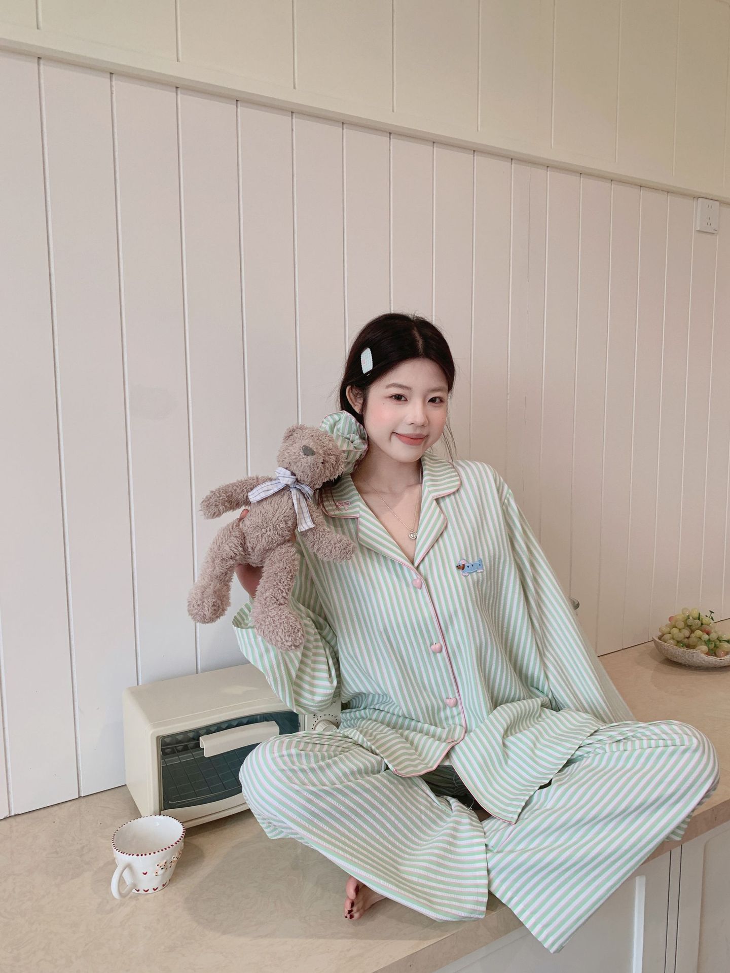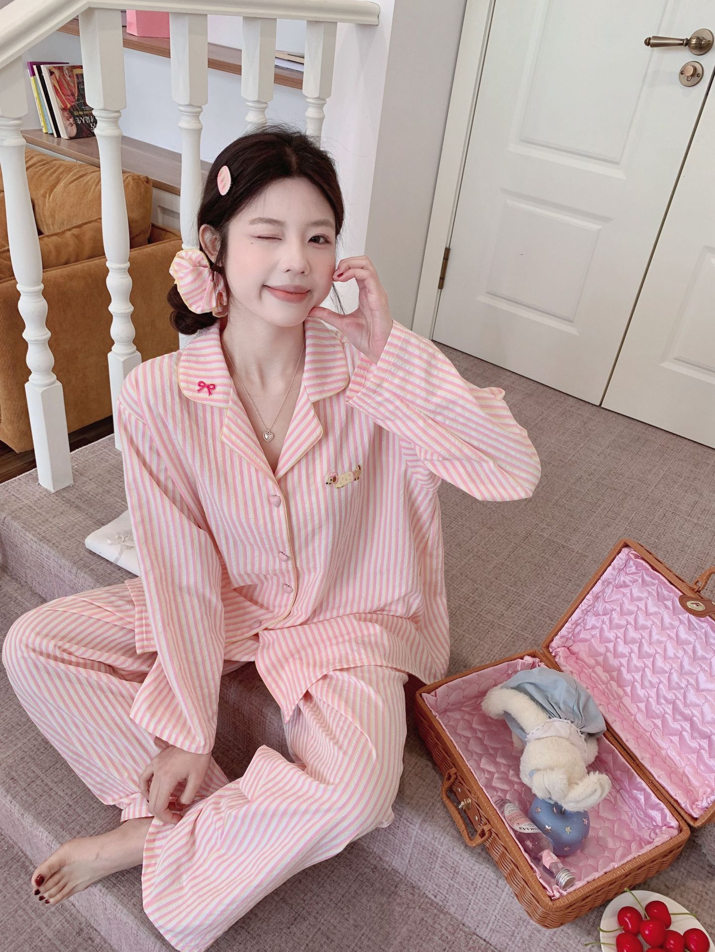 【亲肤透气宽松不勒❗️甜美少女感拉满】2026新款甜美条纹长袖睡衣女春夏季全棉刺绣家居服女舒适套装。jd
