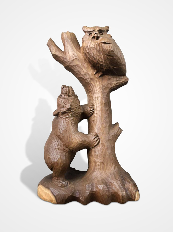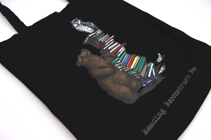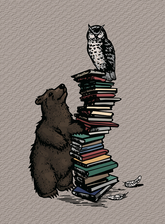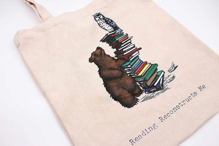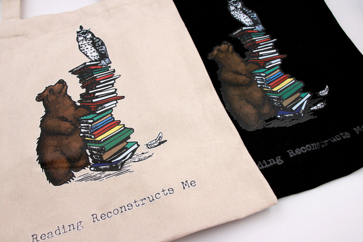 这款帆布袋主图是一只象征智慧的猫头鹰,站在高高的一摞图书之上;一只硕大的棕熊,正举手攀着书堆,向上仰望。