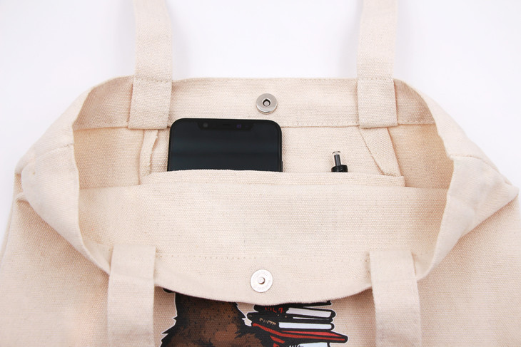 “读书毁了我”帆布袋共有黑和米白两种颜色,开口处有磁性暗扣,布袋还内置了尺寸为12cm×16cm的小口袋,方便收纳手机、笔、钥匙等小物件。