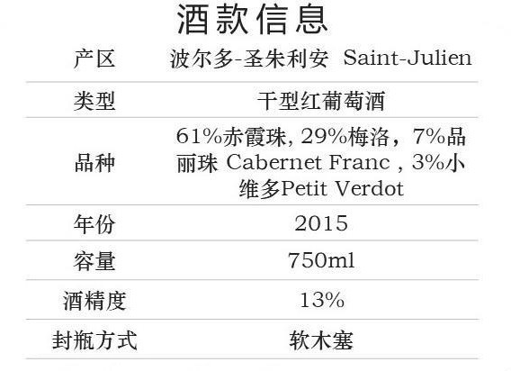 酒液呈较深的宝石红色,醒酒后,逐渐展现出成熟质地的黑莓,黑李子,黑醋栗的果实香气,以及橡木桶所带来的香草、烟熏和巧克力气息,还能感觉到一丝松露的气息。入口的口感成熟圆润,比许多圣朱利安的酒更加丰富华丽的果味和构造,一种线性但工整的结构感,单宁处理得很好,且潜力十足,毫无疑问,优秀的性价比。