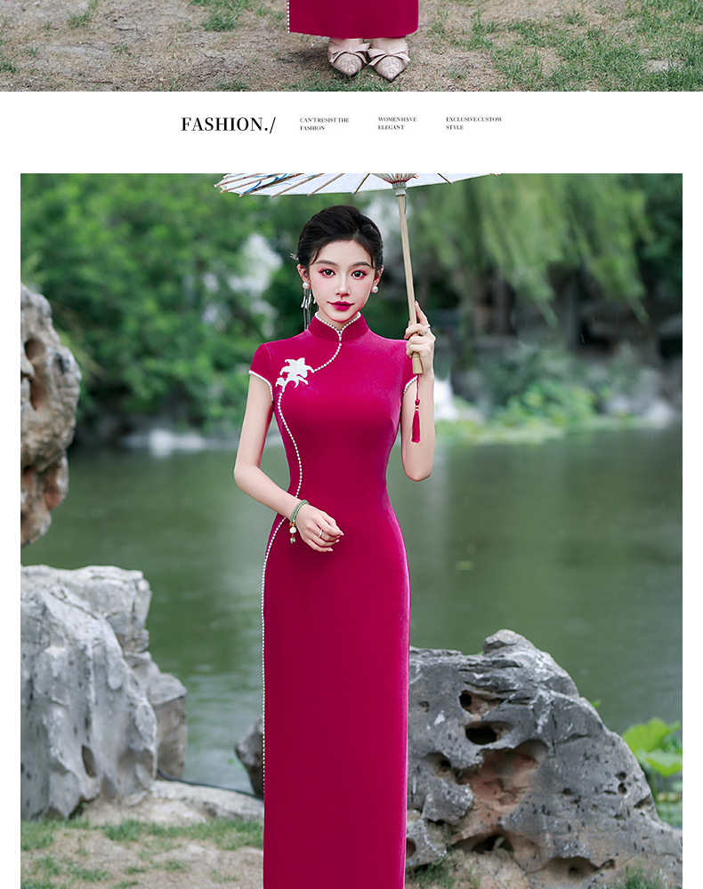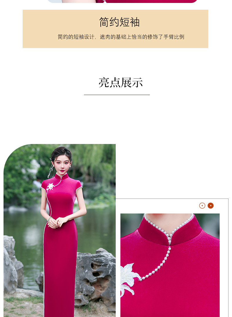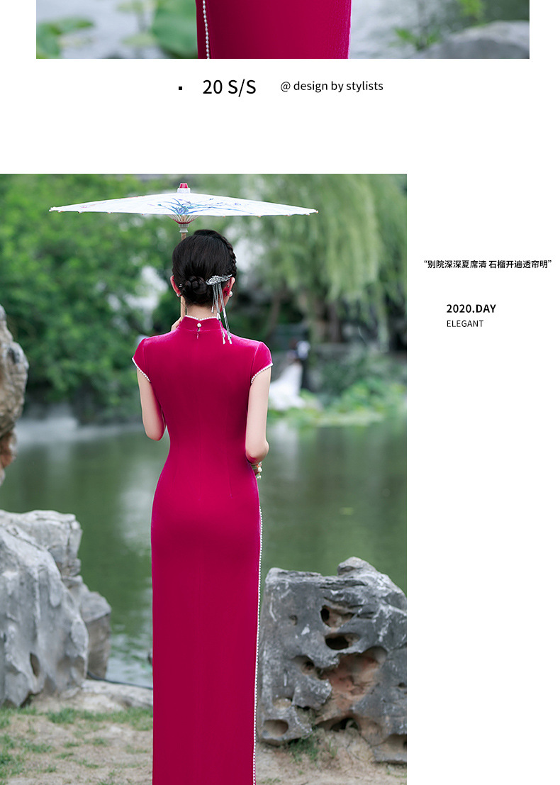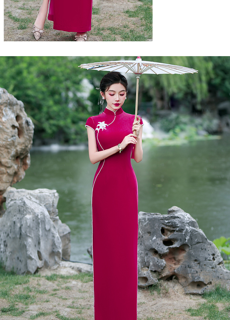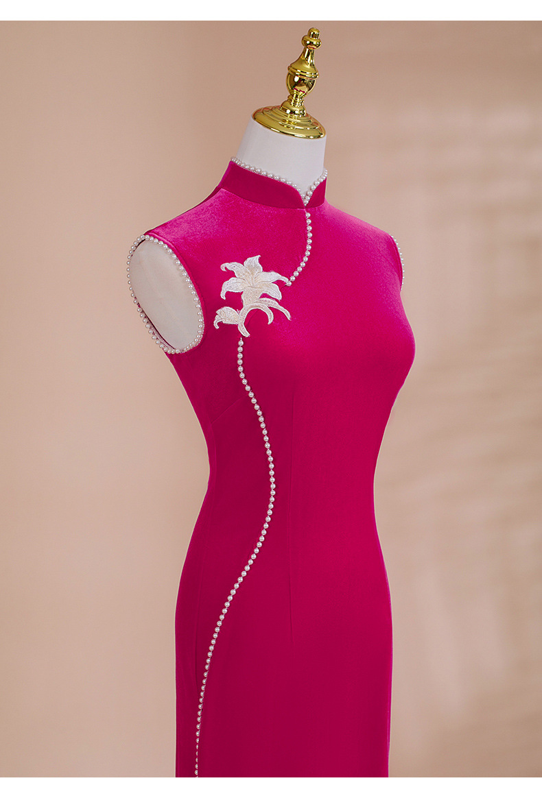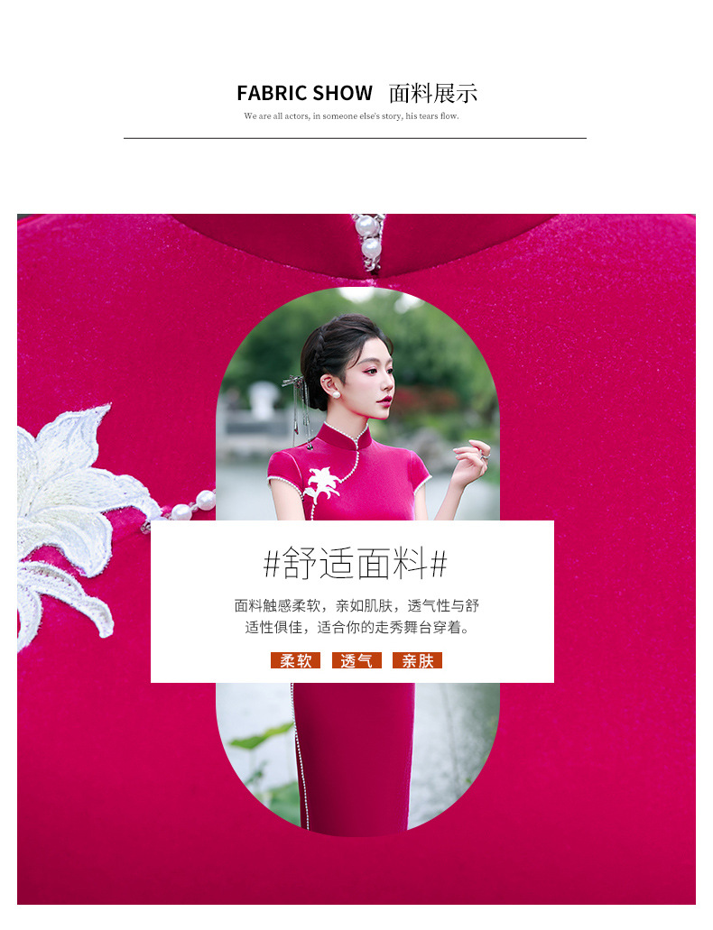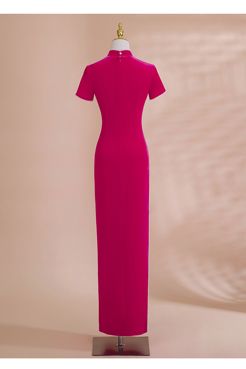 YD-4503走秀旗袍2025新款高端大气形体礼仪旗袍复古修身舞台珍珠丝绒玫红