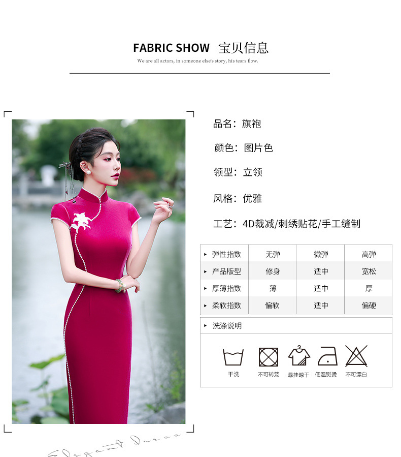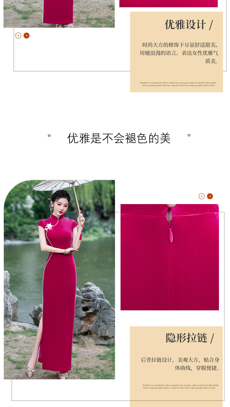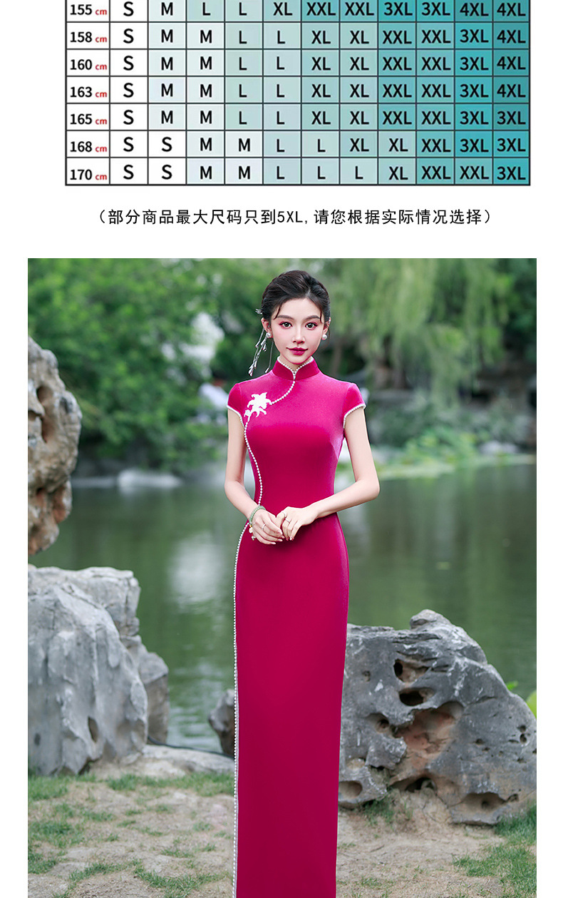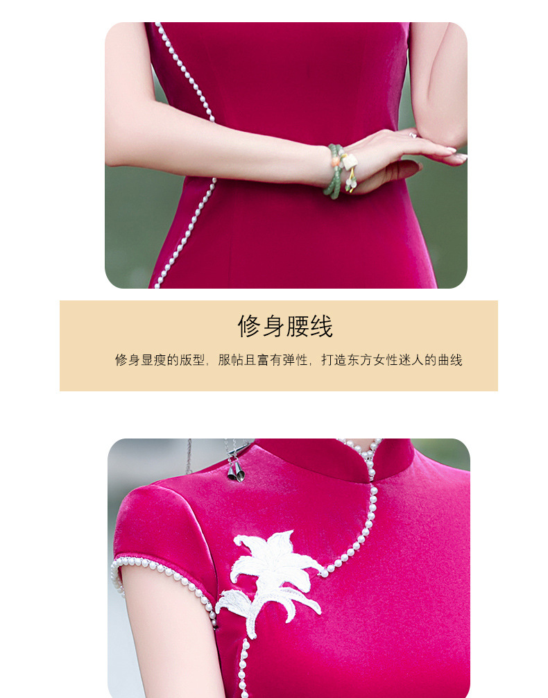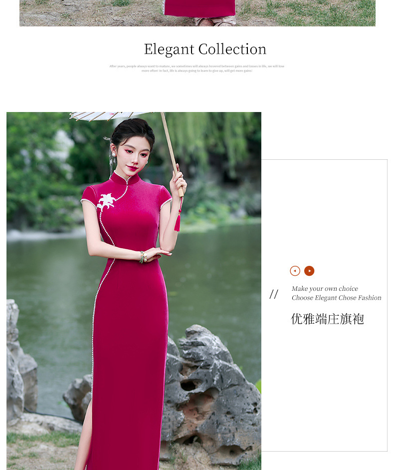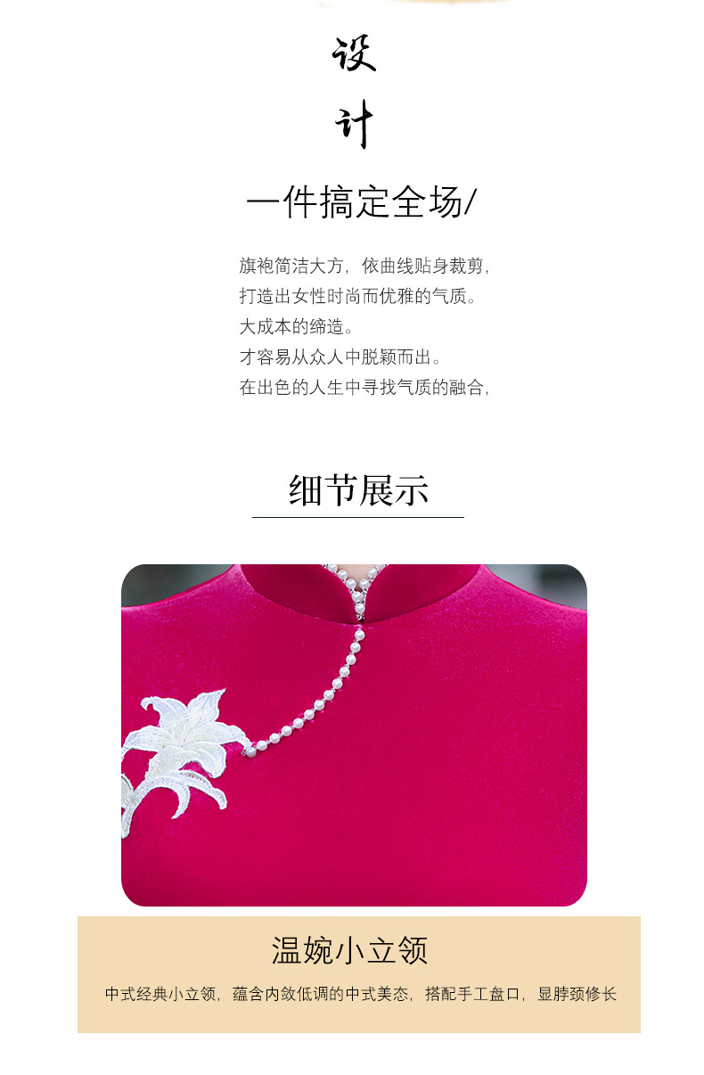 YD-4503走秀旗袍2025新款高端大气形体礼仪旗袍复古修身舞台珍珠丝绒玫红