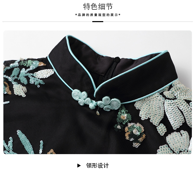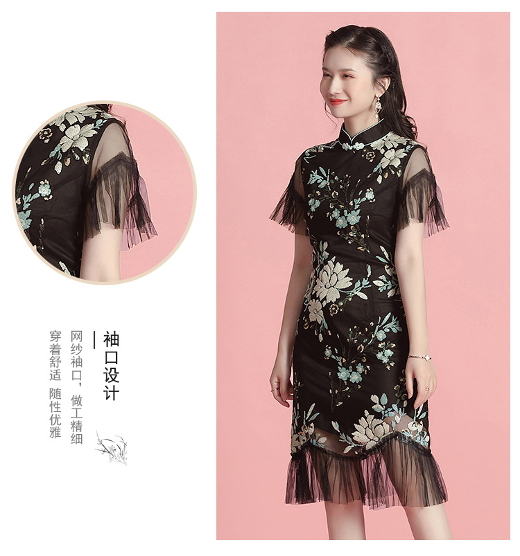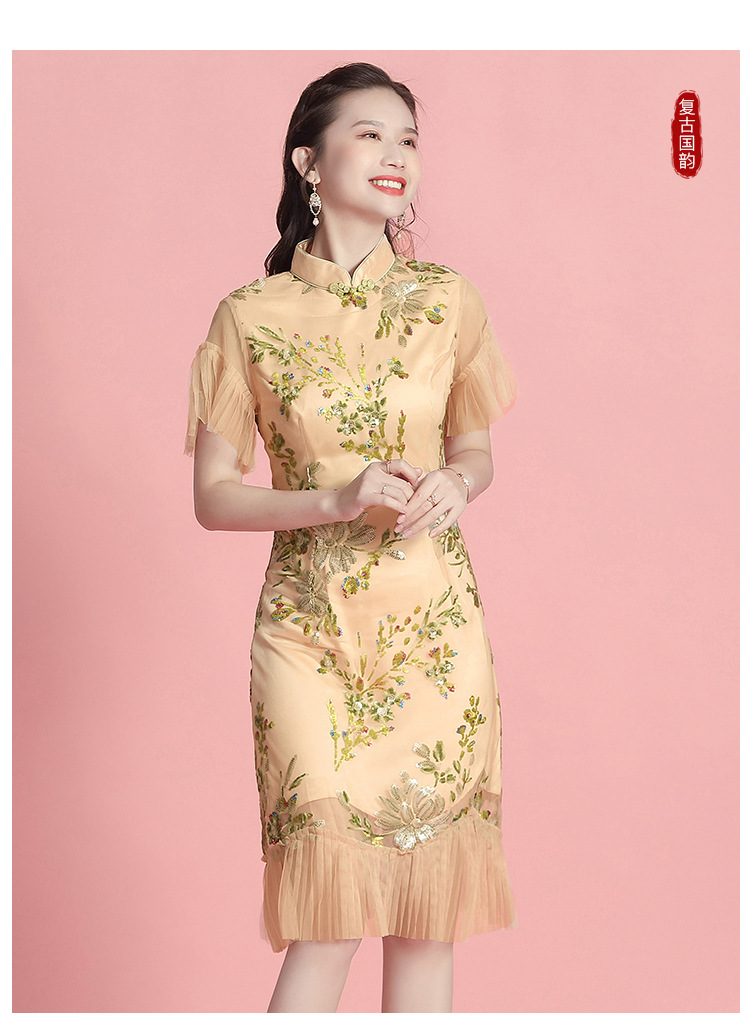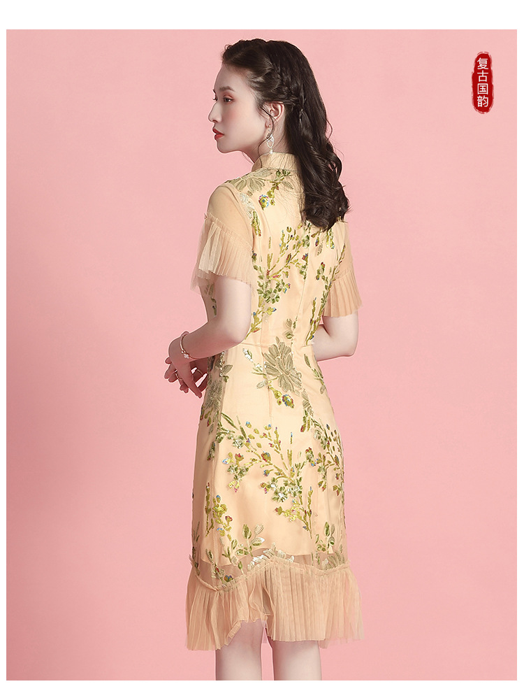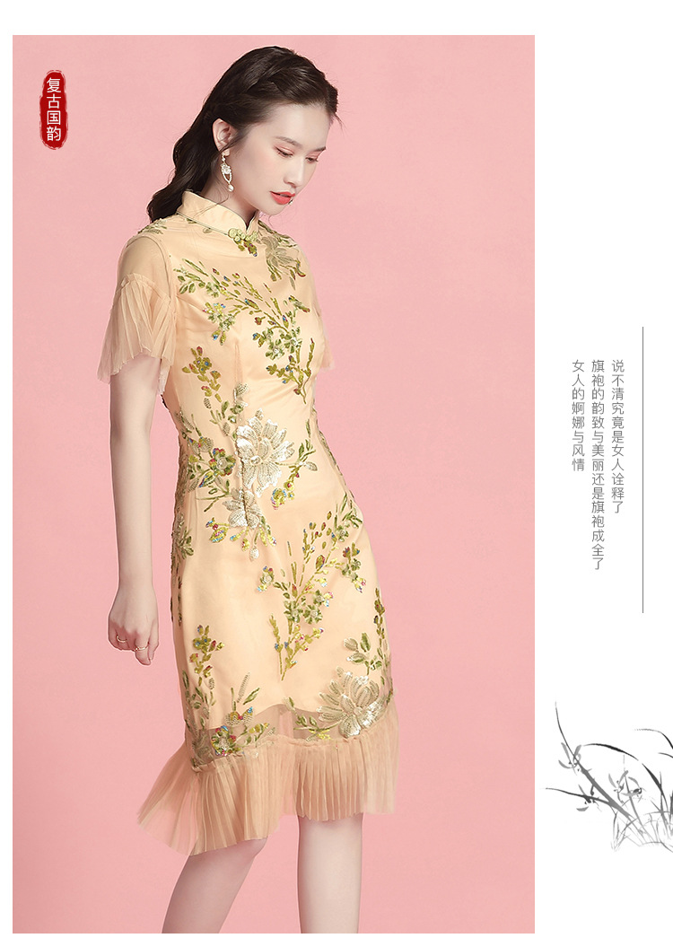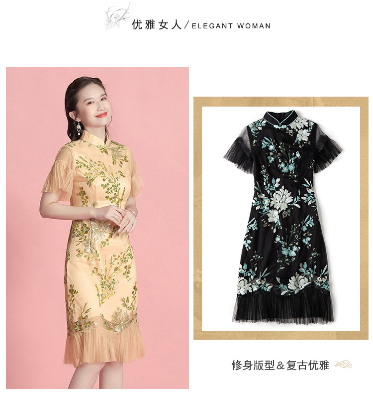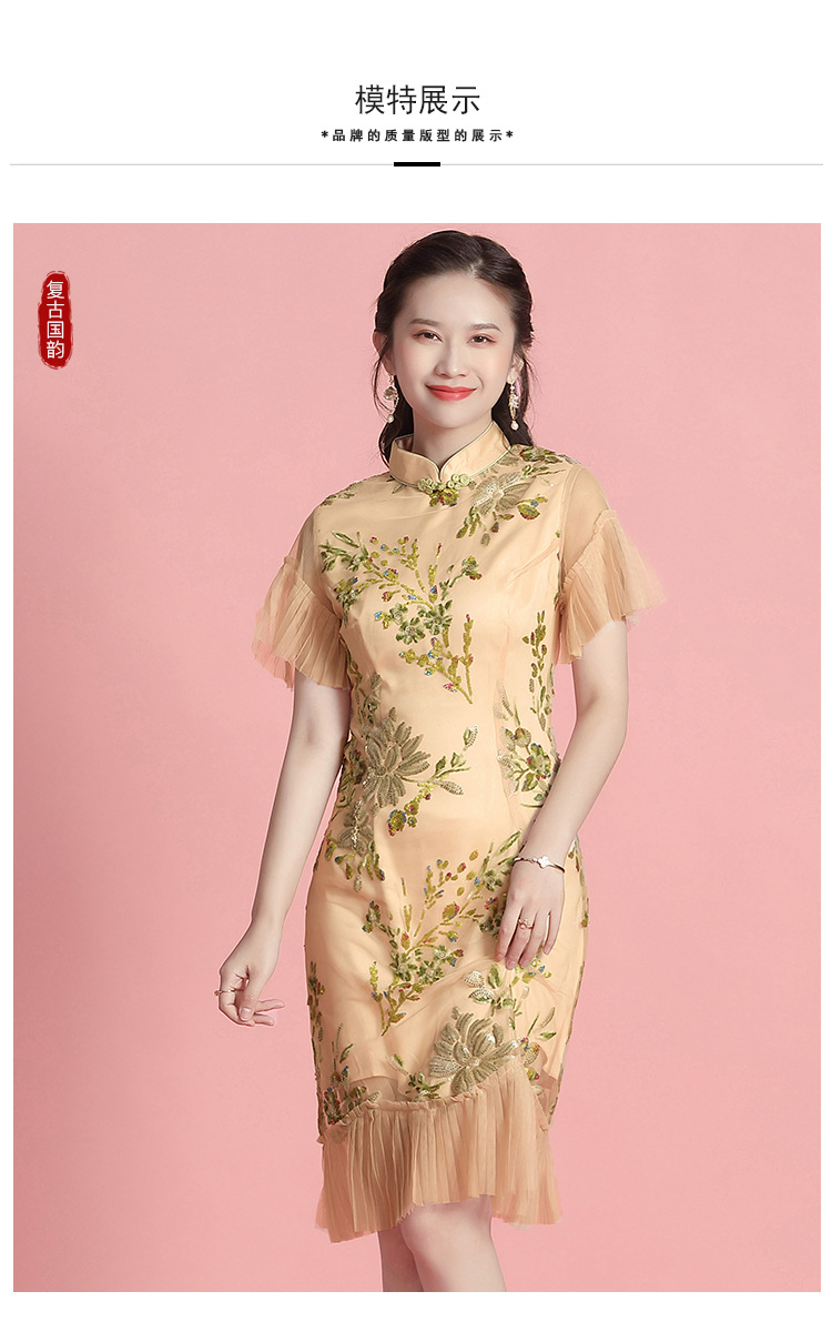 上海旗袍厂AYK-642487630967绣亮片拼接纱网压褶鱼尾旗袍裙改良复古时尚旗袍女2021夏新品女装