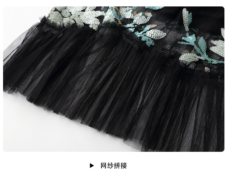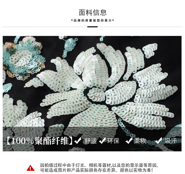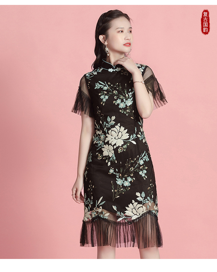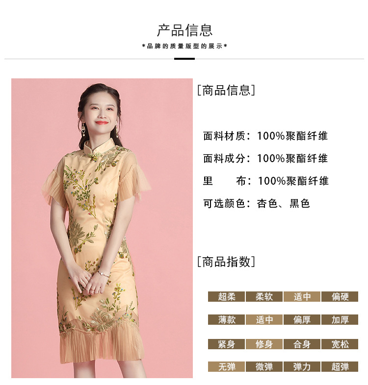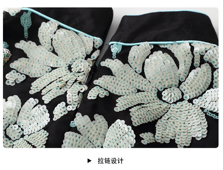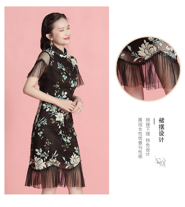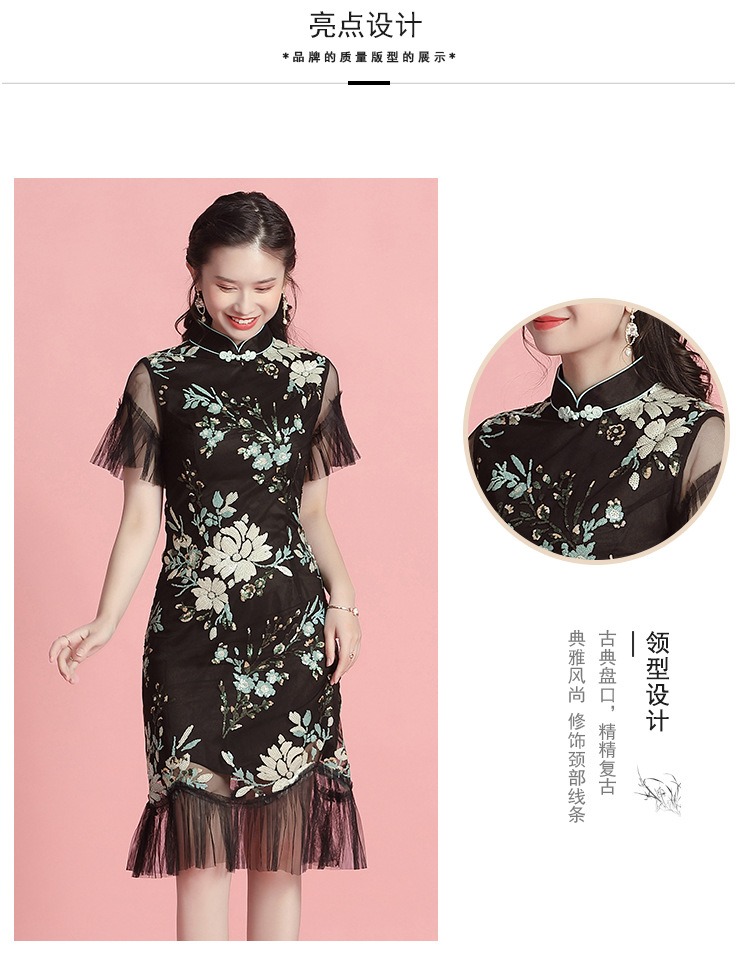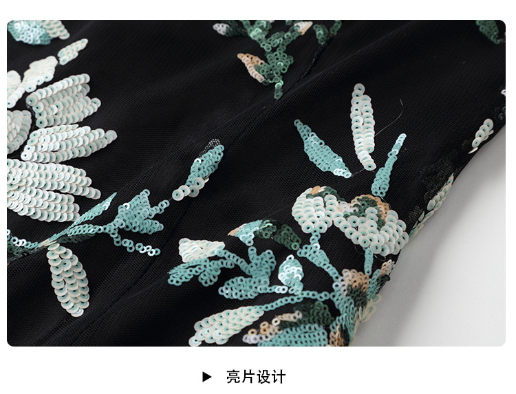 上海旗袍厂AYK-642487630967绣亮片拼接纱网压褶鱼尾旗袍裙改良复古时尚旗袍女2021夏新品女装