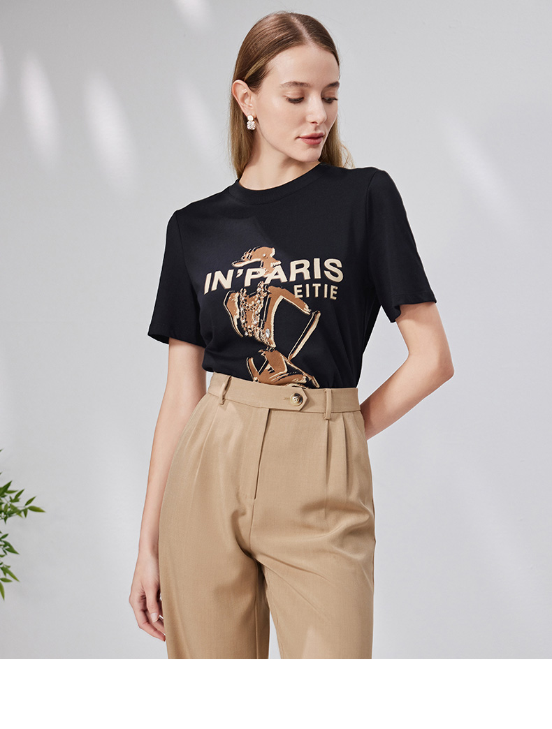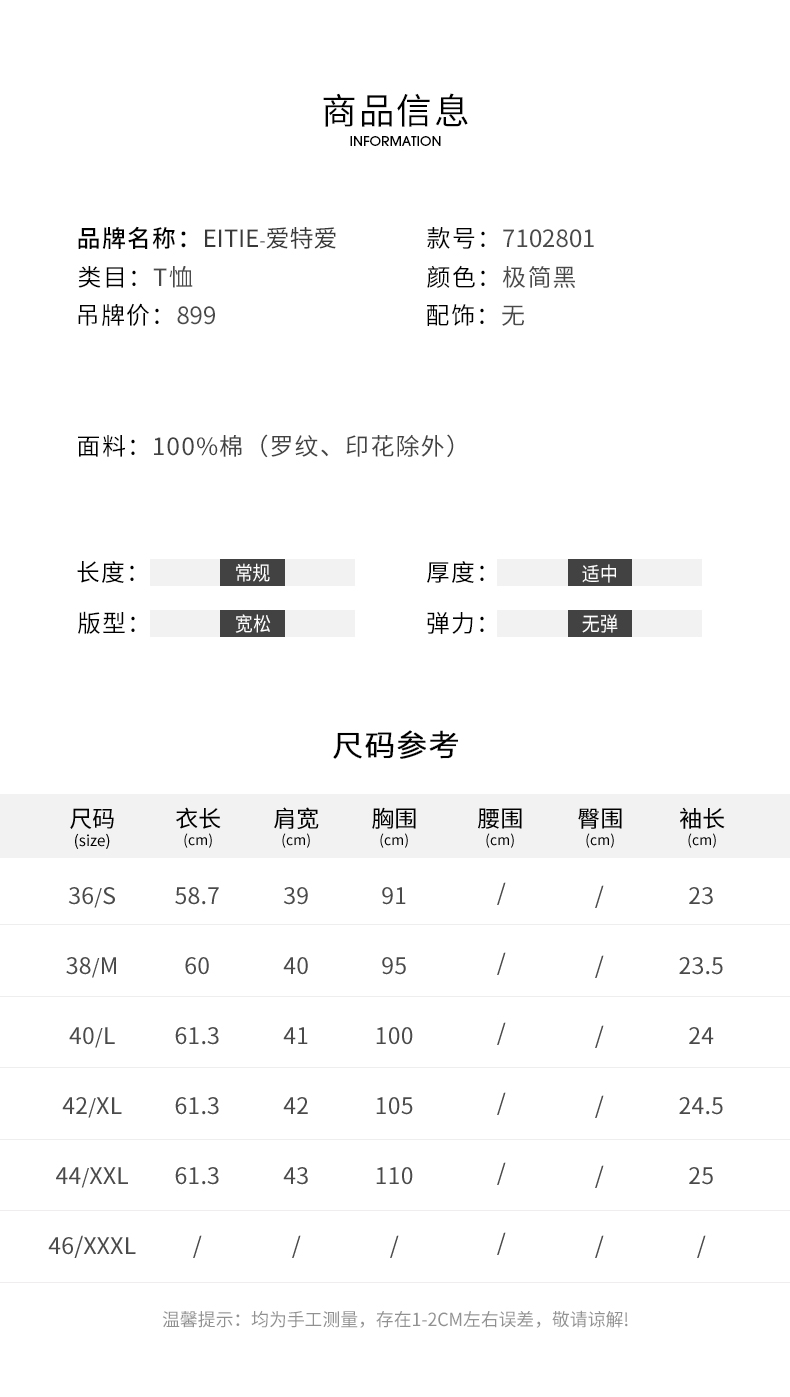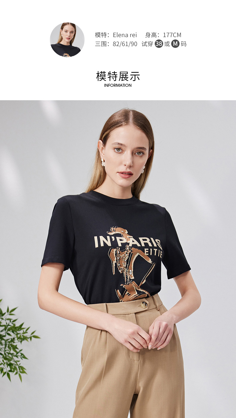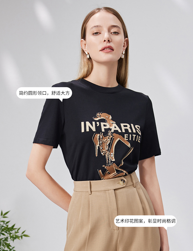 EITIE爱特爱新款100%棉时尚百搭打底舒适弹力圆领印花T恤女7102801