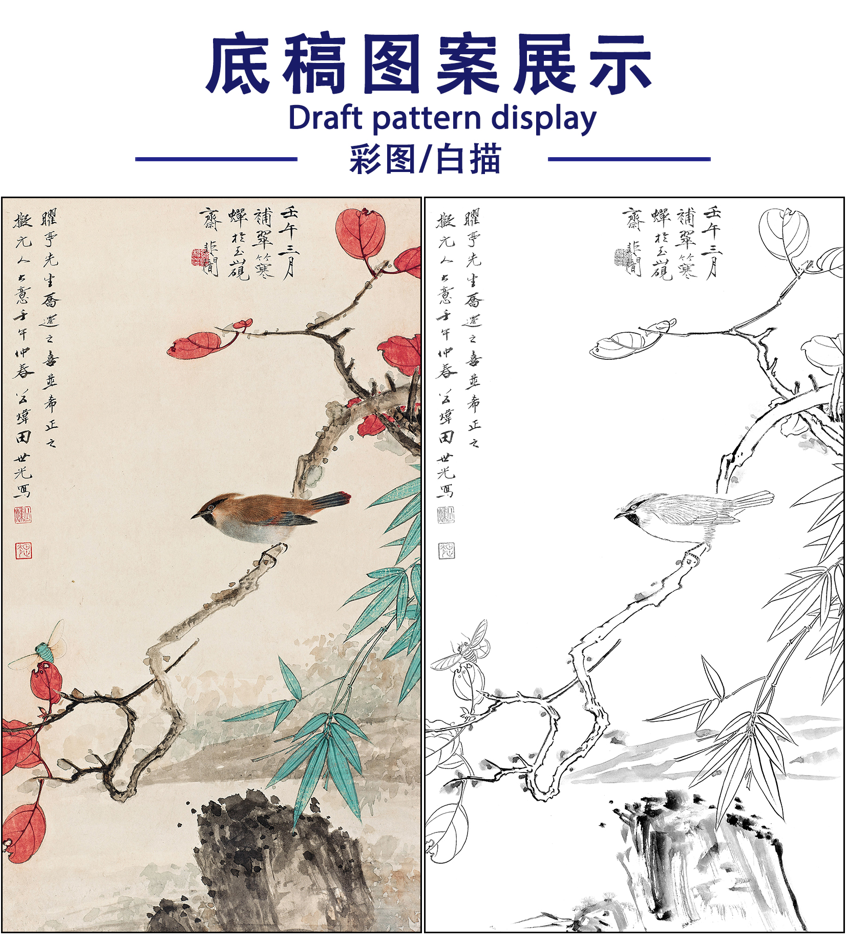 于非闇花鸟工笔画白描底稿《红叶幽禽》临摹勾线高清打印稿FA01
