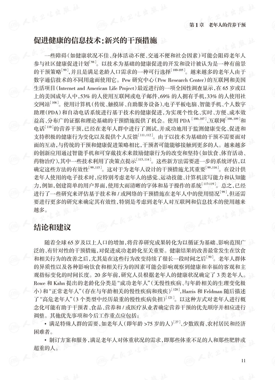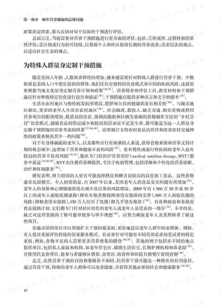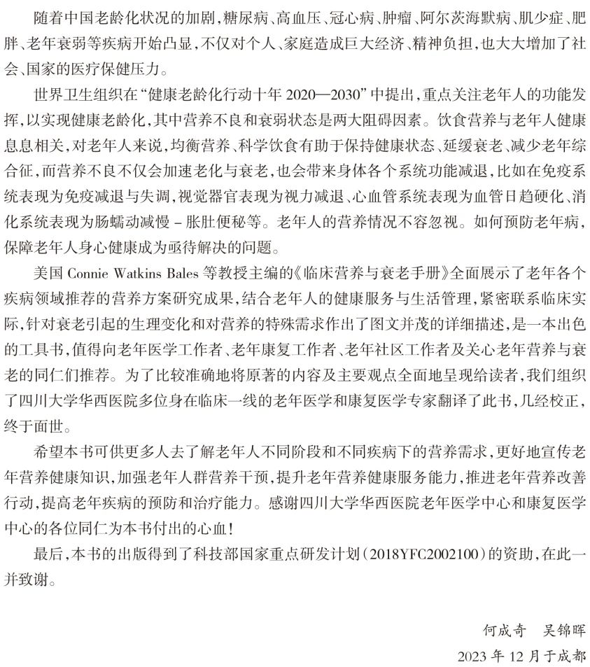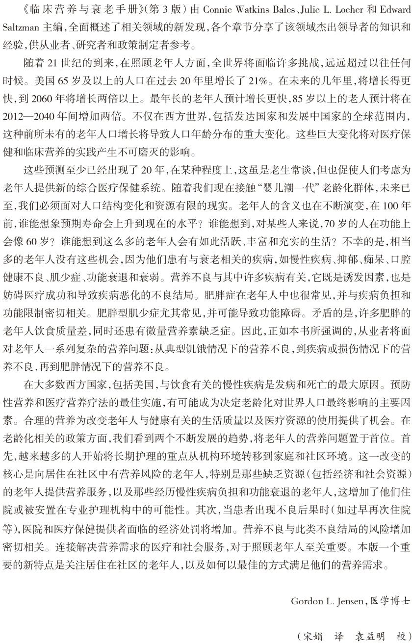 第三部分介绍常见的临床情况的处理,主要包括老年人的肥胖与体重管理策略、老年糖尿病和代谢综合征患者营养与生活方式改变、实体肿瘤患者的营养支持、骨质疏松症的营养问题、临终阶段的营养支持等;