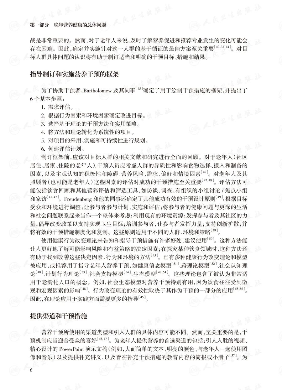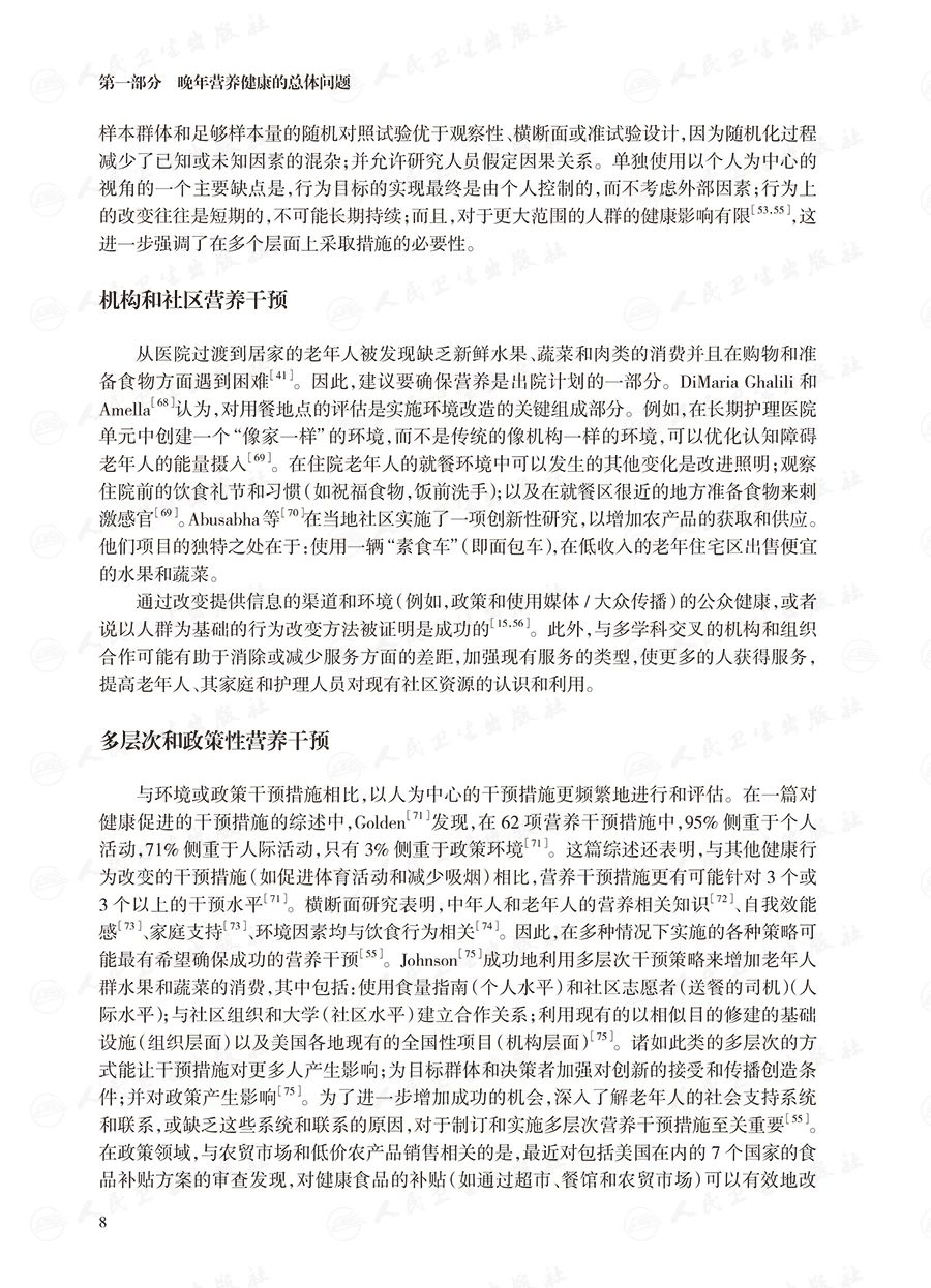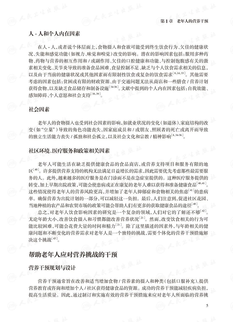 第三部分介绍常见的临床情况的处理,主要包括老年人的肥胖与体重管理策略、老年糖尿病和代谢综合征患者营养与生活方式改变、实体肿瘤患者的营养支持、骨质疏松症的营养问题、临终阶段的营养支持等;