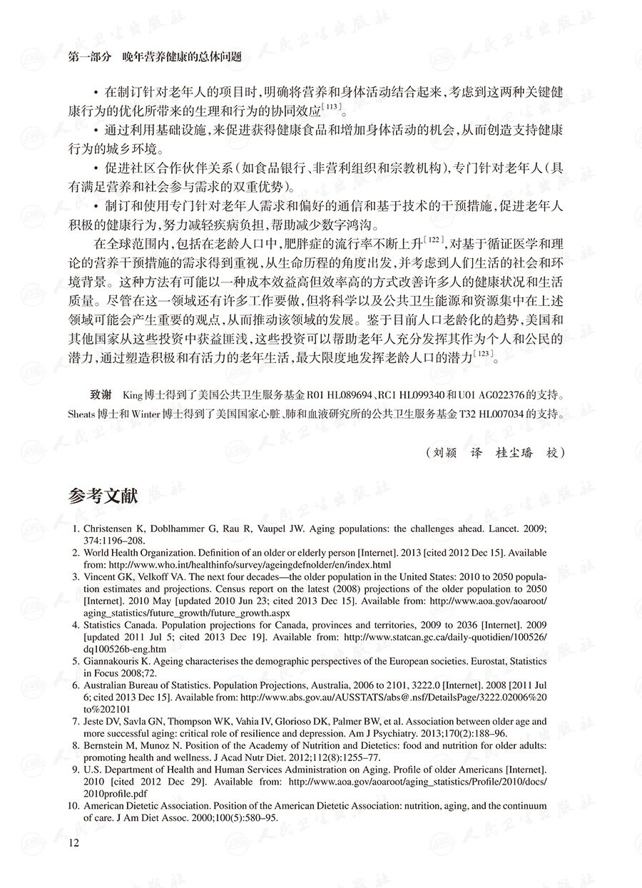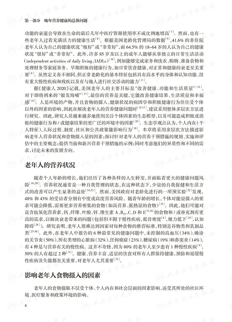 第四部分介绍了当代饮食关注的问题,主要包括营养调整的抗衰老作用、老龄化人群中的高风险营养素、体力活动和锻炼、老年人的膳食补充剂等。