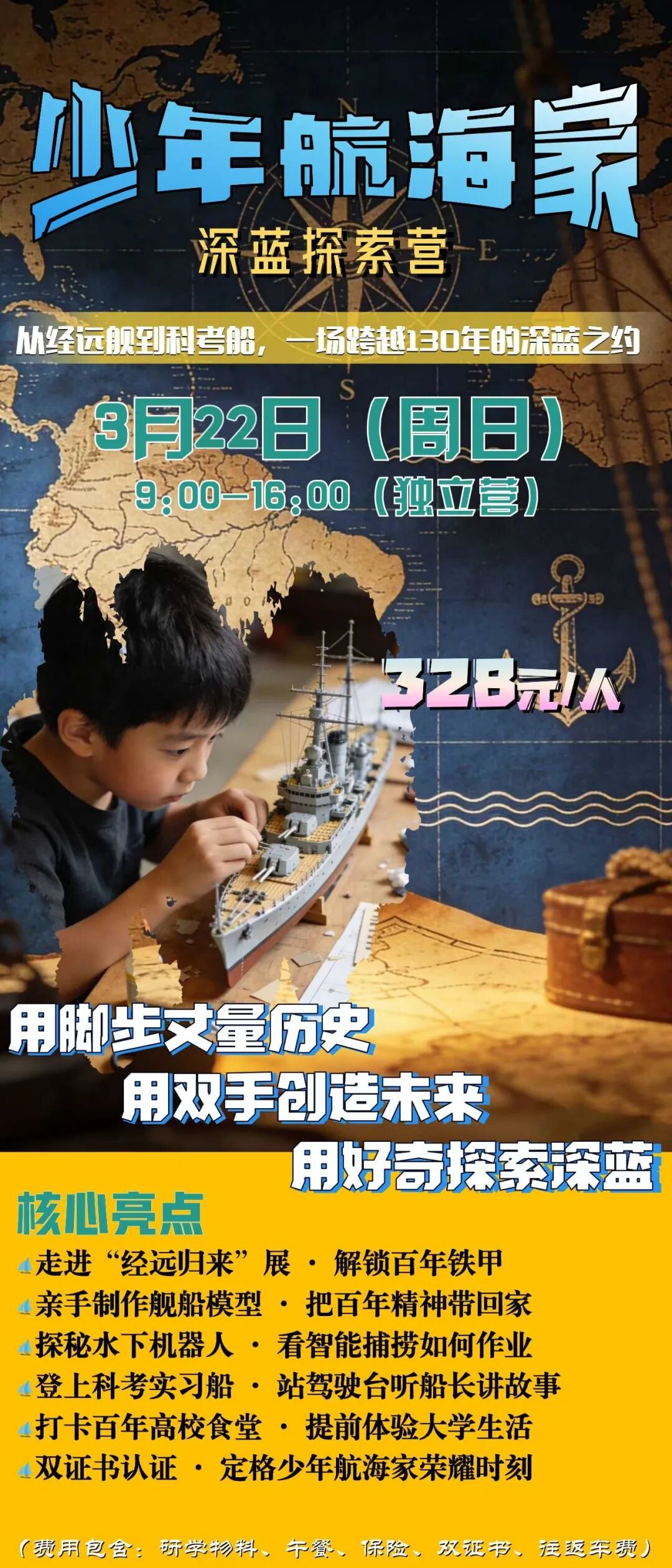 少年航海家深蓝探索营!探经远舰百年历史、DIY舰船模型、解锁水下机器人科技,登科考船等,高校体验+双证书,一天解锁历史+科技+创造!