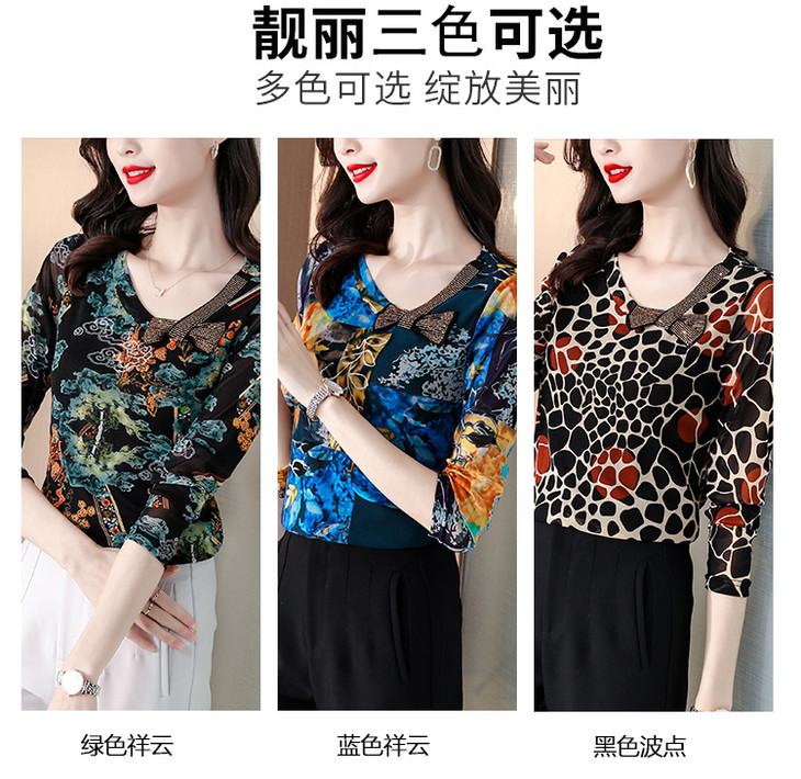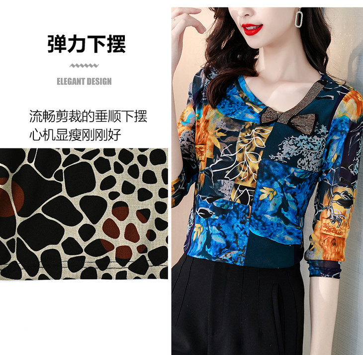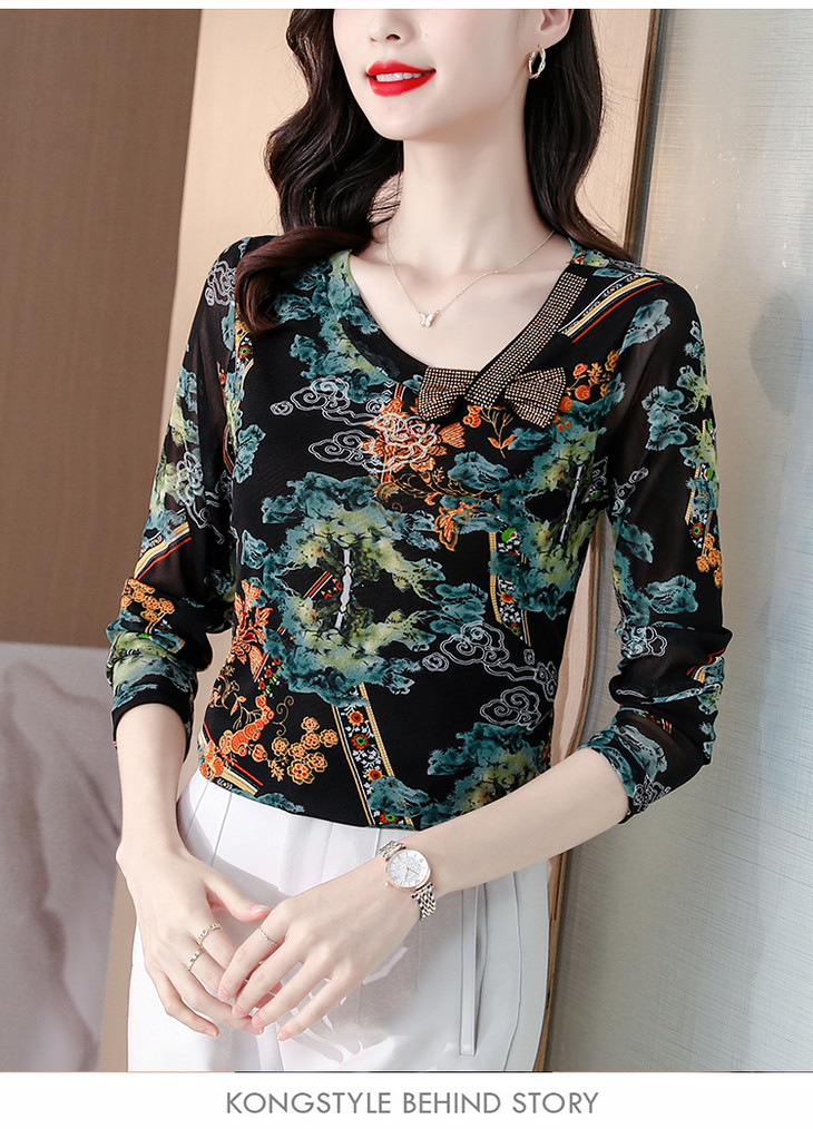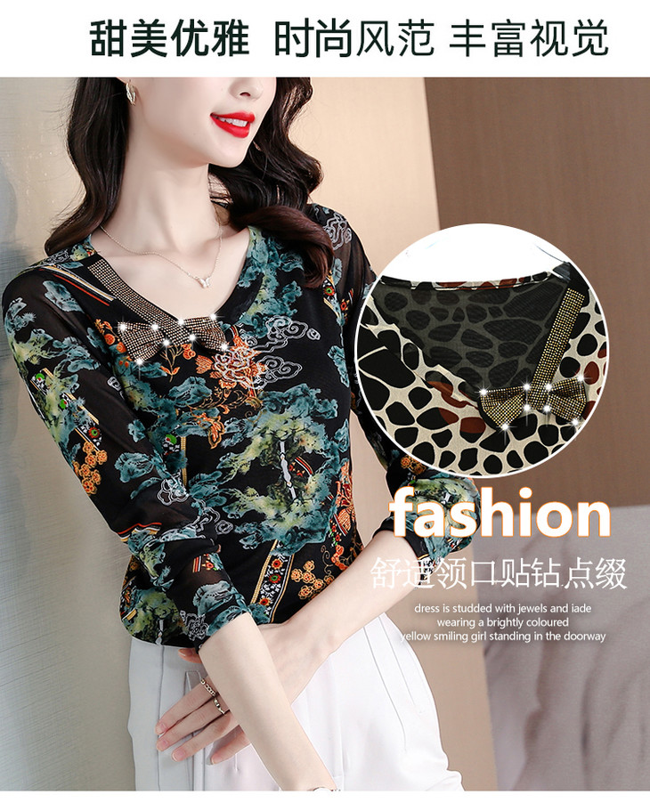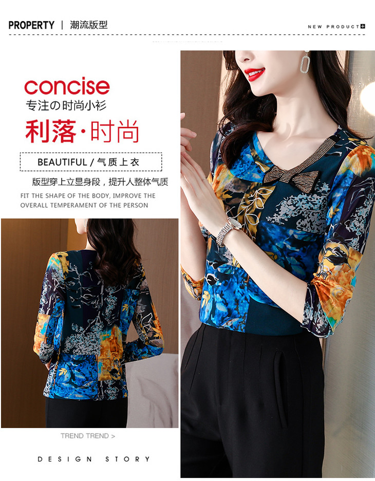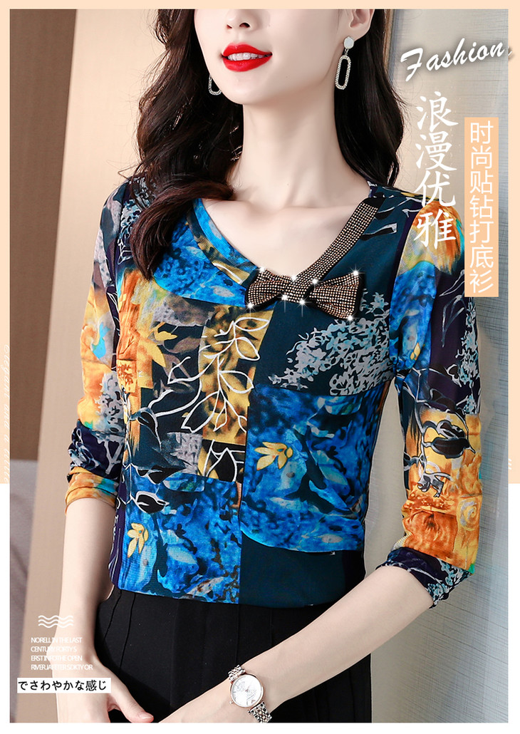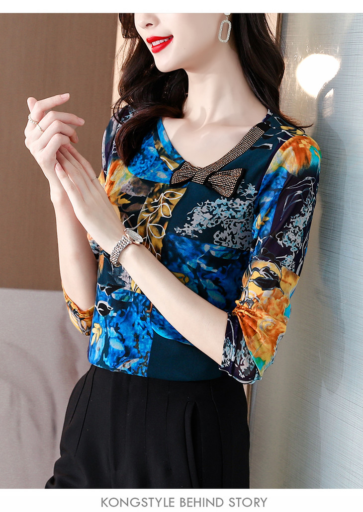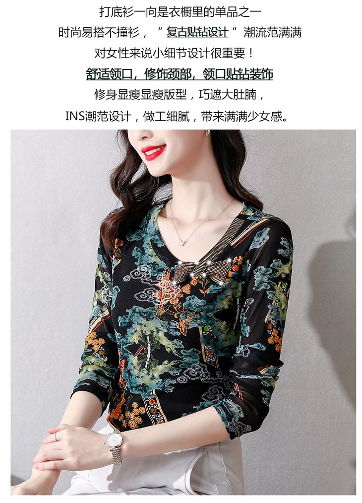 KQL 210H826秋季弹力V领镶钻修身显瘦减龄小衫【薄款】