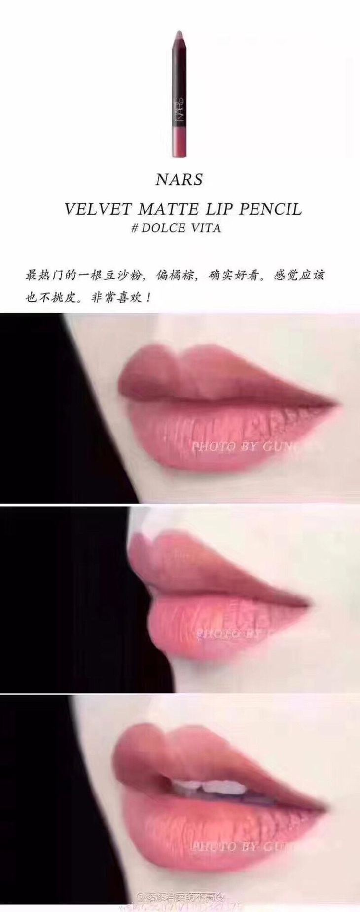 NARS 唇膏笔豆沙色 DV/Dolce Vita🍄Dolce Vita是nars最紅的一個色號,🌻Nars最日常也幾乎適合每一個人,🔥讓氣色立刻變的很元氣很優雅✨,算是必入的顏色吧。DV是一個很好看的豆沙色,在暖光下偏橘,💦在冷光下偏粉。❄️质地丝绒无光泽感,颜色和质地非常相配。最适合素颜的口红,没有之一,很自然,提气色。💃🏻