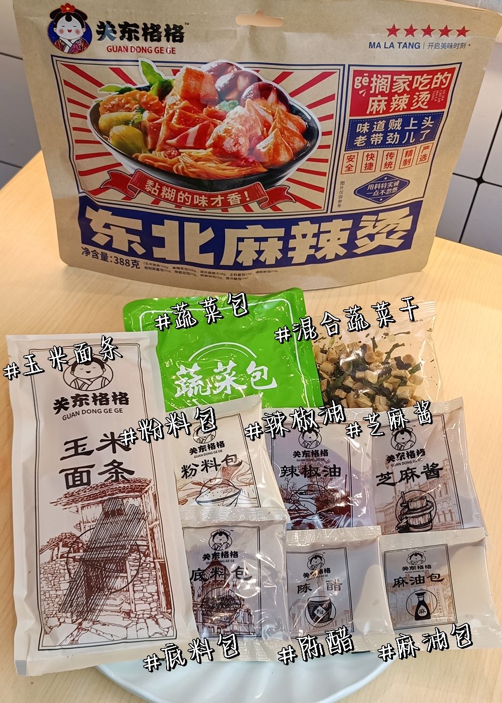 实锤了💯,挖到正经东北巨黏糊麻辣烫了,辣的到位,麻的舒服~关东格格麻辣烫,宅家必囤速食!⭐打开包装,满满当当9包料 真的很足,配菜齐全+料包十足+口感好+味道香🉑,你还可以根据自己喜好往里面放各种食材,最后再加上点白糖和陈醋,味道简直无敌了 大家一定要尝尝‼