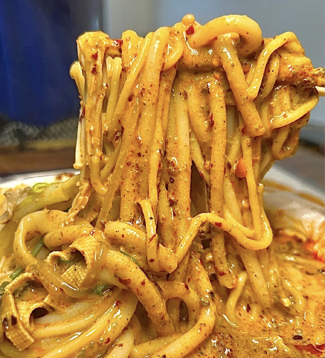 玉米面条,土豆片,藕片,海带,木耳,笋片,豆皮再加上青菜煮熟,依次加入麻酱、辣椒油、麻油、醋,搅拌均匀让每根玉米面条裹满汤汁~Q弹有嚼劲的玉米面,比牛筋面更丝滑,心里就只想着赶紧扒拉完这碗,一口都不准剩,尽情感受脂肪叠加碳水的快乐 !