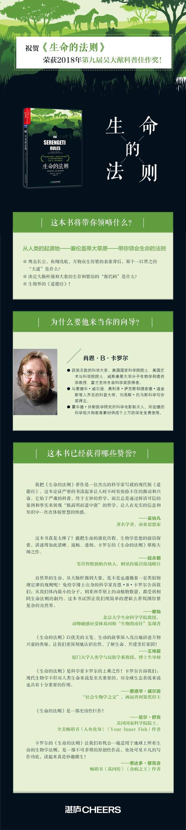 卡罗尔的《生命的法则》让我们有机会一窥适用于地球上所有生命的生物学法则,是一部不可多得的原创性作品,处处可见不凡的写作功底,读起来真是妙趣横生!