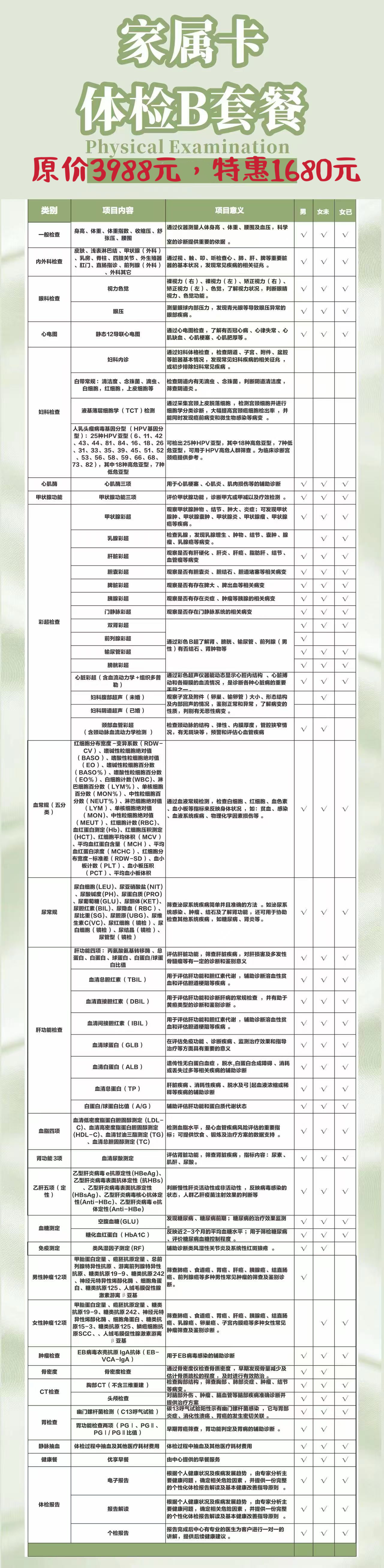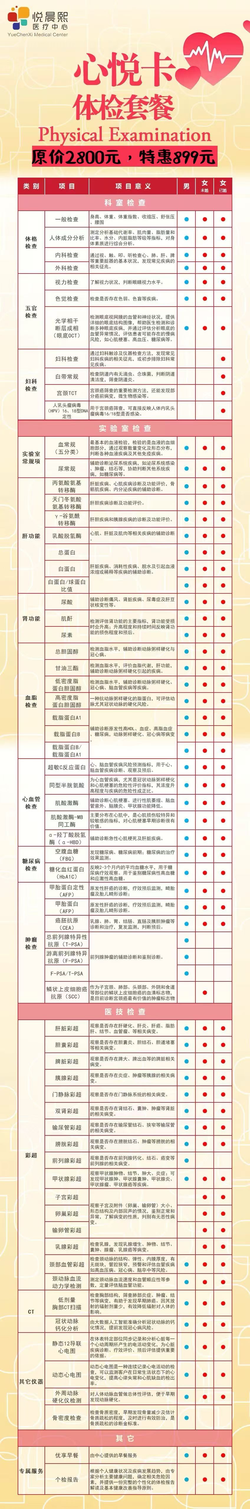 心悦卡全面体检套餐,适合青壮年朋友:包含肺部和钙动脉CT、肝胆7项、血脂7项、幽门螺杆菌抗体检测、糖尿病、肾功能3项、心血管5项、高发癌症7项、肝胆脾胰双肾输尿管膀胱(乳腺子宫卵巢、前列腺)和甲状腺、门静脉、颈部血管、颈动脉彩超、心电图、外周动脉和骨密度仪器检测等