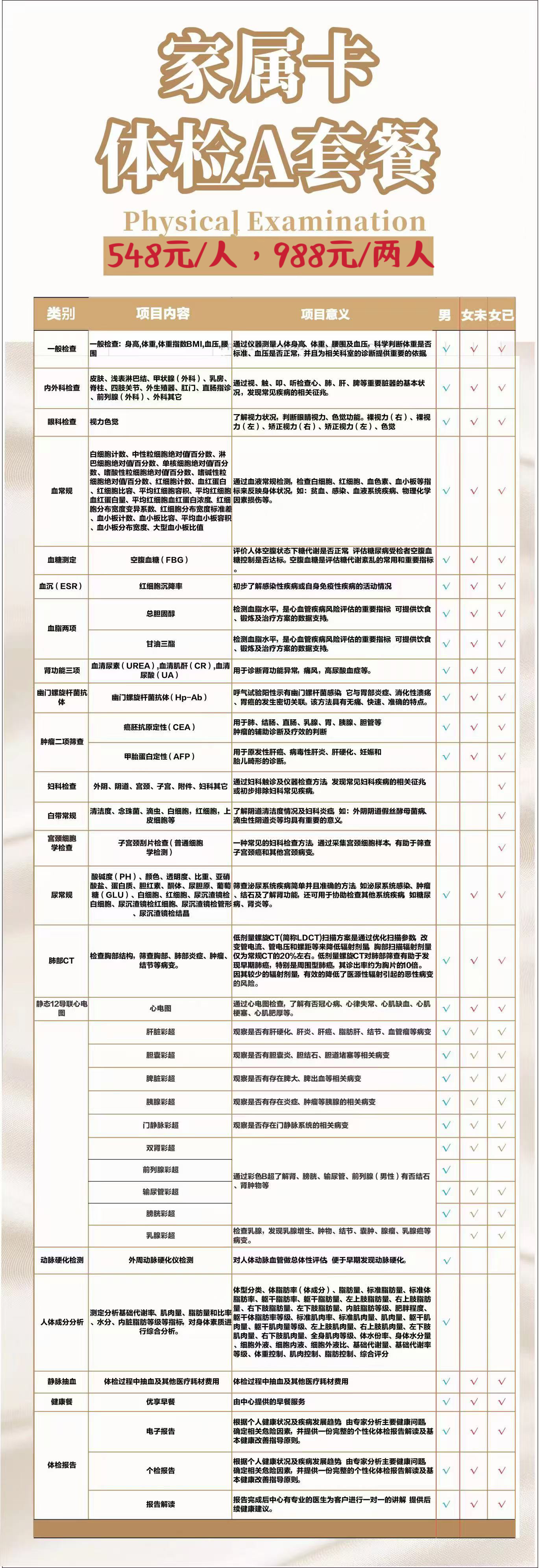 A套餐基础全身体检,适合上班一族:包含肺部CT、幽门螺杆菌抗体检测、肾功能三项、心电图、肝胆脾胰双肾输尿管膀胱(乳腺)彩超、动脉硬化、癌症2项等
