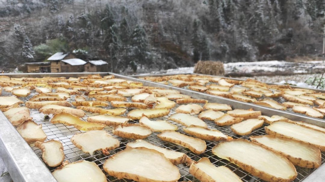 干天麻片,使用空气能烘干机和太阳晒相结合,烘干天麻。