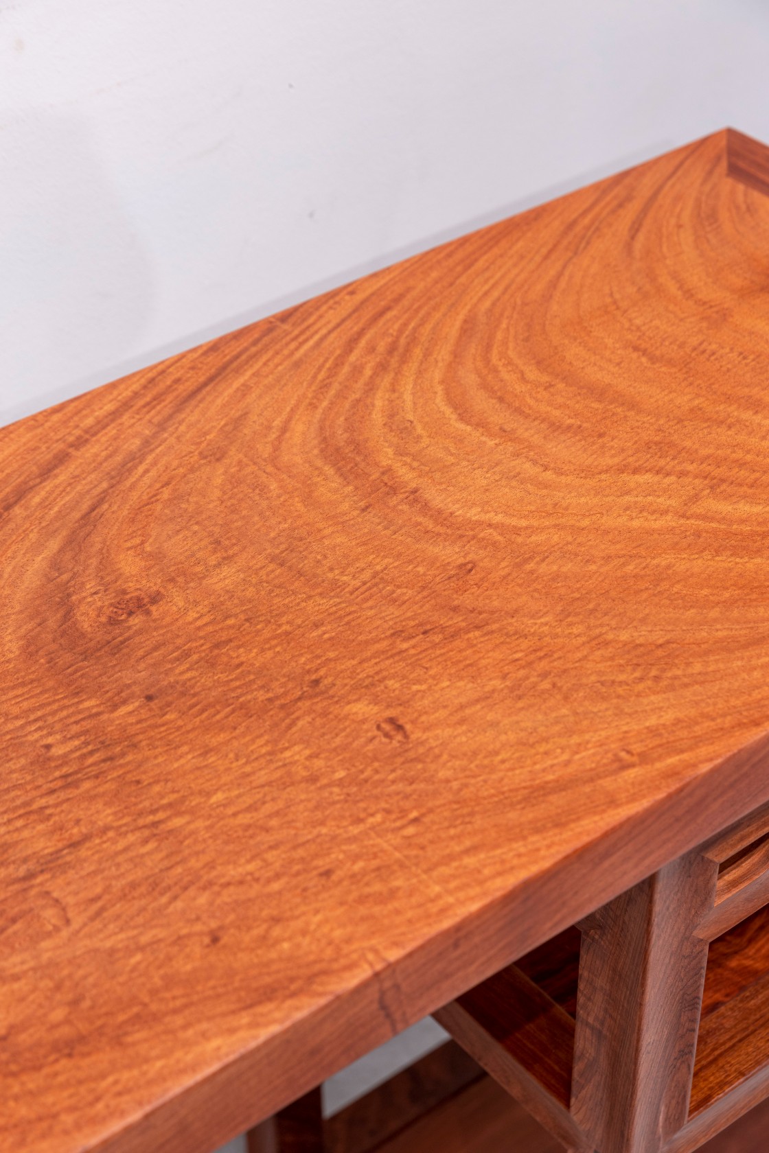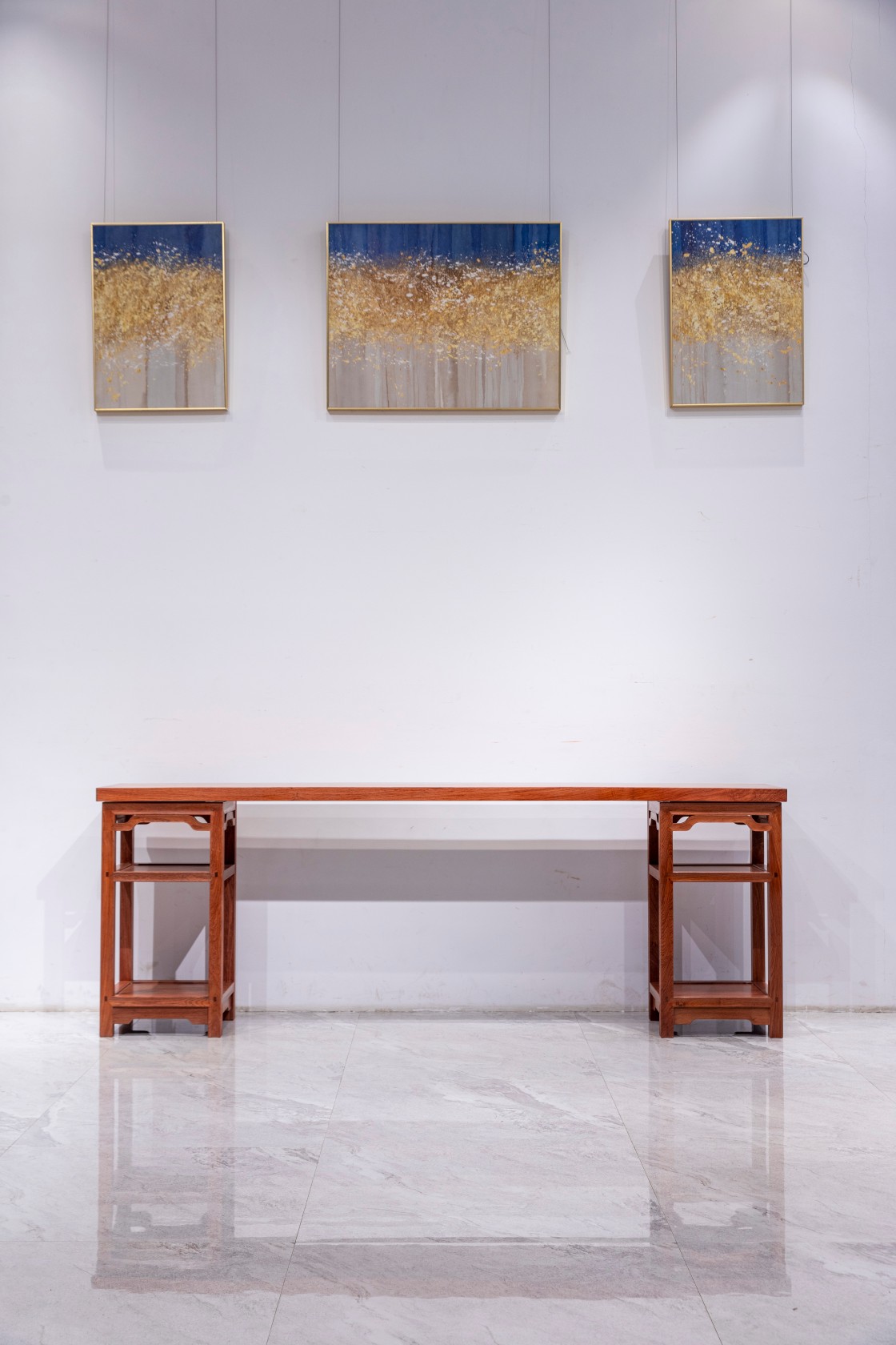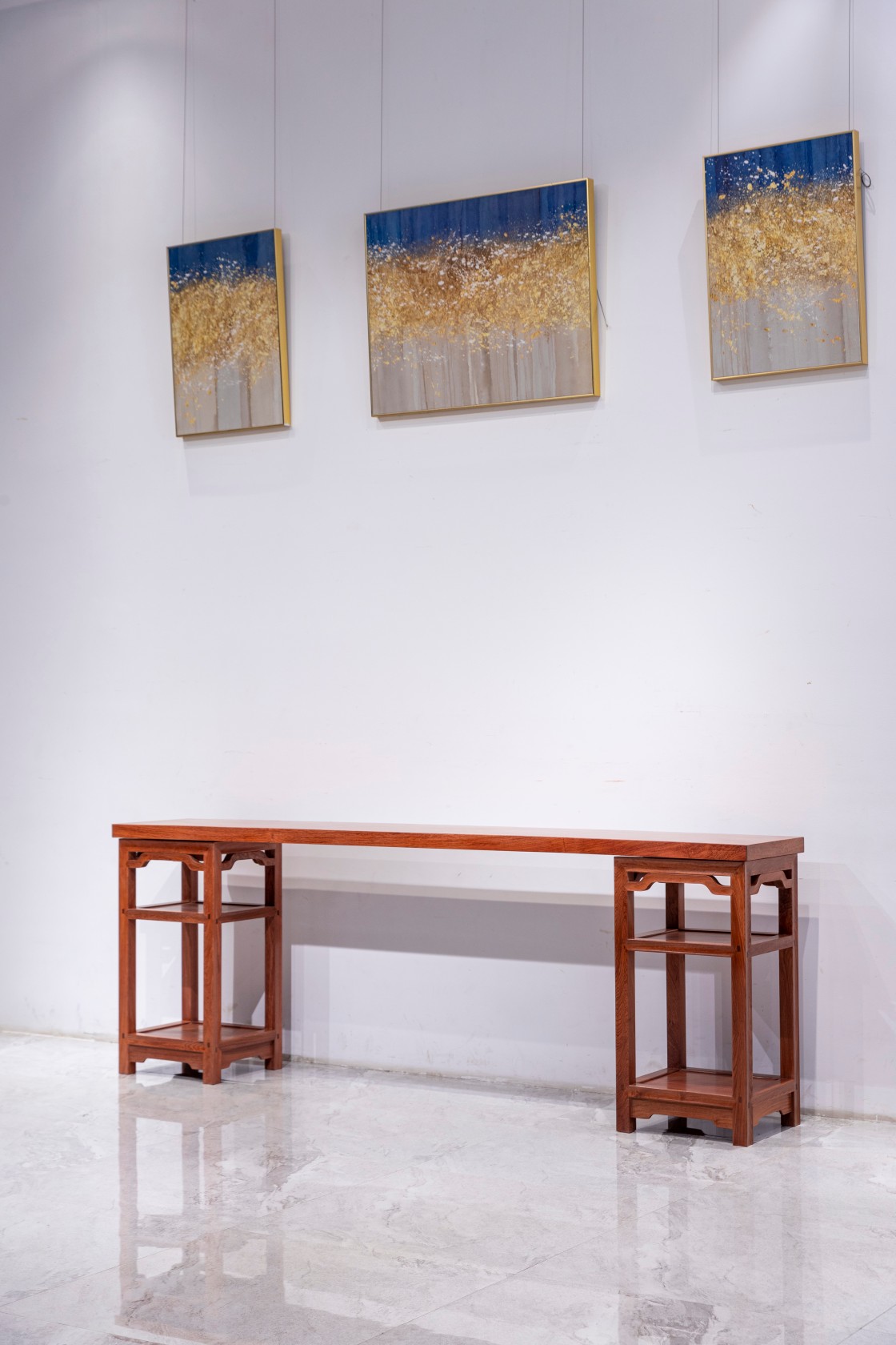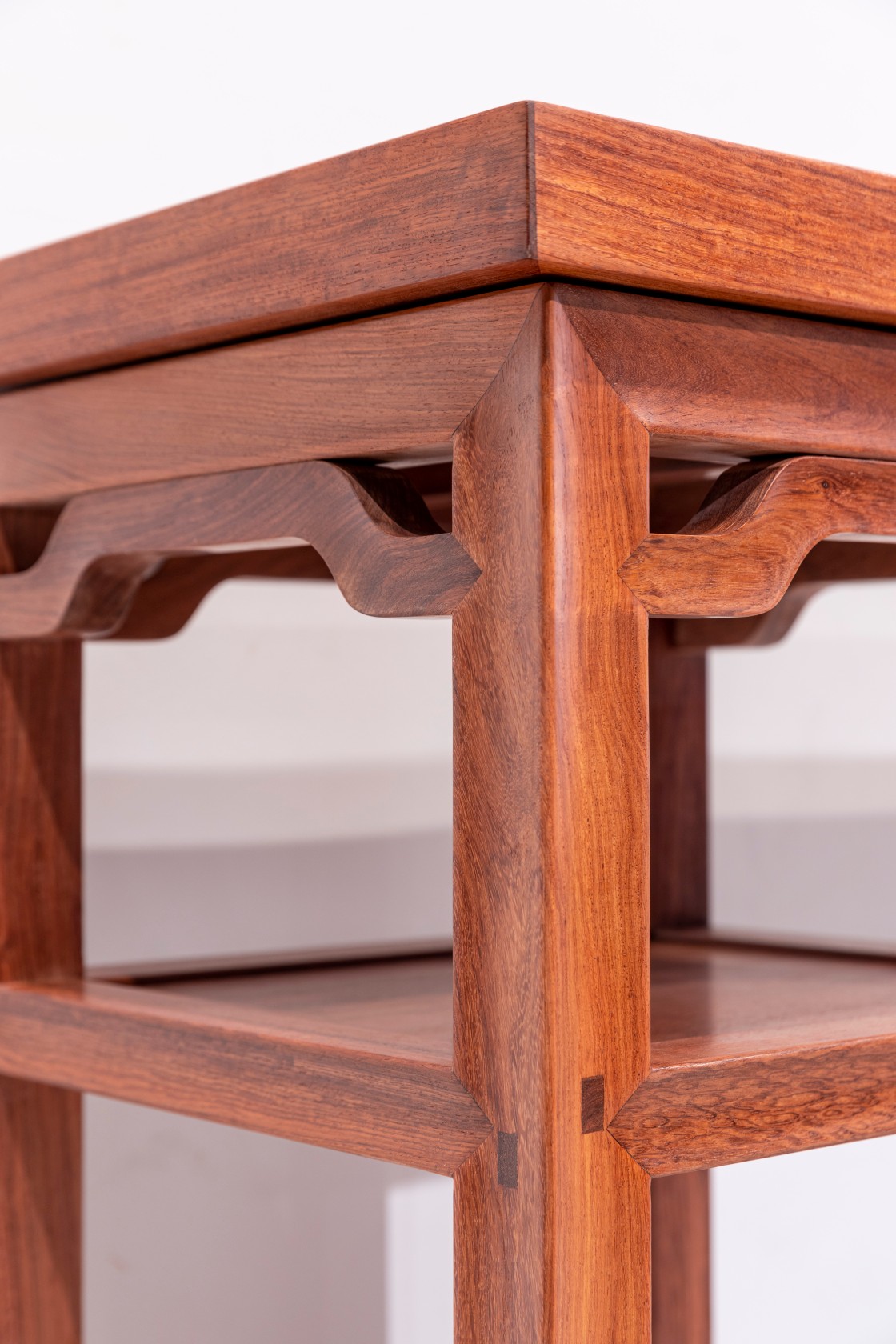 此架几案良材匠制,出得厅堂。案面独板斫制,宝光内蕴,精磨润泽如玉,木纹順直细腻,局部见水波龙胆,两头改良式封榫更抗缩涨。造型简练,齐整大方。架几框架四面平式结构,顶牙罗锅、屉框、管脚枨,以大格肩榫与腿足相接,管脚枨下设刀牙板。架几看面皆打洼,形成凹棱状,颇增平面变化。打洼工艺于家具上之应用以明代为盛,福建地区家具亦颇习见。整器构件精湛,风华无锁。顶面边框、顶牙罗锅枨、腿足各4根屉框、管脚枨、牙板亦各4根屉板3块,红桥红微改良复刻,较原物增上下2屉板合計27构件,无丝毫琐碎。