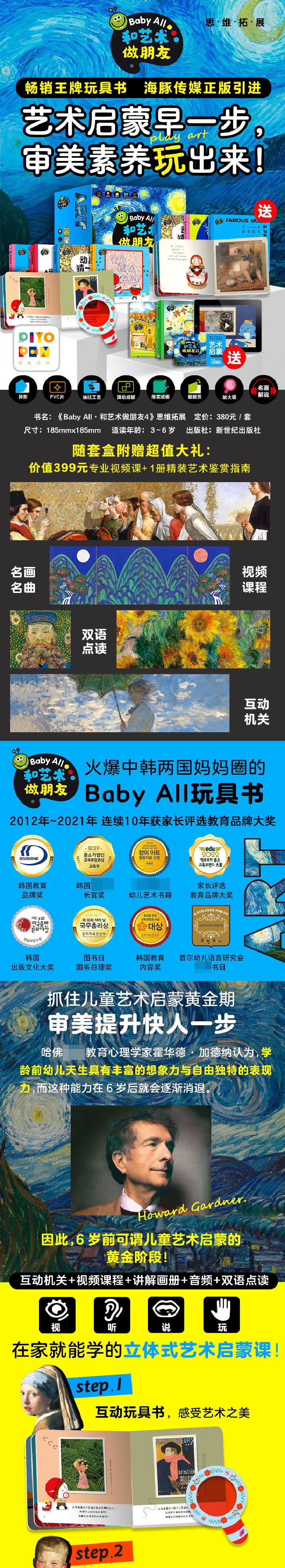 《Baby All·和艺术做朋友》是一套为2-6岁小朋友准备的艺术启蒙玩具书,通过海量名画名曲和精心设计、花样百出的互动机关开启幼儿的艺术启蒙之路,涵养孩子的艺术审美素养。
