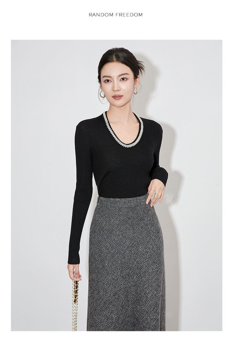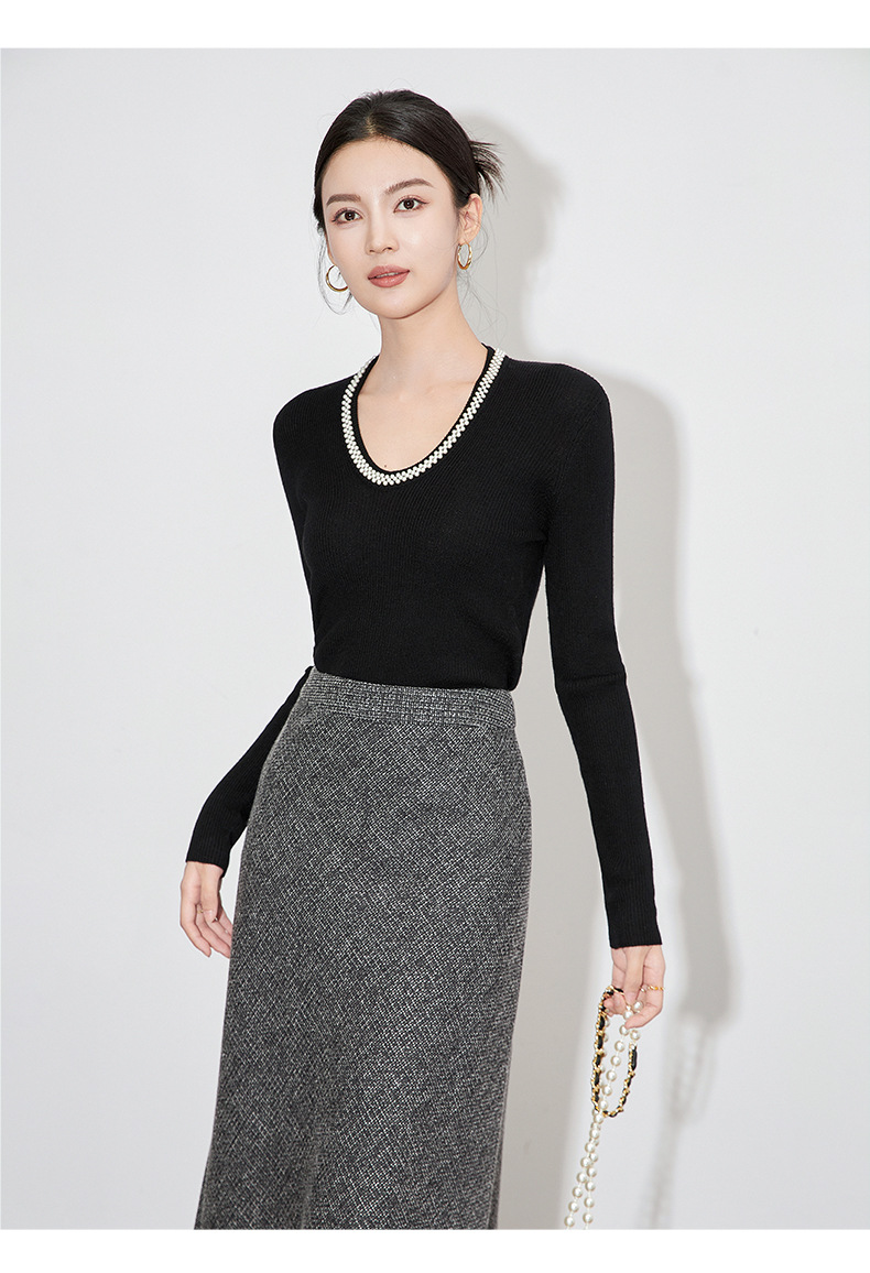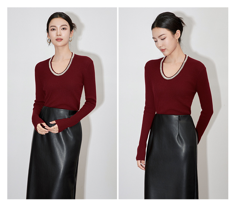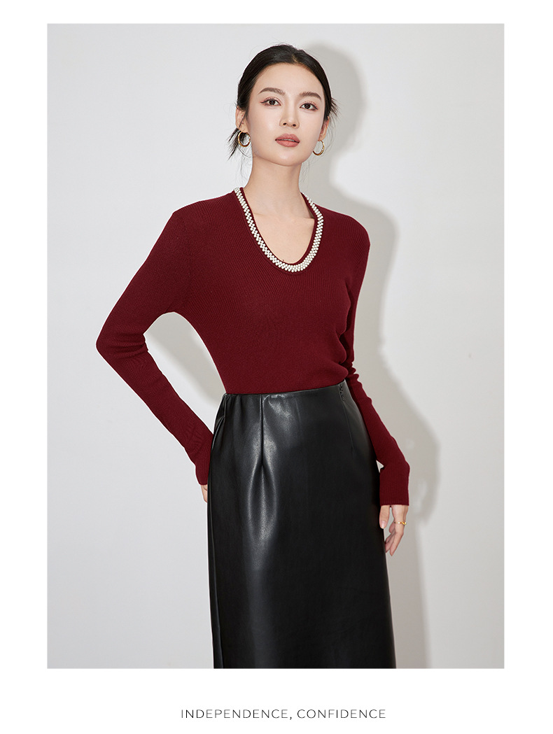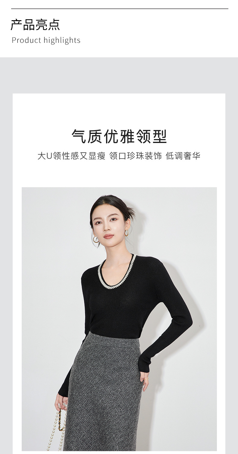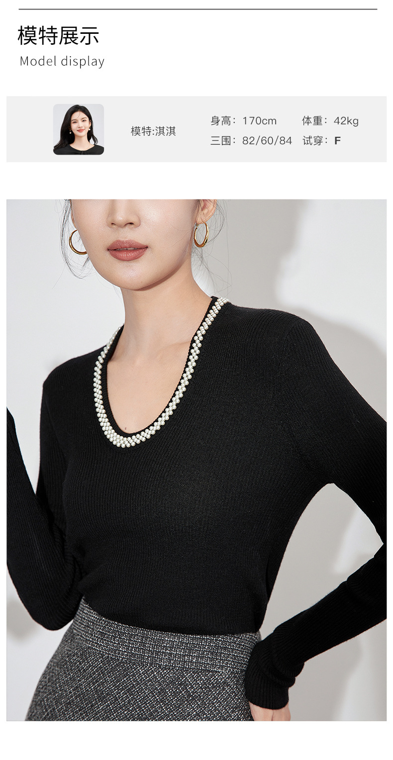 【高货】全新升级【铂金会员220/天猫289/差价69】(34732) 洛诗琳法式重工优雅气质重工U领珍珠绵羊毛针织打底上衣女