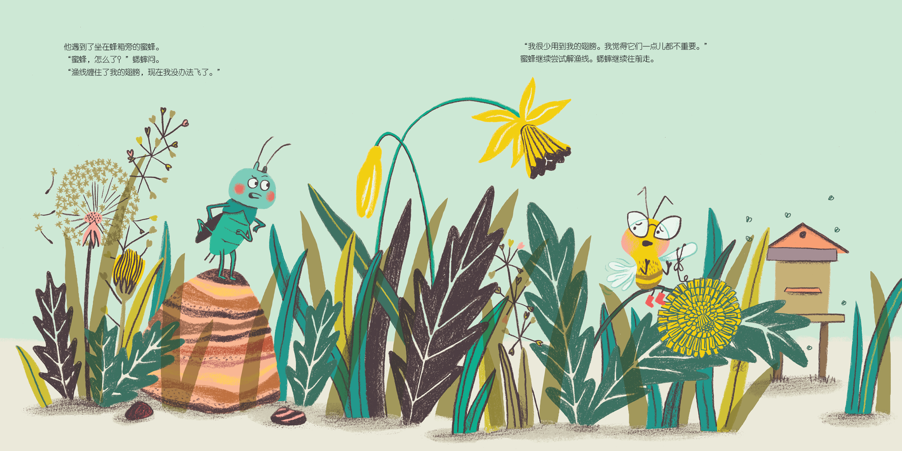 蜜蜂继续尝试解渔线,蟋蟀继续往前走。