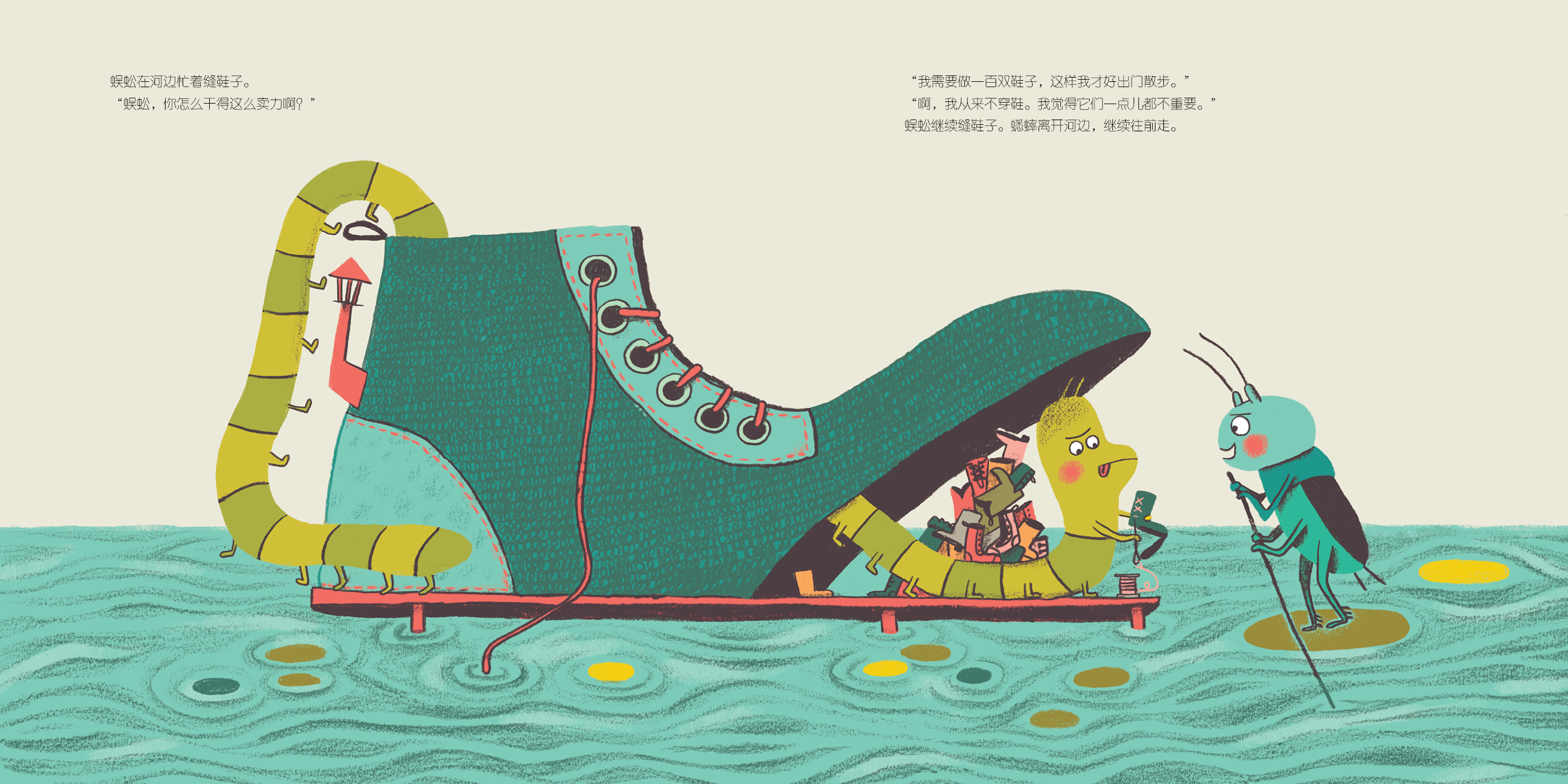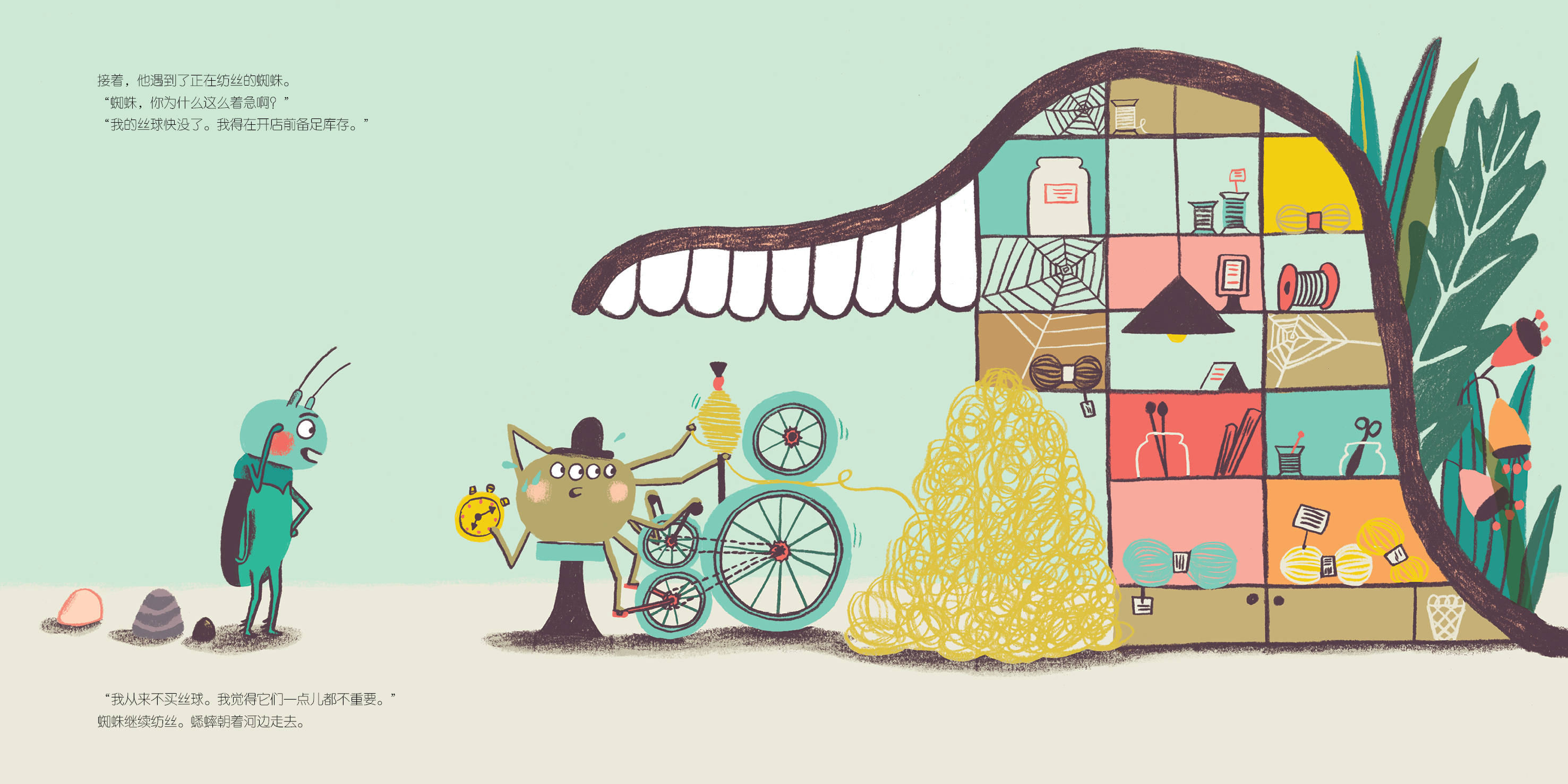 蜘蛛继续纺丝。蟋蟀朝着河边走去。