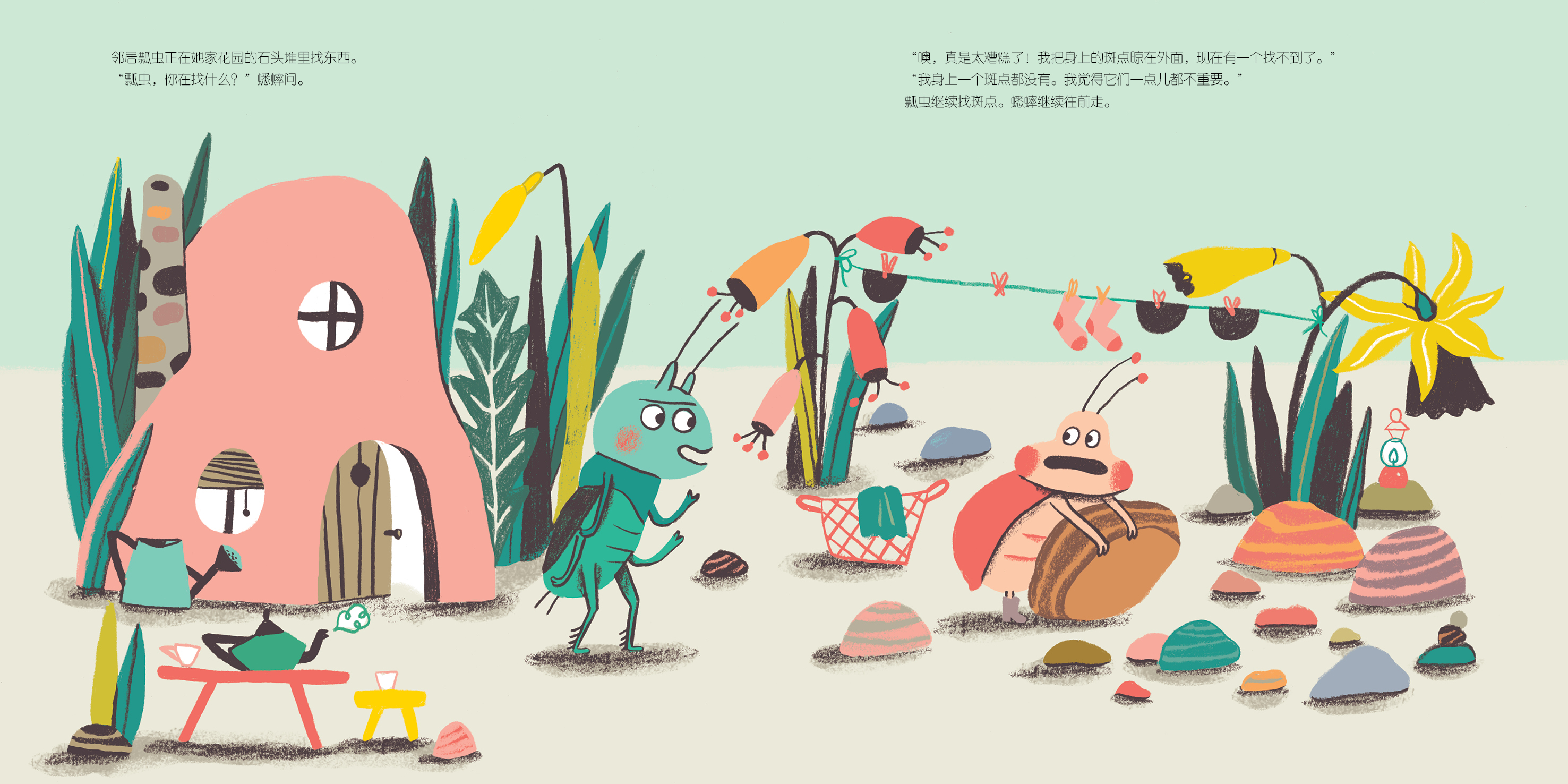 瓢虫继续找斑点,蟋蟀继续往前走。