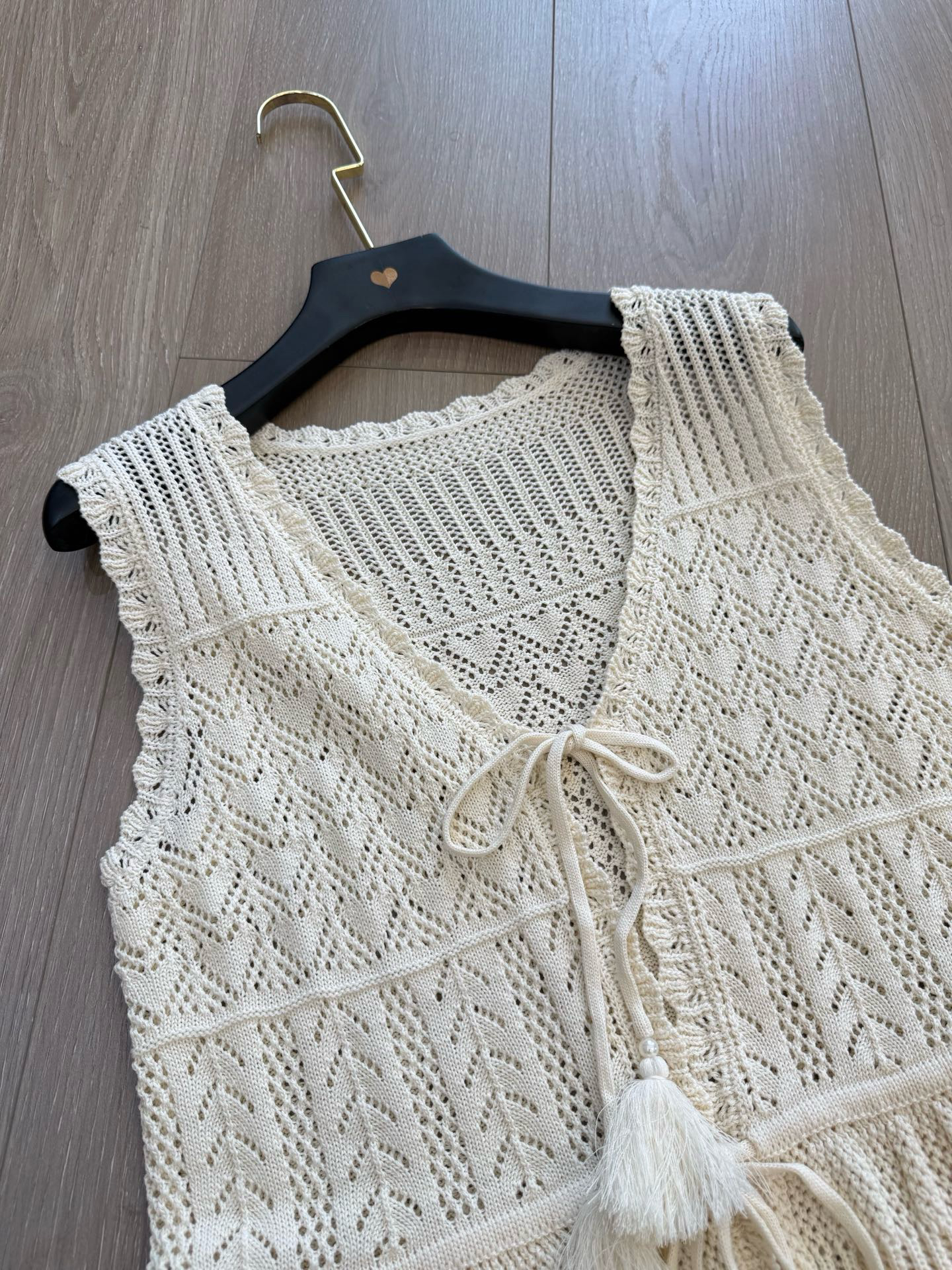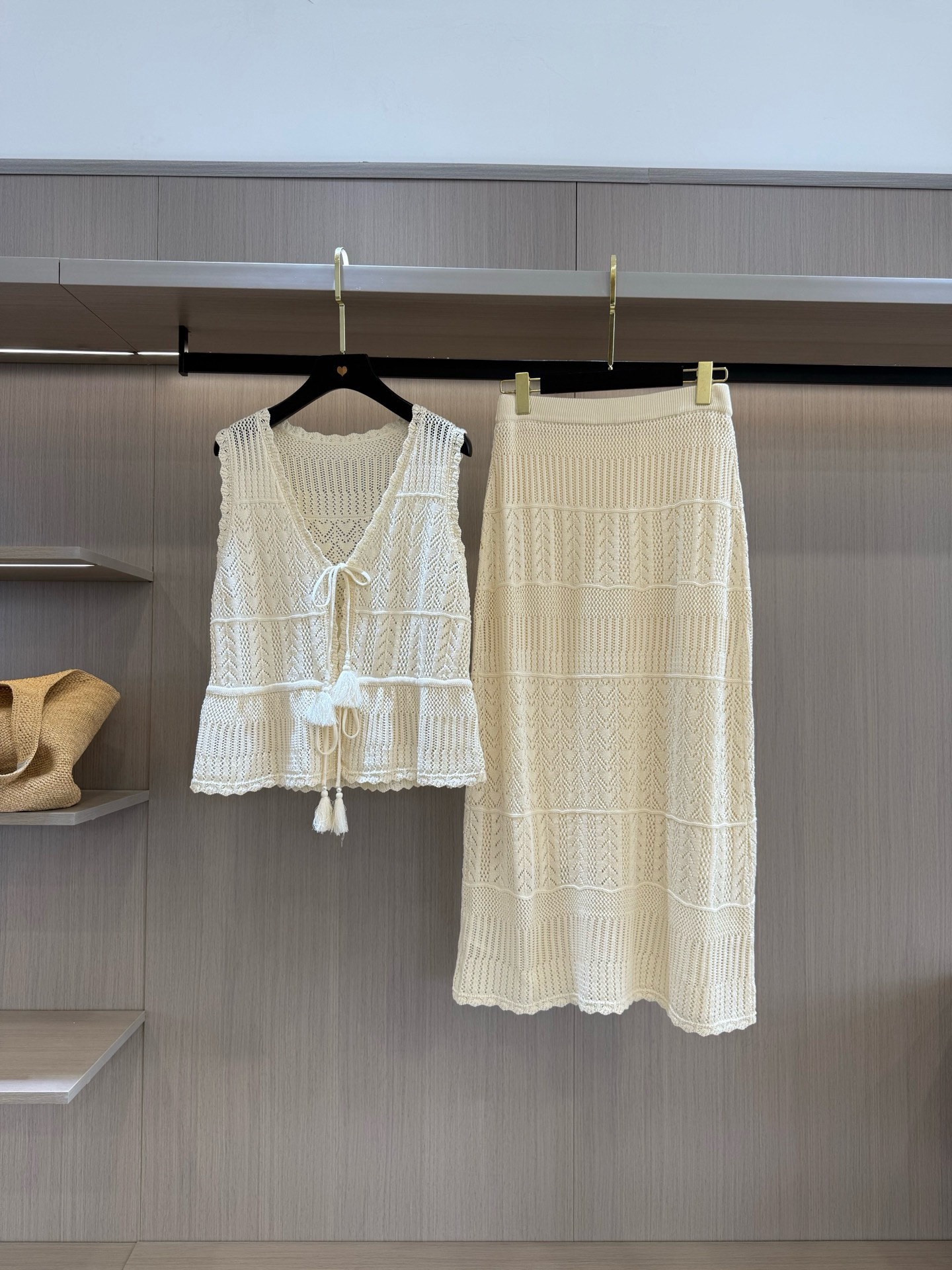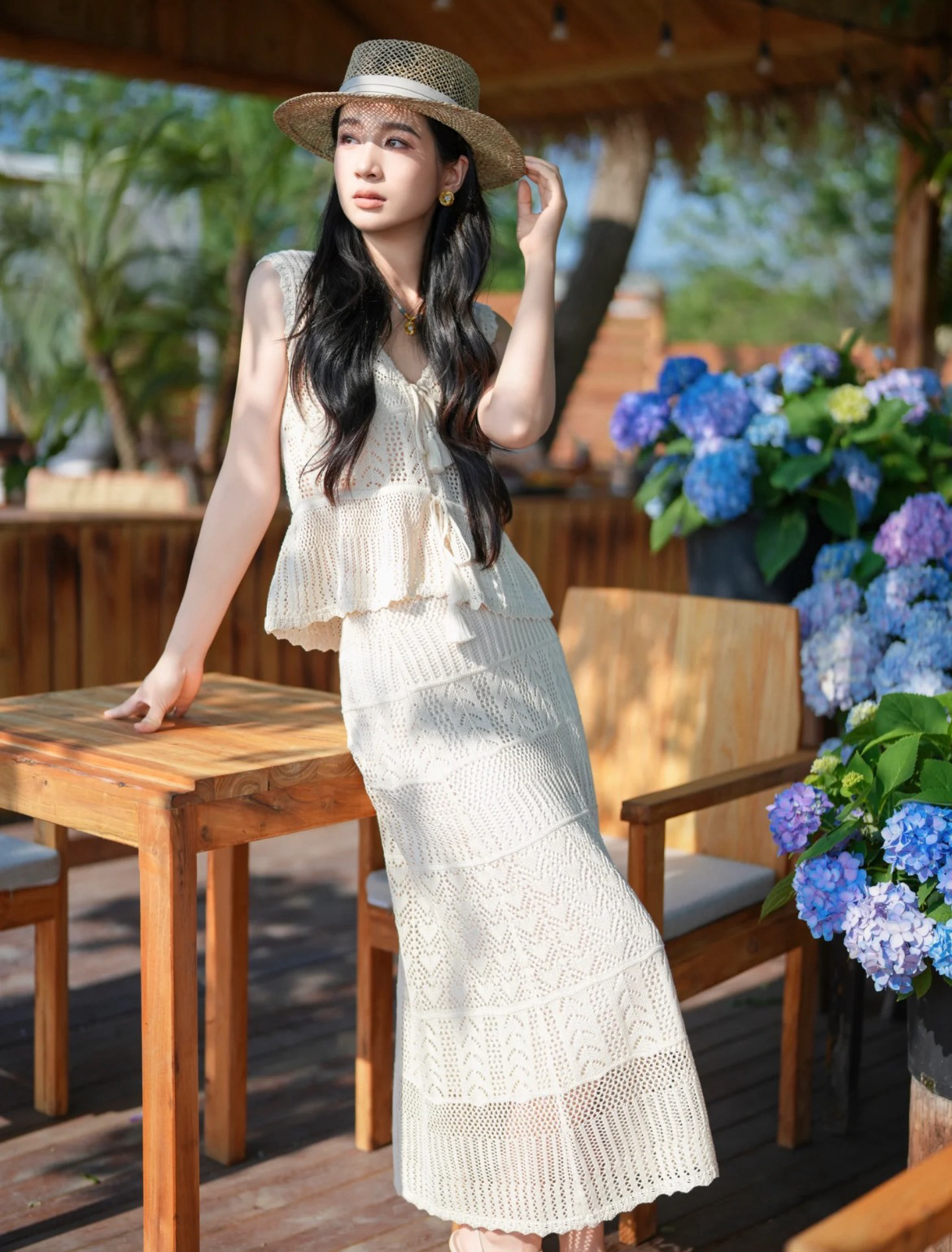 🔺𝐅𝐚𝐛𝐫𝐢𝐪𝐮𝐞 中世纪复古文艺镂空亚麻编织度假套装 镂空针织亚麻背心➕半裙套装