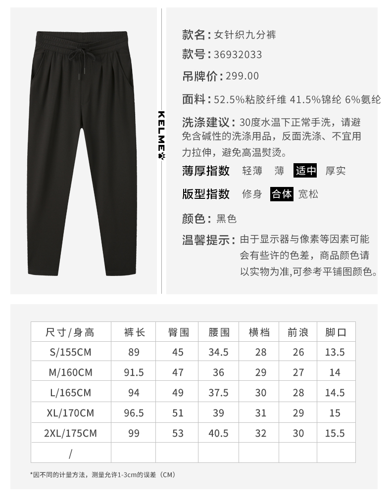 kelme 卡尔美 秋冬新款纯色百搭休闲直筒黑色长裤棉裤运动卫裤女