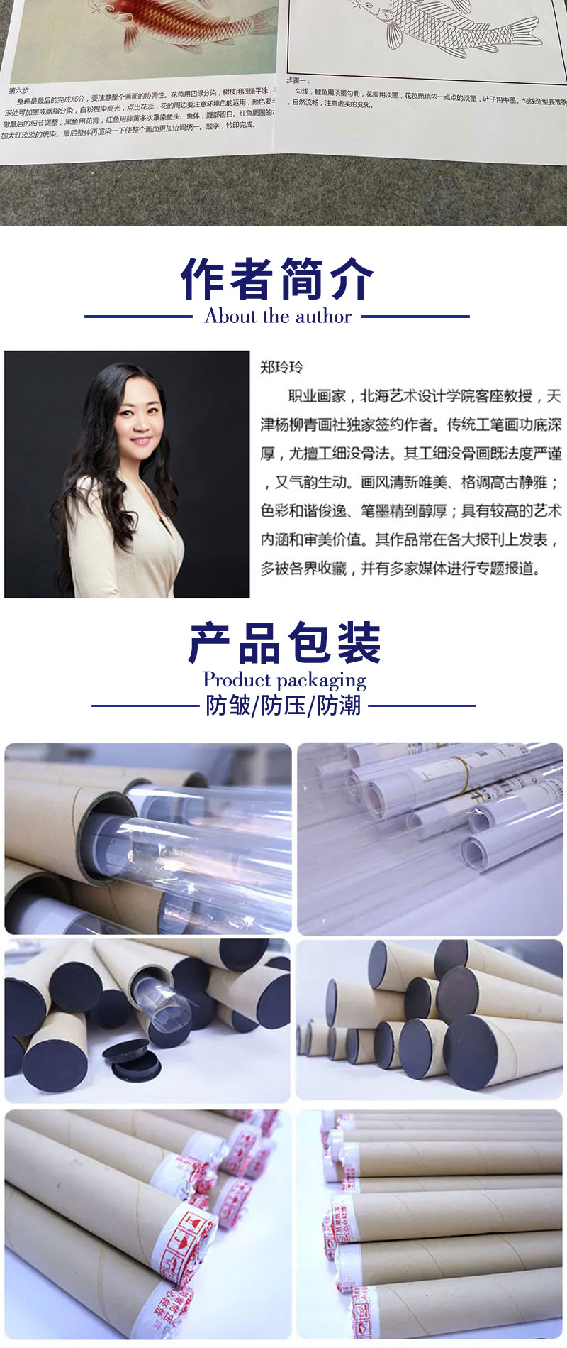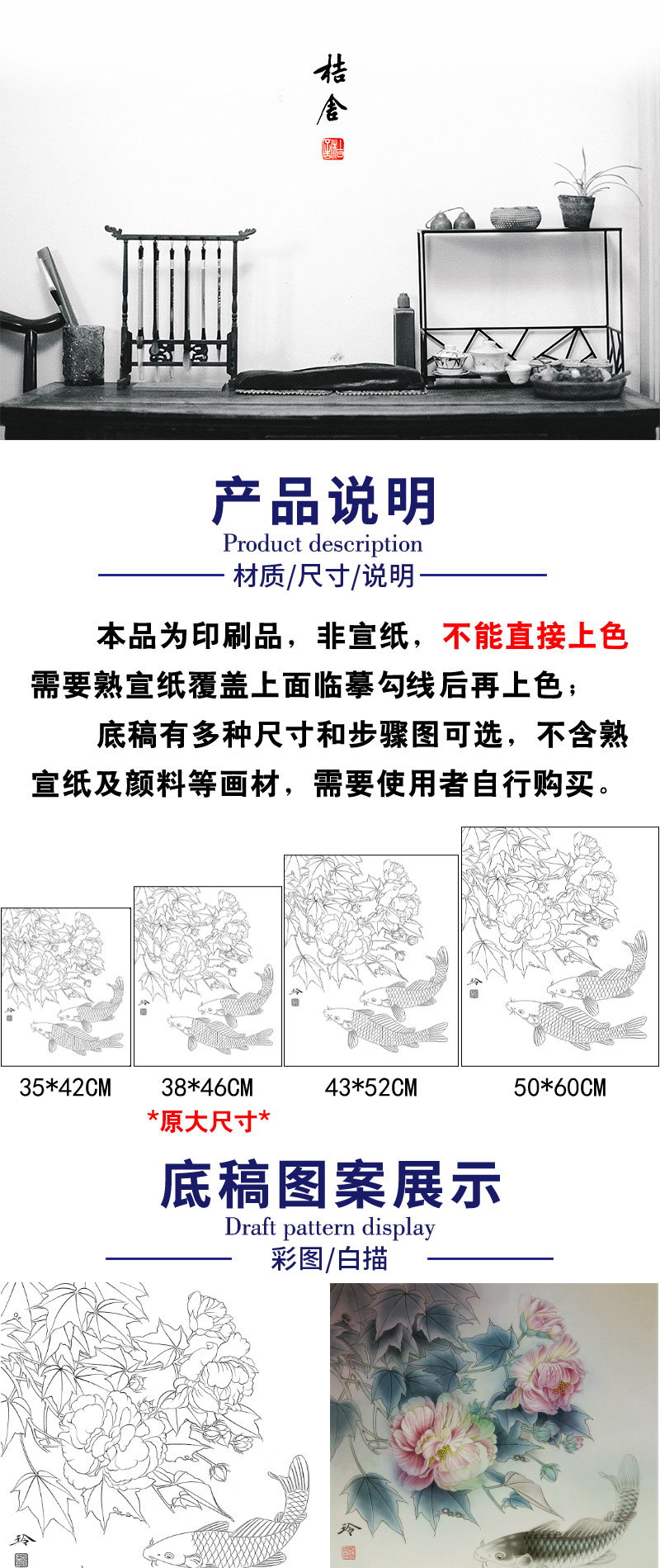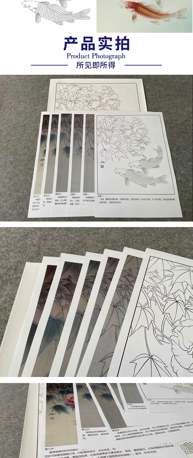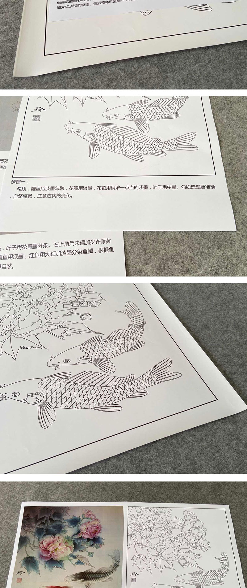 【有步骤、大彩图】郑玲玲工笔画白描底稿《锦上添花》鲤鱼初学者临摹花鸟线稿ZL39