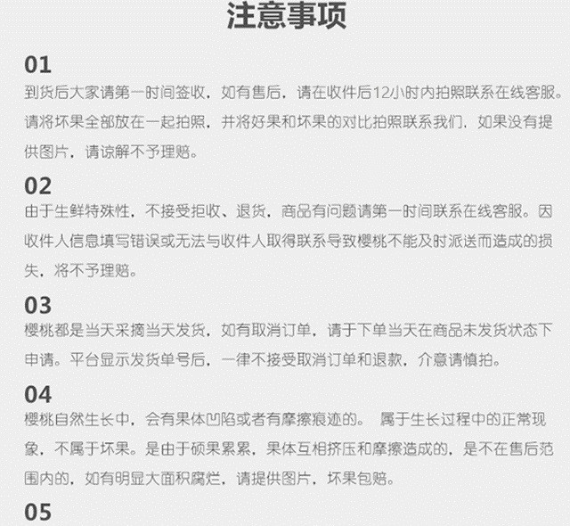 4.生鲜水果因为客户原因无法收取或者拒收一律不予赔付。