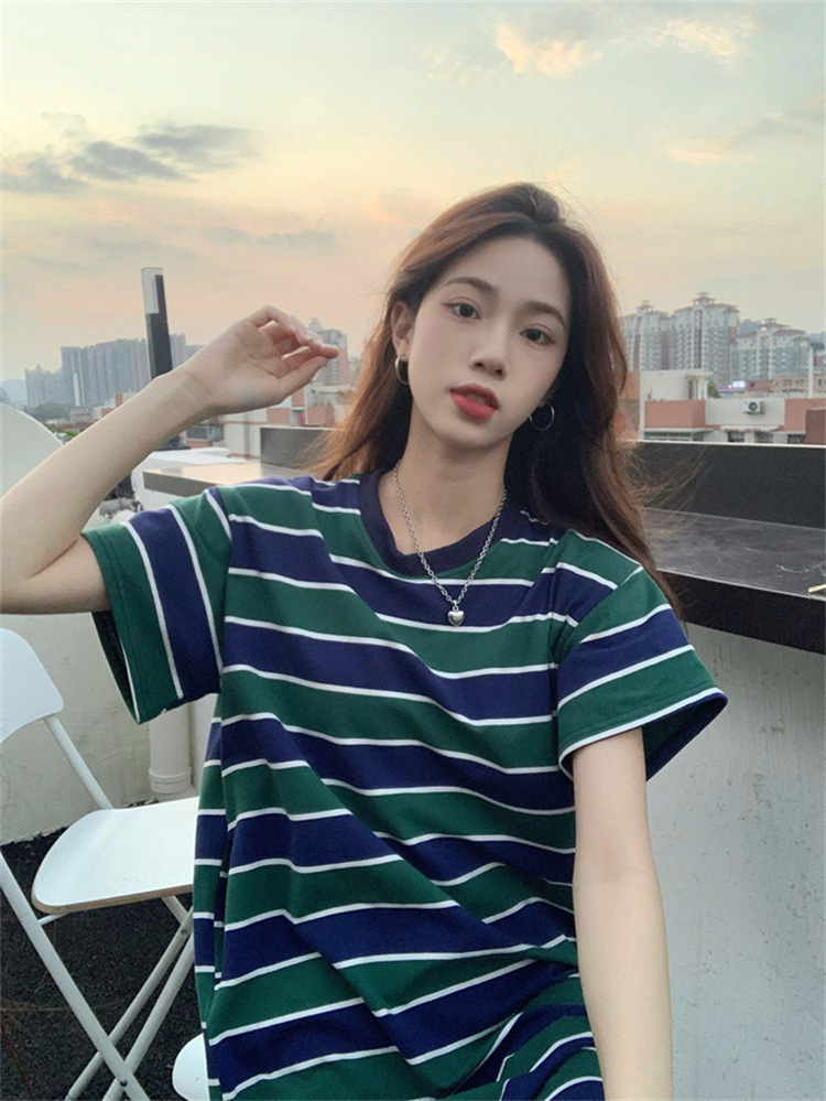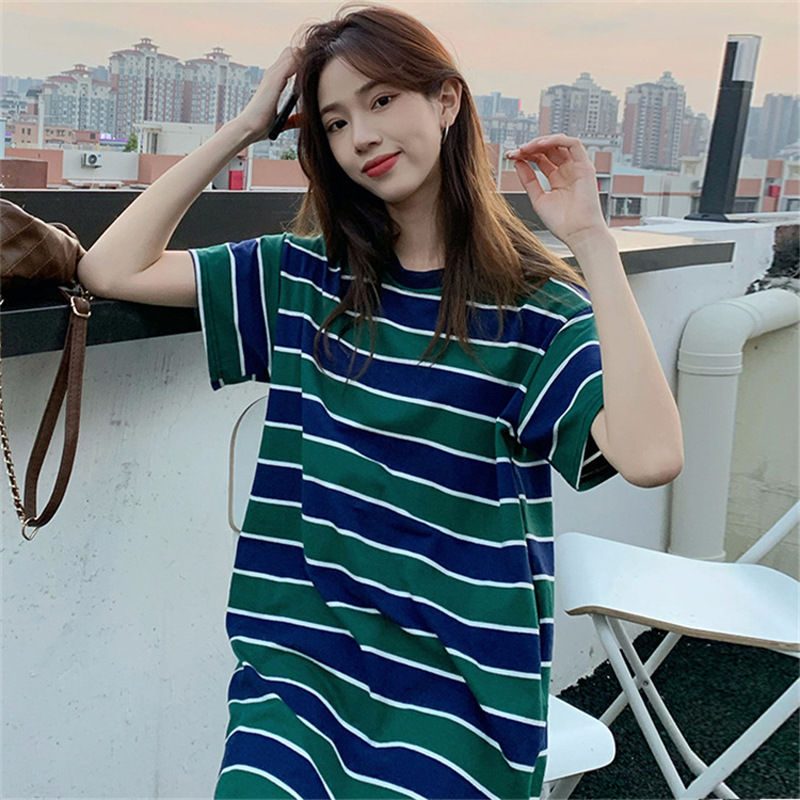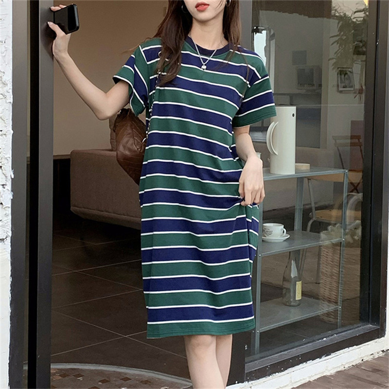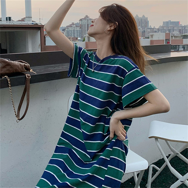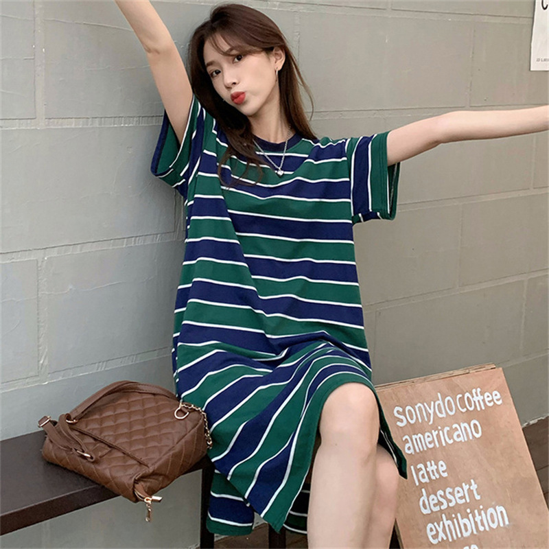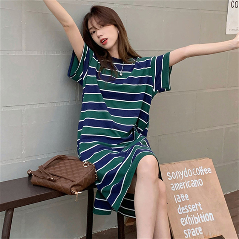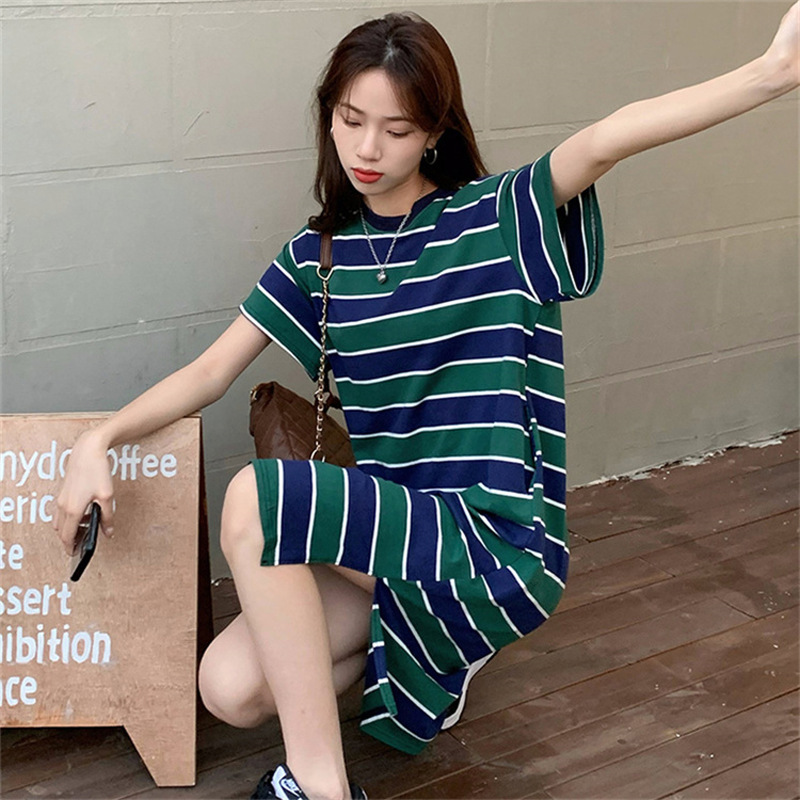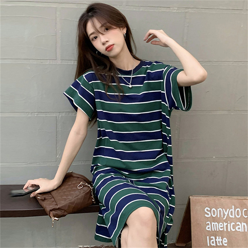2025夏季新款【侧隐藏口袋 条纹连衣裙女纯棉 】韩版宽松开衩显瘦中长款T恤裙子