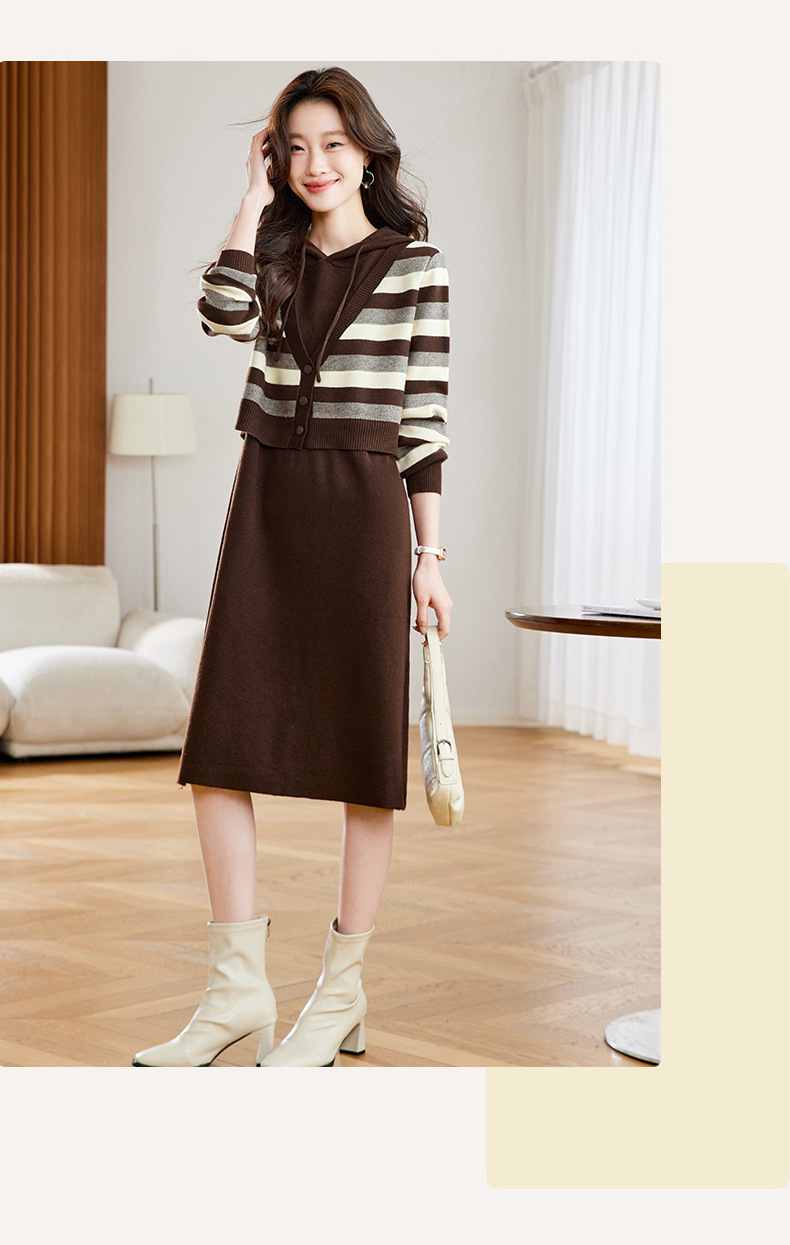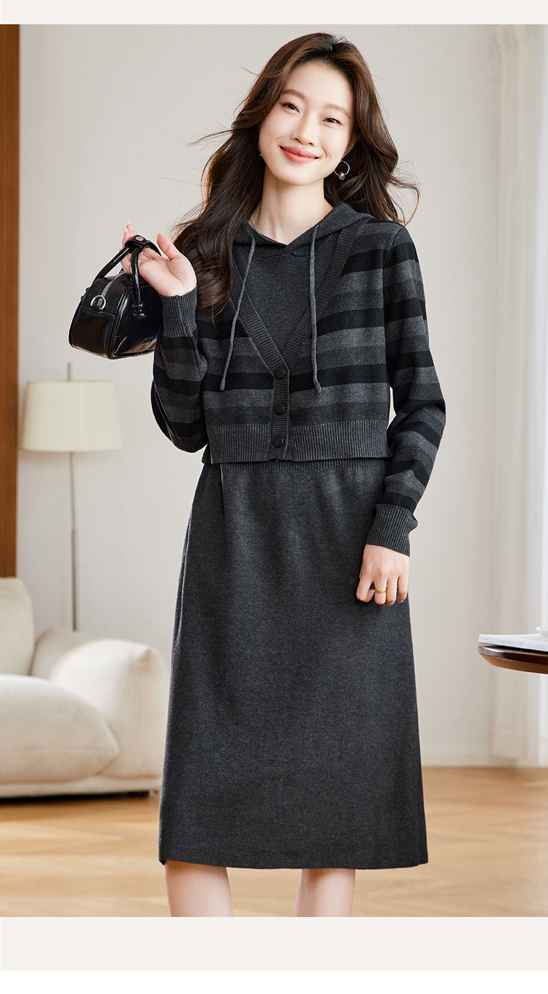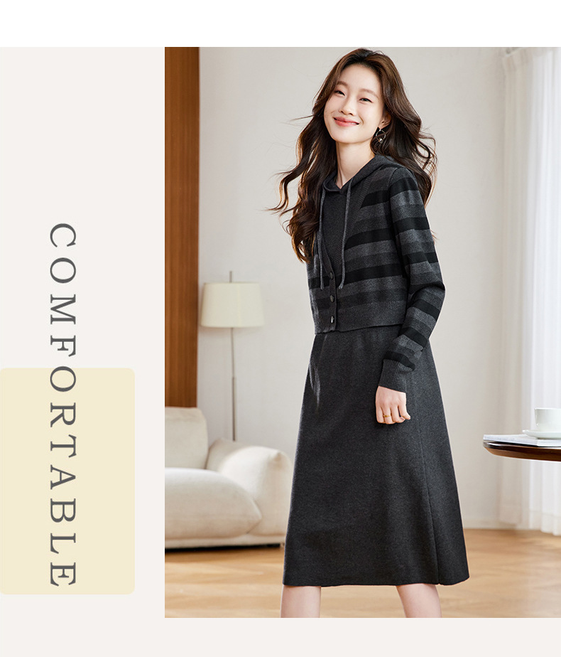 丁摩 秋冬女装连帽假两件针织连衣裙2813 商品图0