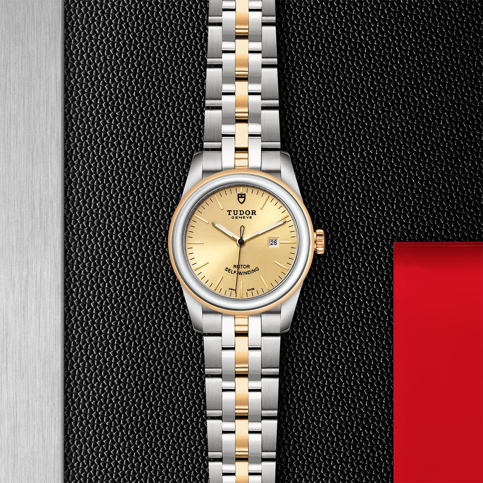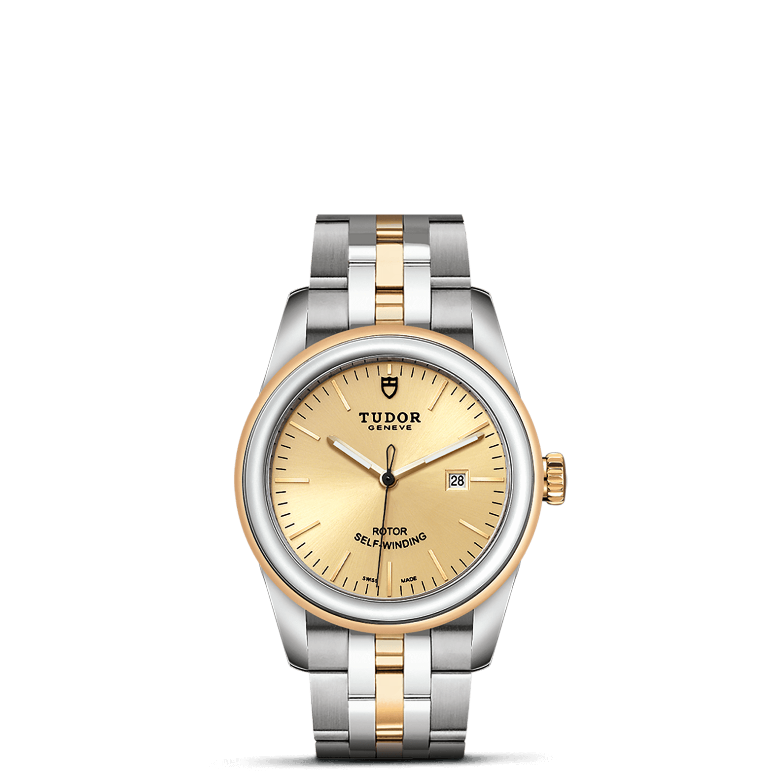 旋入式上链錶冠,饰以帝舵表标志;精钢覆有0.1毫米18K黄金薄层
