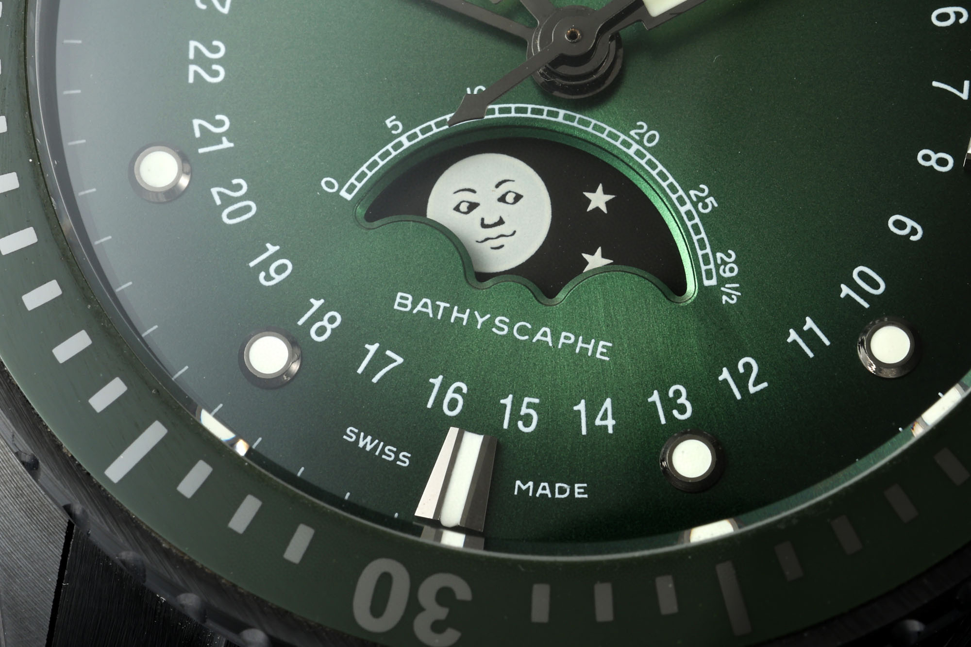 1、集多功能于表盘显示(12 点钟位置的窗口显示星期和月份,以及 6 点钟位置的子表盘显示月相,并带有 Blancpain 标志性的优雅月面