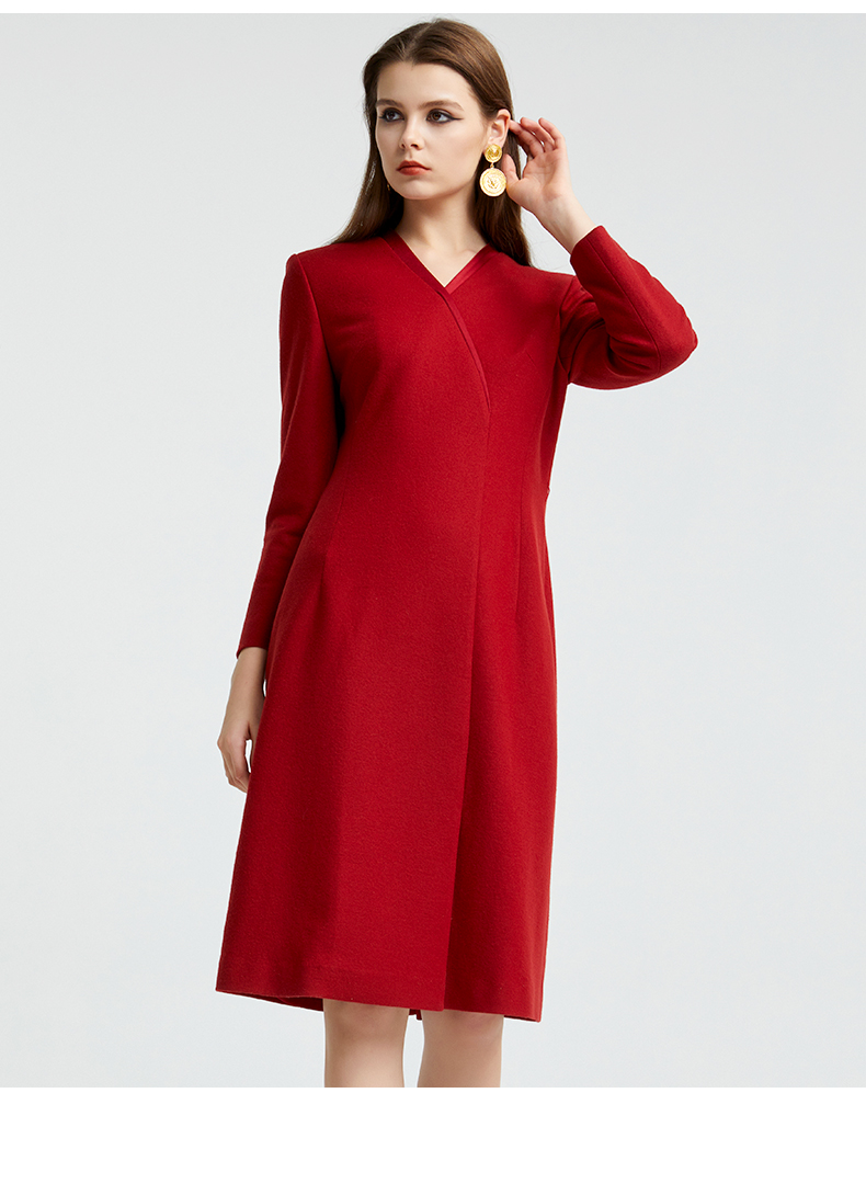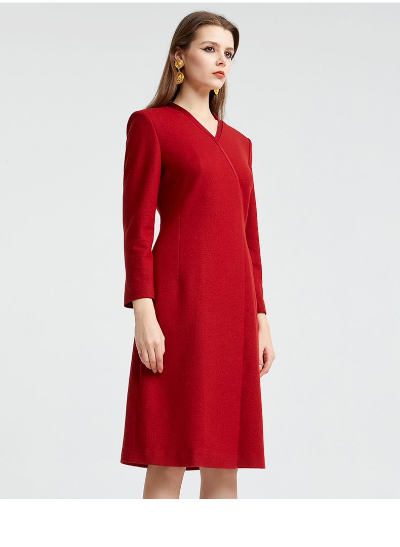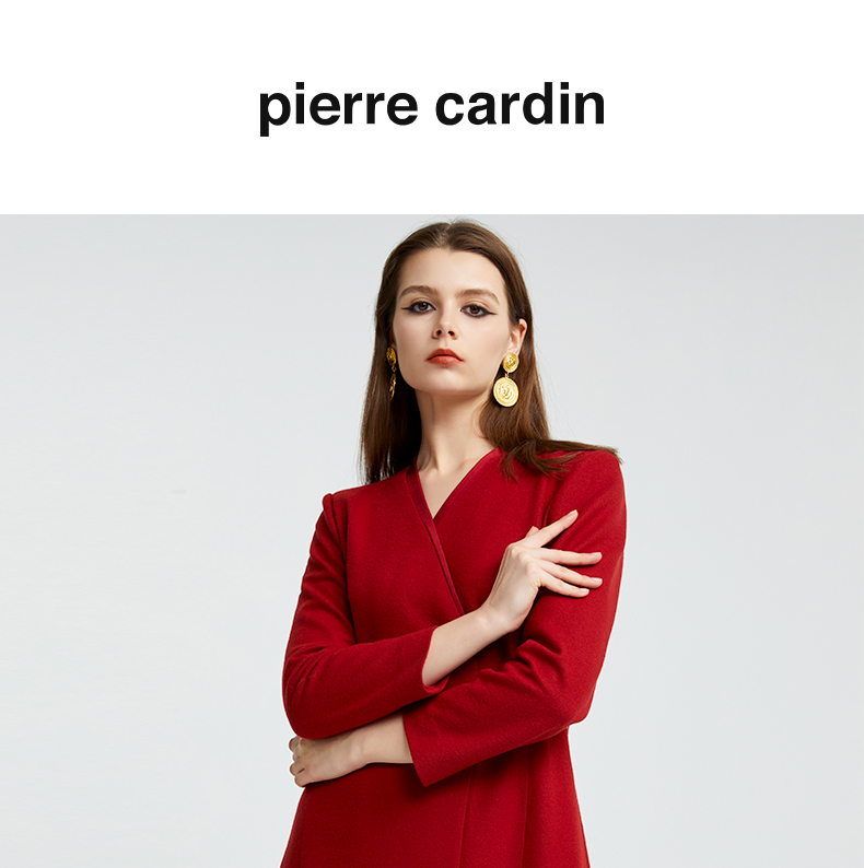 皮尔卡丹女装专柜正品酒红色长袖连衣裙小立领A字裙P93DL25R2