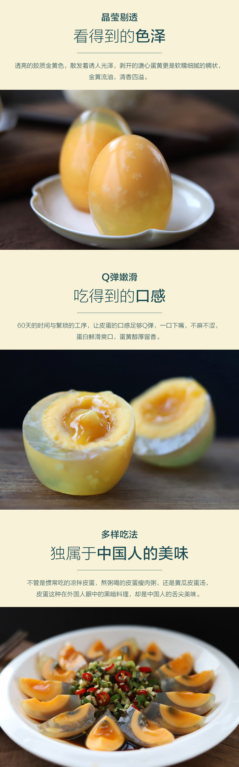 品名:生态皮蛋(松花蛋) 规格:6枚简装、15枚普通装、15枚礼盒装 新农人:韩建斌 种植标准:生态鸭蛋,手工制作,无添加 产地:成都 快递:三通一达 发货时效:排单发货 保存方法:置于阴凉干燥处,防止阳光直射和受潮,夏季一定要通风敞口保存皮蛋要裸露,不能戴袋子。 保质期:夏季最佳口感一个月,后面可能会因为保存的环境或温度,皮蛋出现缩水等情况,是正常现象。 注意事项—— 1、皮蛋因表面封泥,干燥易掉,收到有掉泥情况,属于正常现象;.手工做皮蛋,不能统一标准,无流心、无松花、个别较干,个别有些黏壳,不影响食用不予售后,影响到食用,请联系客服售后; 2、夏季高温做出来的皮蛋,比其他季节制作的皮蛋颜色深一些,是正常现象; 售后说明—— 1、夏天做的皮蛋有些黏壳不影响食用的情况,不在售后范围内;皮蛋的口感独特,有淡淡碱味,不以口感喜好售后。 2、.收到快递6小时内及时开箱检查坏果,如有损坏需售后,请提供损坏果子照片,快递面单照片,无照片或超出售后时效无法售后哦(零售价÷总个数×坏果数)。 3、由于顾客电话关机、停机、不接电话联系不上收货人、收货信息有误等原因导致的快递延迟签收,不在售后范围。 |