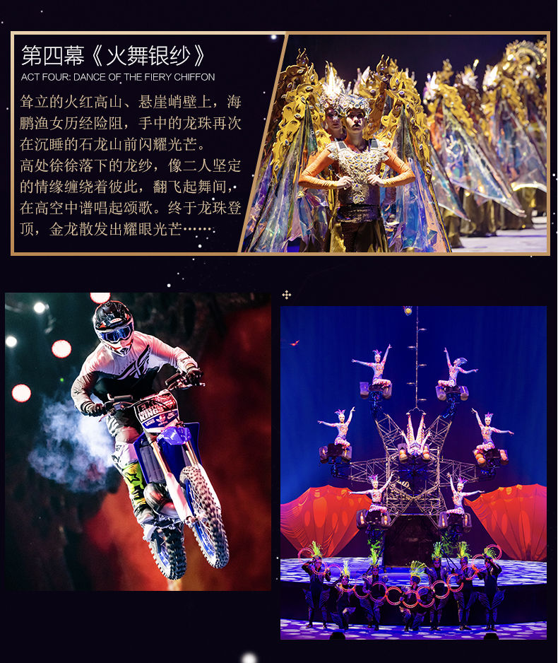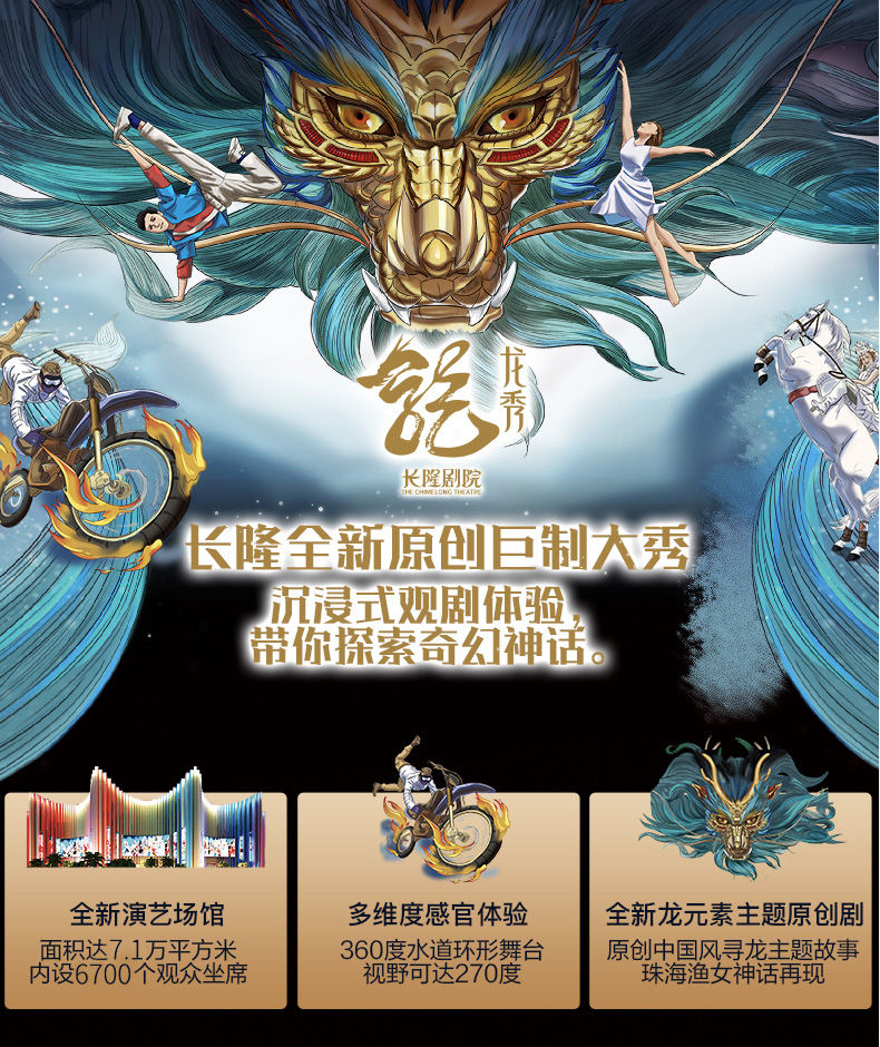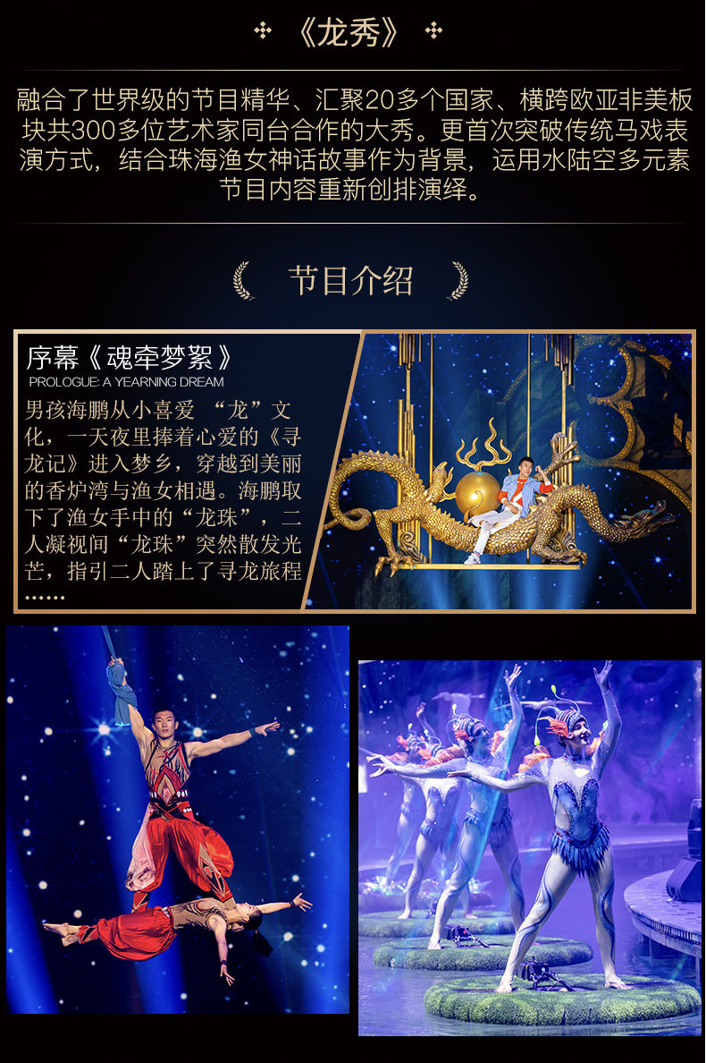 《龙秀》是长隆演艺集20年大成推出的全新顶峰巨作,是把长隆国际大马戏结合中国龙元素主题的一场突破性原创大秀,堪称长隆演艺的又一里程碑。《龙秀》剧情以珠海渔女的神话故事为源头,融合了杂技、舞蹈、滑稽表演、魔术、极限运动、声乐、花样游泳等多种艺术门类,汇聚了来自22个国家、30多支团队、300多名世界各地的优秀马戏艺术家共同演绎。值得一提的是,从半空中的3D飞龙、到大型巡游的盘龙花车、再到水里的游龙,以及演员的服装、节目的音乐,中国龙元素都贯穿始终,旨在向所有中国观众乃至全球观众诠释中国龙所代表的勇往直前、坚忍不拔的精神,这既是对中华民族五千多年优秀文化的传承,更体现了“龙的传人”不断创新发展的文化自信,全力打造成为粤港澳大湾区国际演艺新标杆!