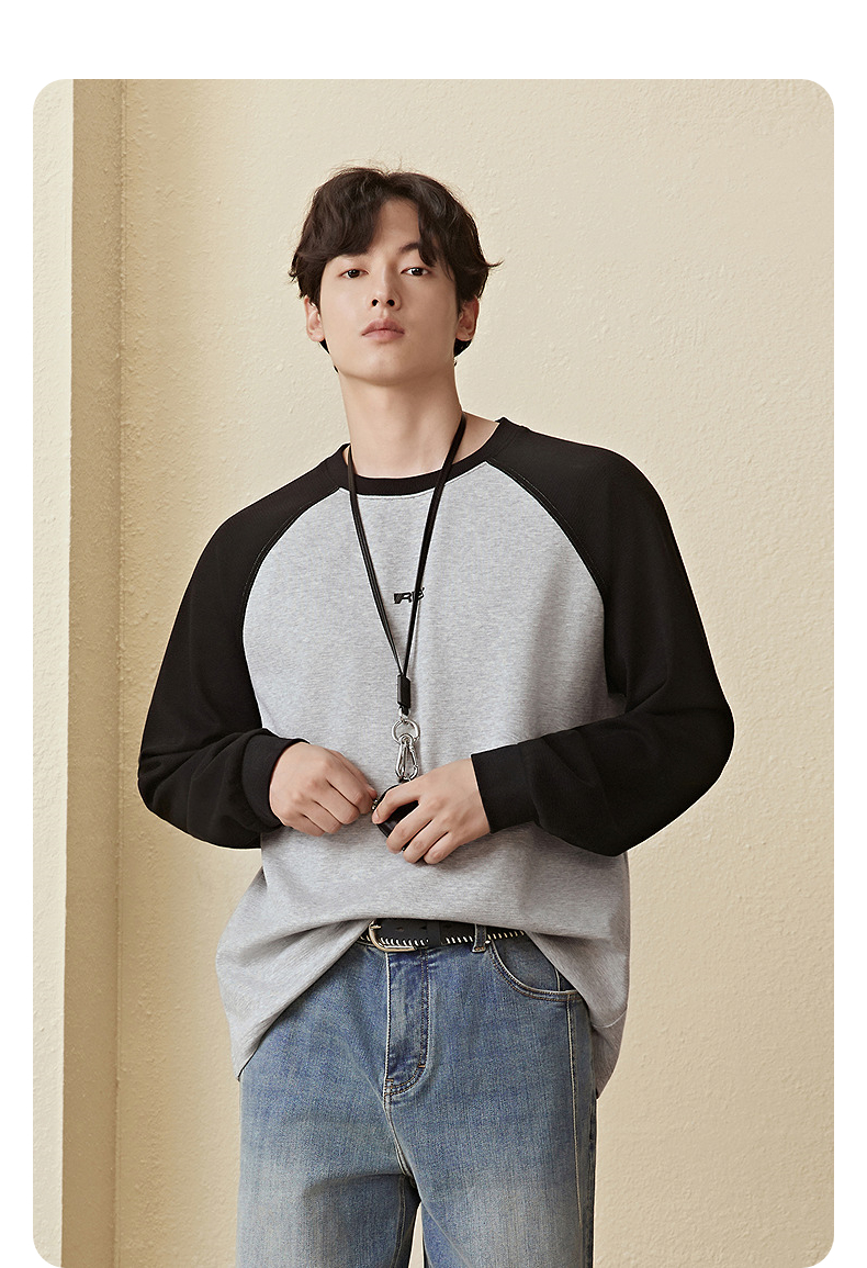 GXG男装 长袖针织肌理撞色拼接长袖T恤插肩袖内搭 2025秋季热卖