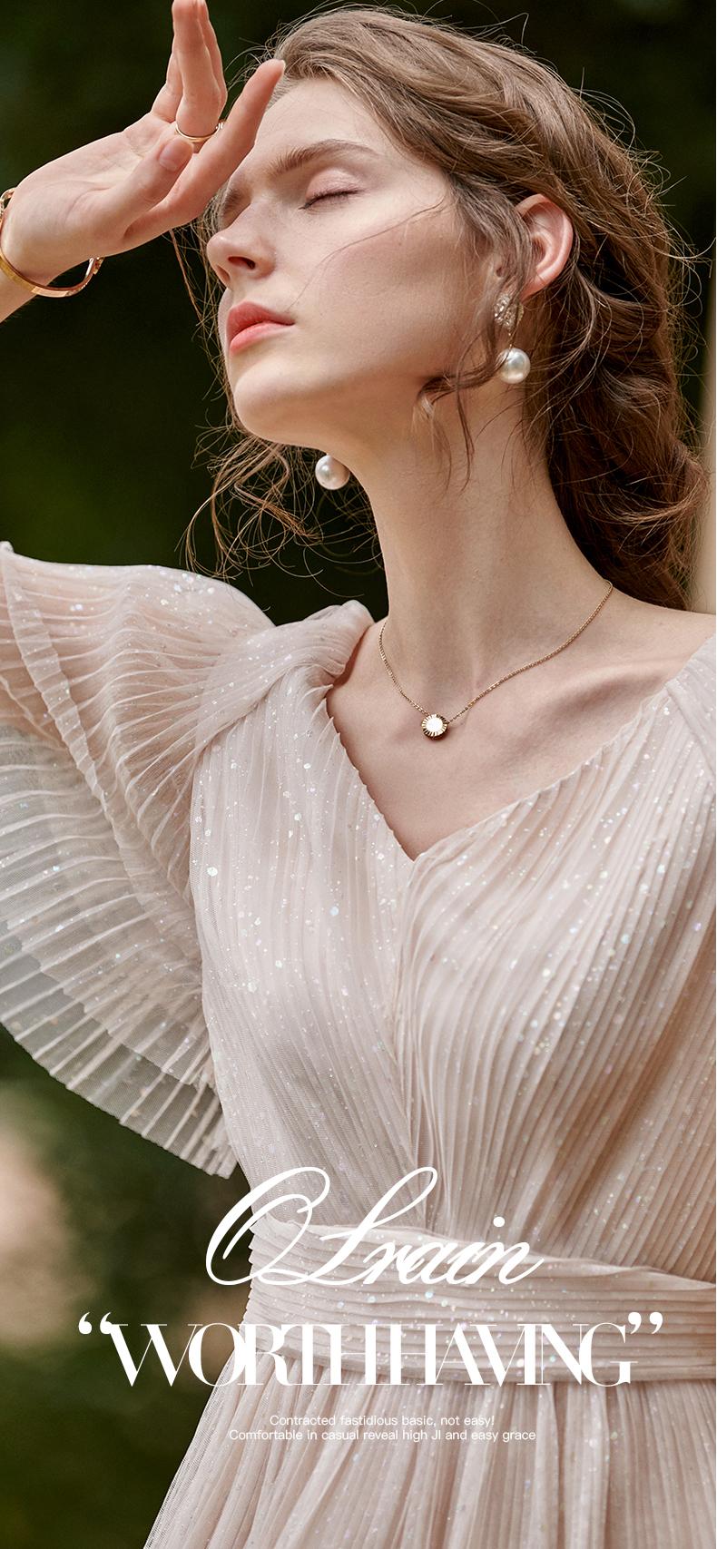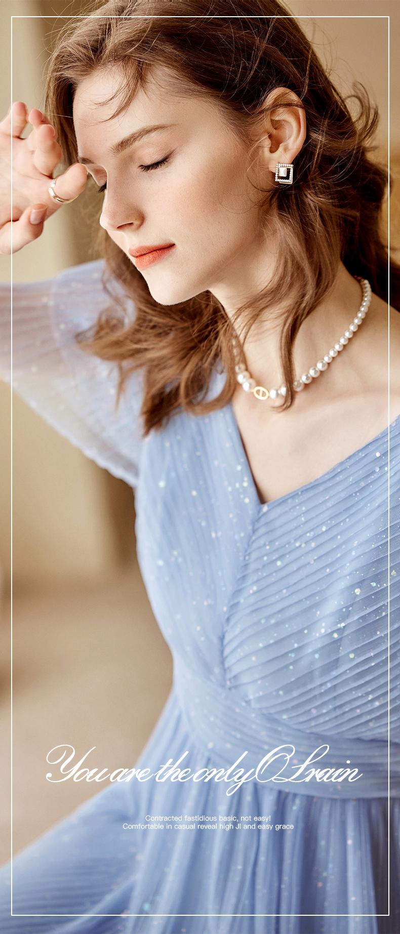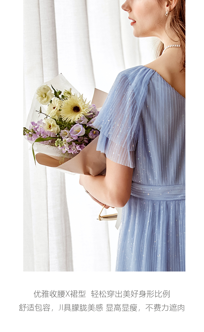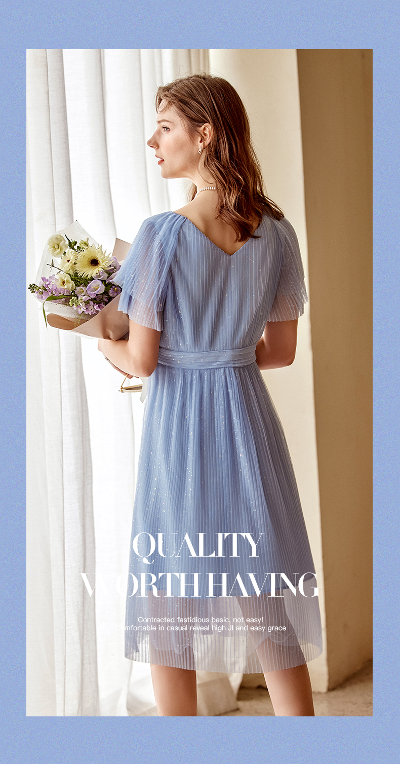 欧芮儿V领网纱连衣裙2021新款收腰显瘦优雅气质时髦超仙裙子