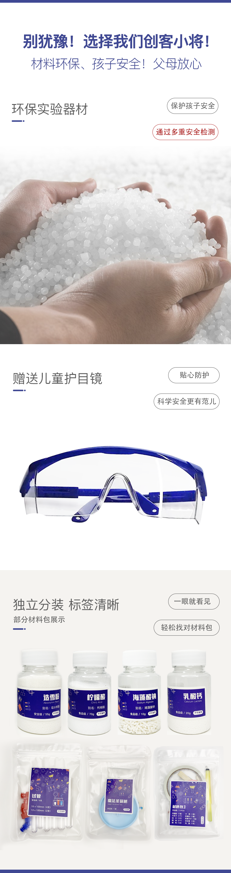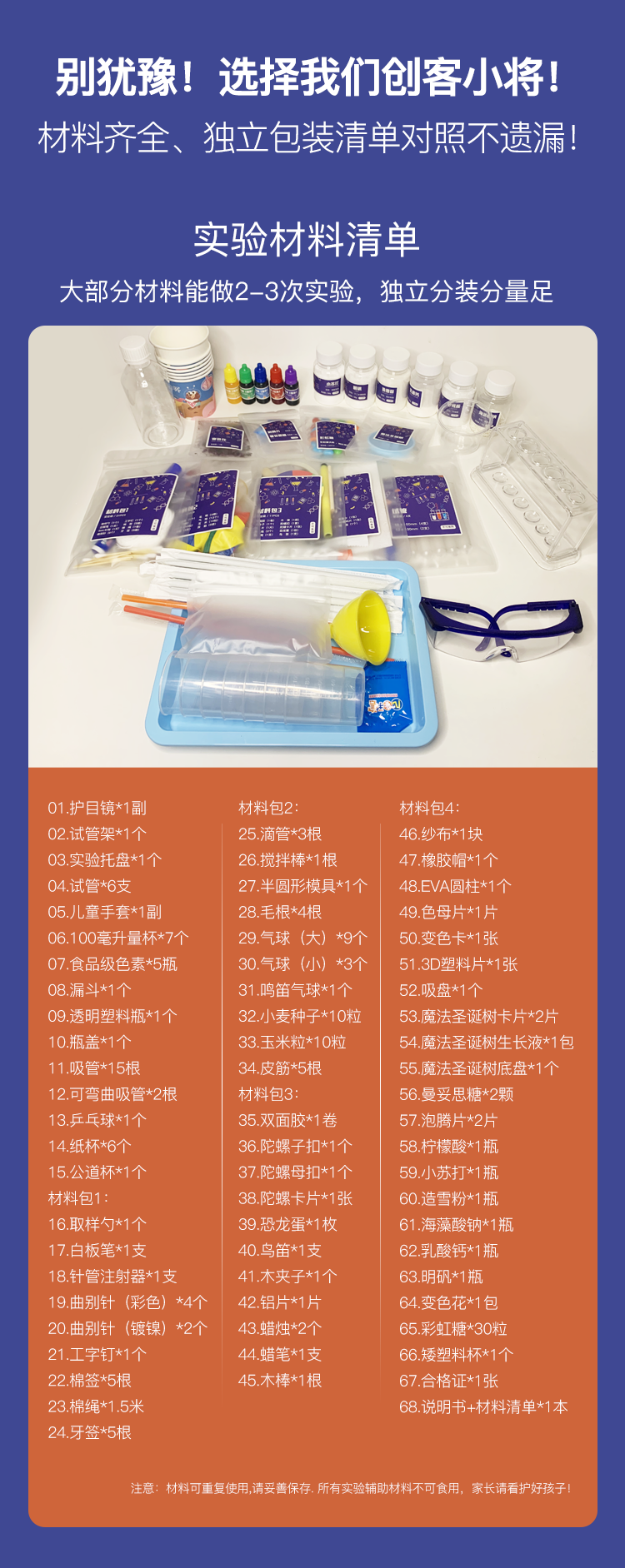礼盒内包括:护目镜*1副,试管*6支,食品级色素*5瓶,材料包*4大包,魔法圣诞树套装*1个,恐龙蛋*1个,高清彩印说明书*1本,实验讲解视频*288个等68件科学环保材料。